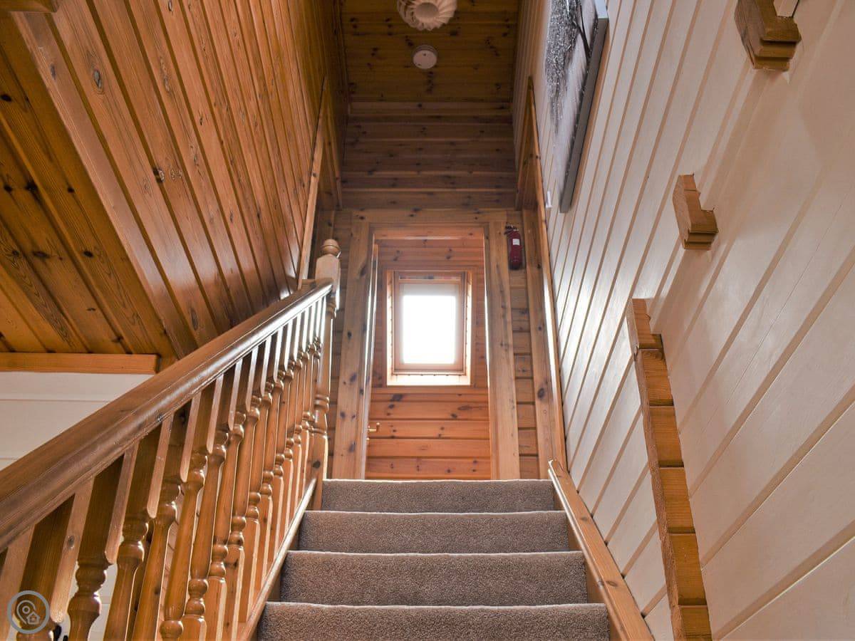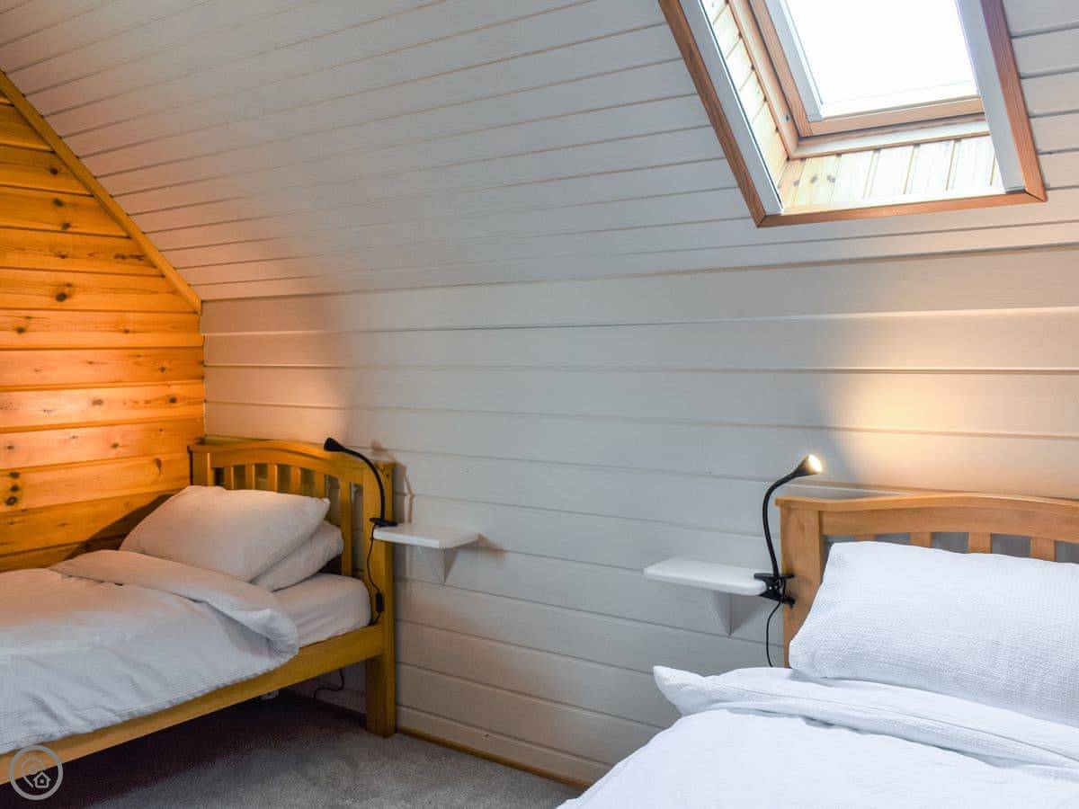 It sleeps five. Three bedrooms upstairs. One has a king bed and its own bathroom with a tub. The other two have single beds, so one room has two and the other has one. There's a second bathroom downstairs with a walk-in shower.