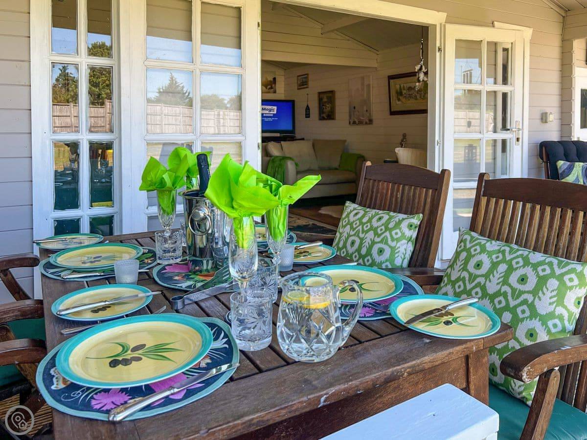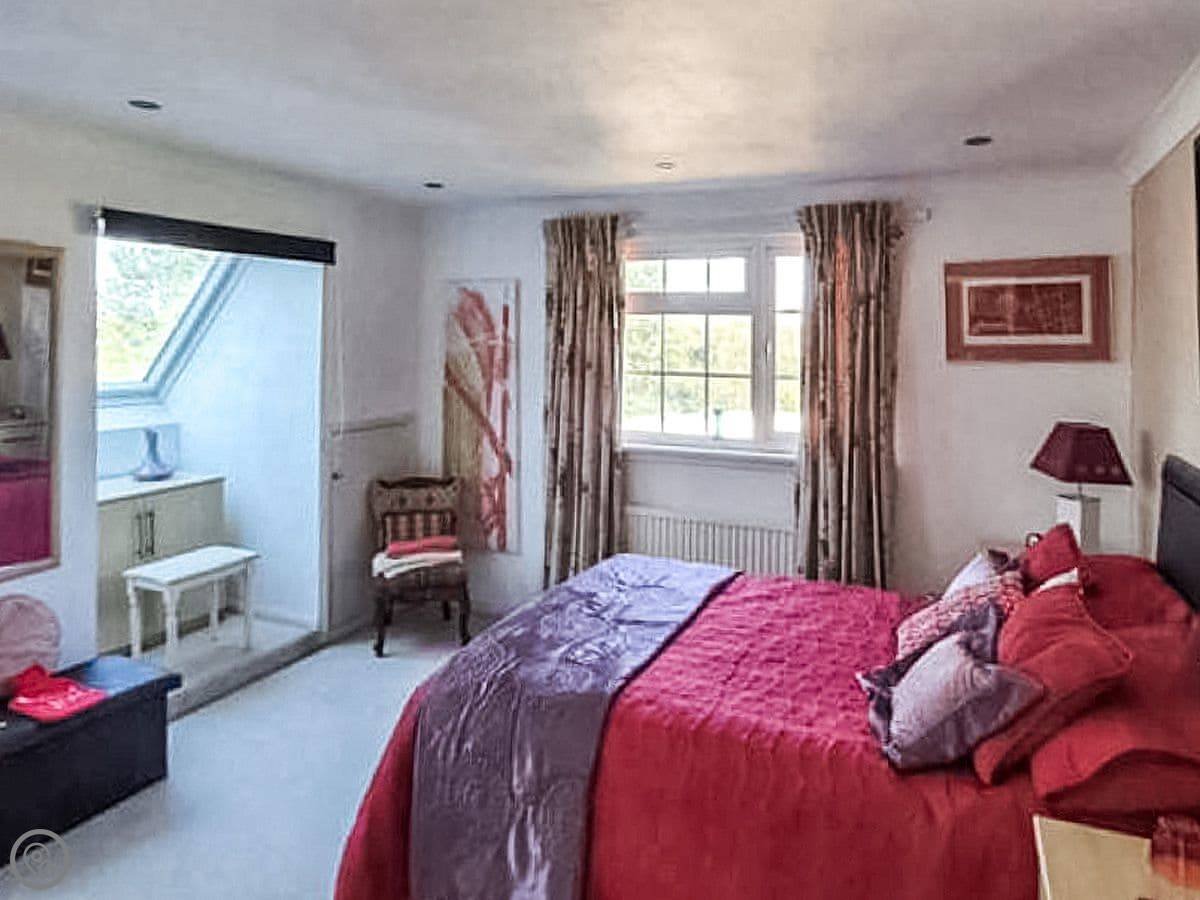 It sleeps four and has two bedrooms, both with king size beds, and two bathrooms. It's got a 4 Star rating. It's set up for pets more than anywhere I know. As well as the garden, you get the use of a big enclosed field nearby for two booked slots a day. There are dog beds, towels, crates, and even an outside dog shower.