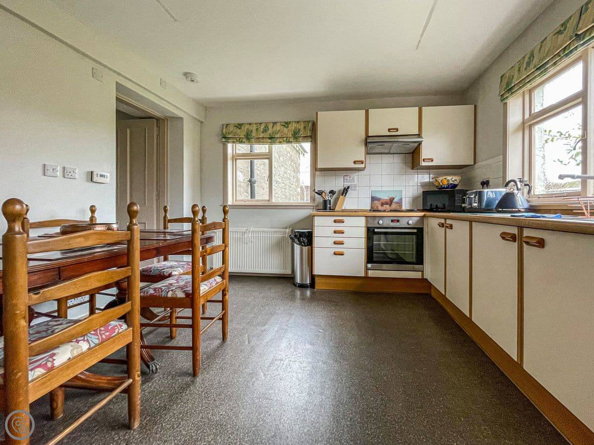 You come in through a side door into a utility room. It's good for boots and wet coats. There's an open fire in the living room. We leave wood and coal for it. The kitchen has a dishwasher and a washing machine.