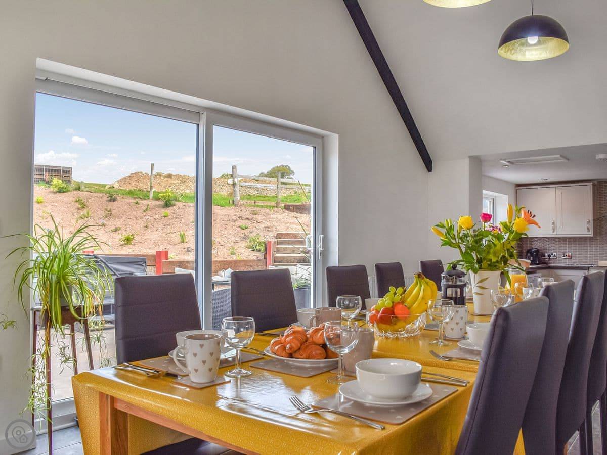 The cottage sleeps ten. Five bedrooms, four bathrooms. Two of the doubles have their own ensuite showers. It's got a 4 Star rating, so it's comfortable and well-equipped. The layout is a bit split-level, so there are a couple of steps down from the dining area to the living room.