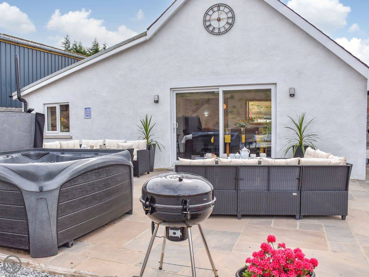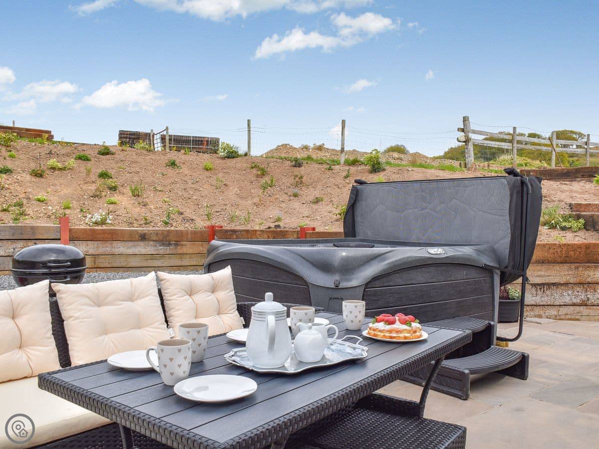 Outside there's a large patio with seating, a barbecue, and a seven-person hot tub.