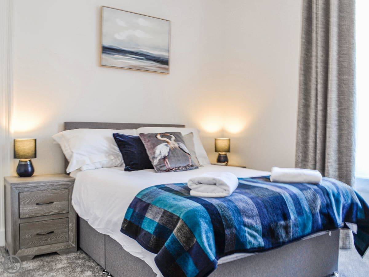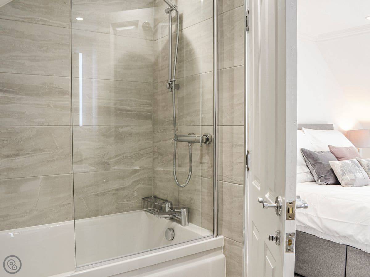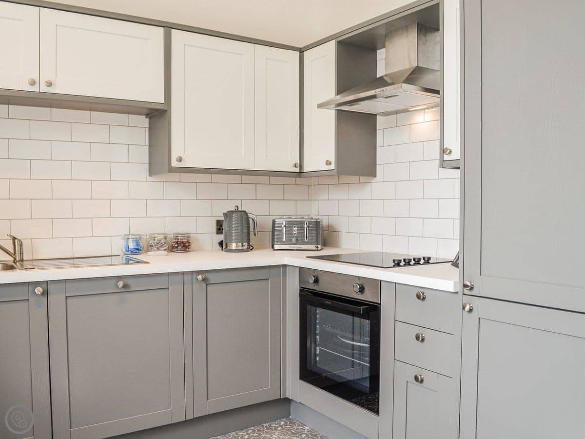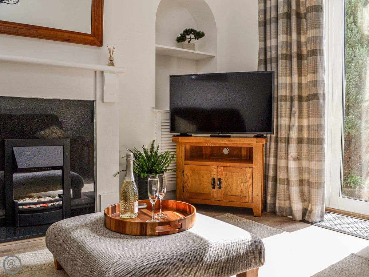 It's a two-storey townhouse that sleeps four. Two bedrooms and two bathrooms, which is handy. One bedroom is on the ground floor. The back door opens from the lounge into a shared garden. It's walled, so it's enclosed, but you share it with the neighbour.