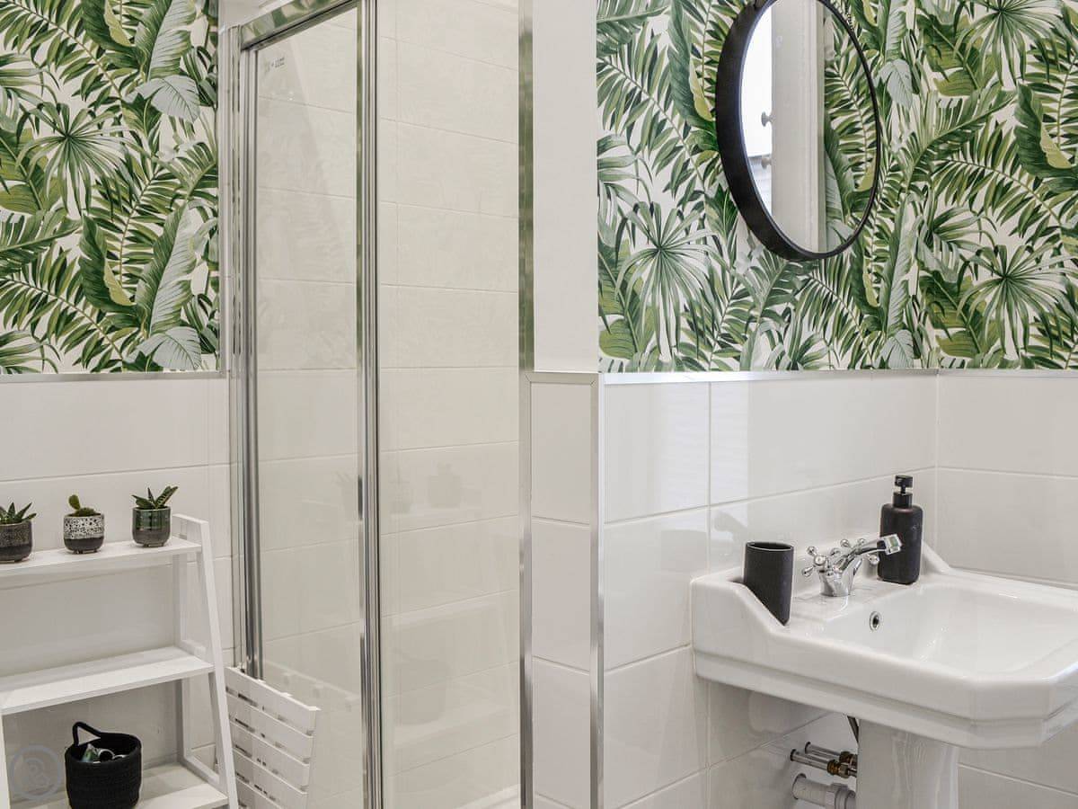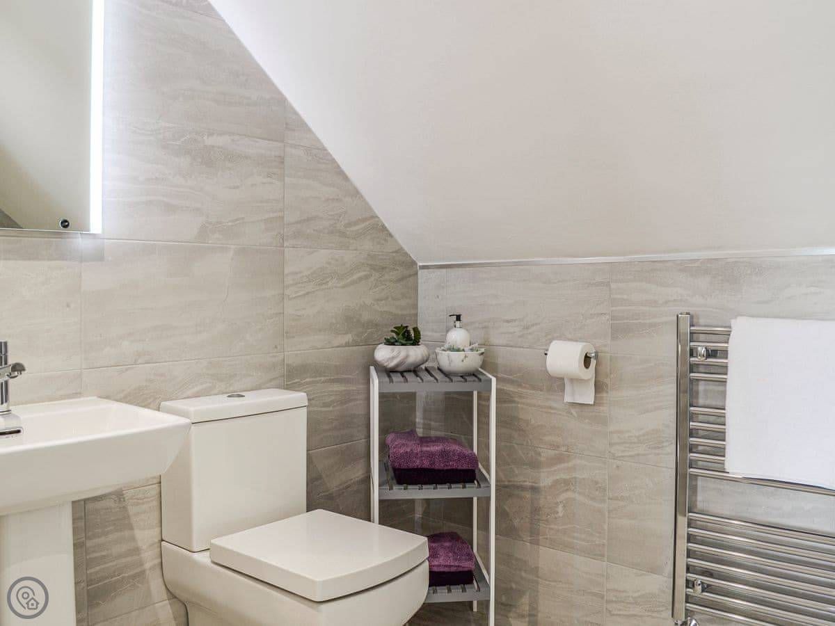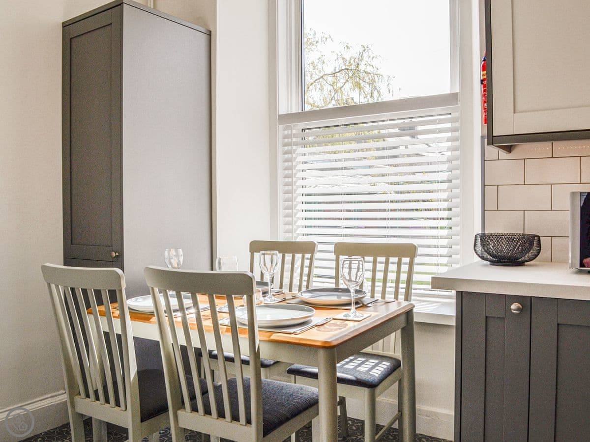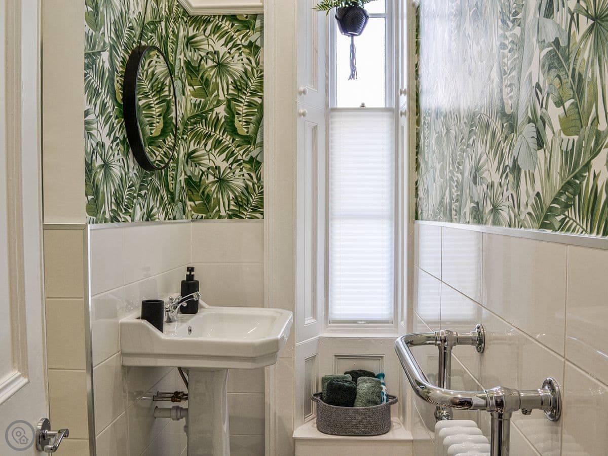 It's a two-storey townhouse that sleeps four. Two bedrooms and two bathrooms, which is handy. One bedroom is on the ground floor. The back door opens from the lounge into a shared garden. It's walled, so it's enclosed, but you share it with the neighbour.