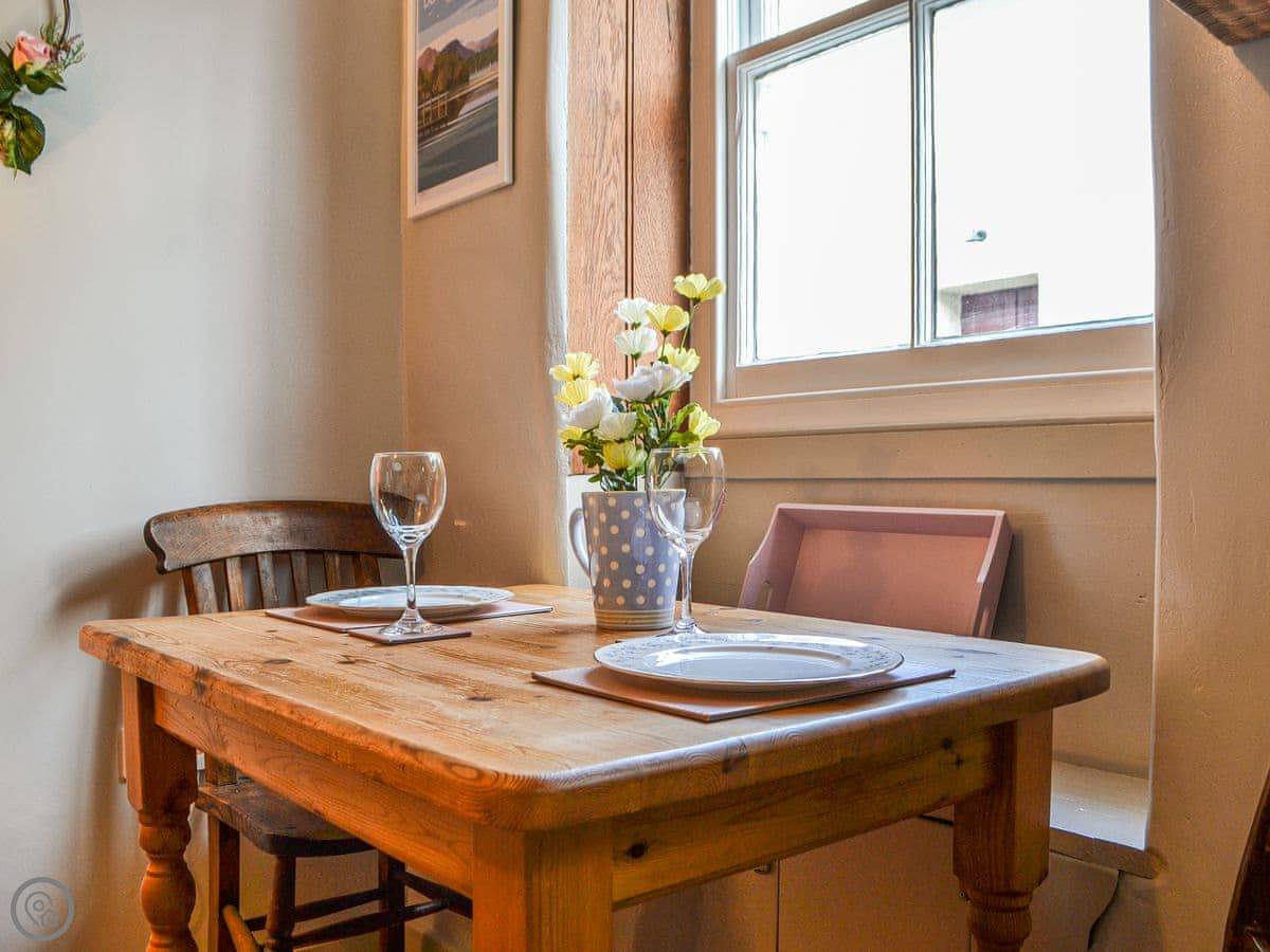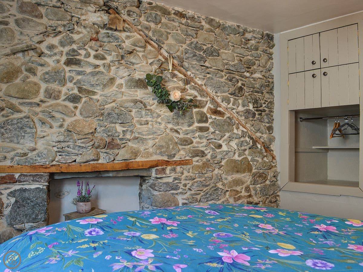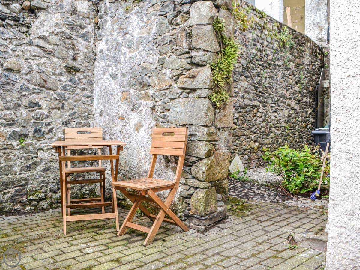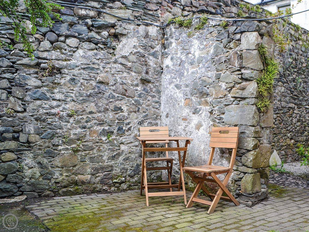 The bedroom is a decent double with exposed stone walls. The bathroom has a shower over the bath. Downstairs there's a small kitchen if you want to cook, and a table for two. There's a little seating area outside at the back.