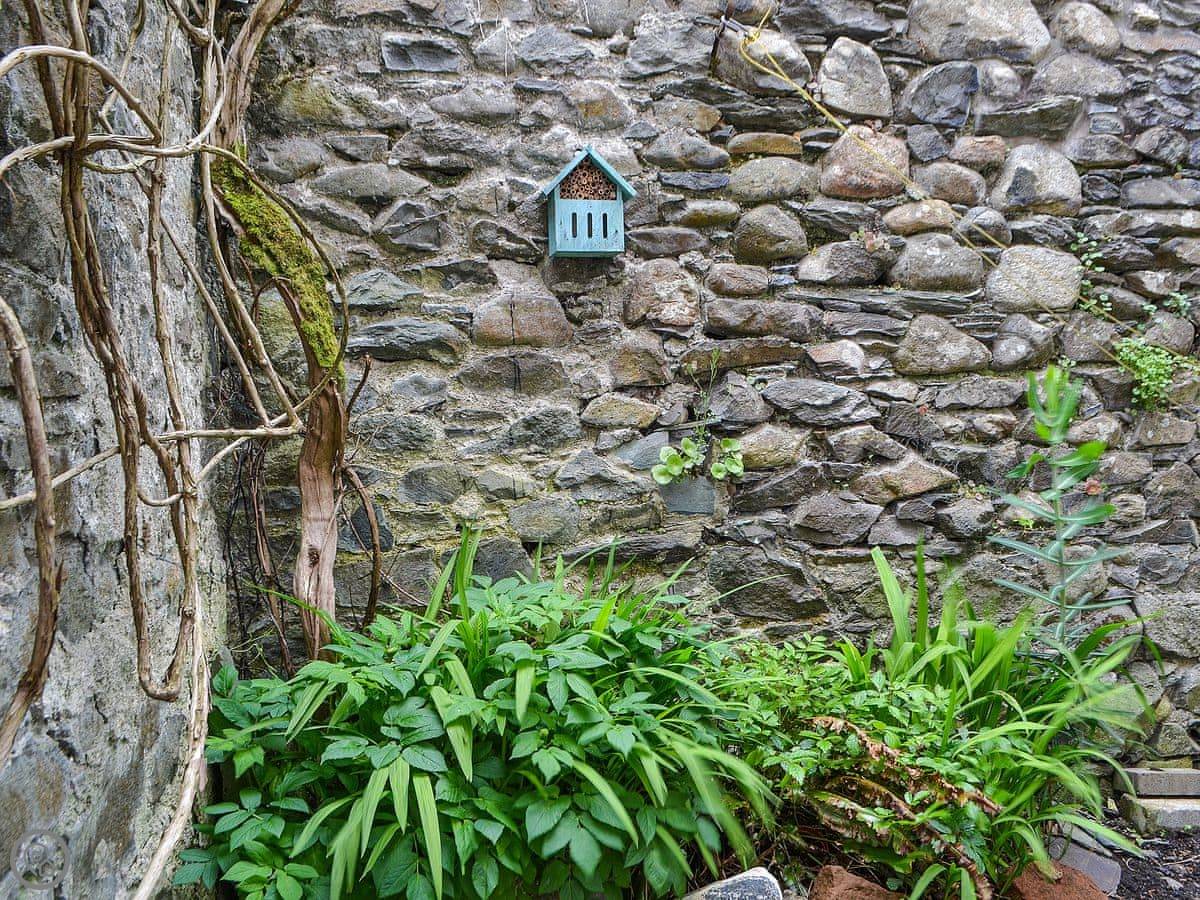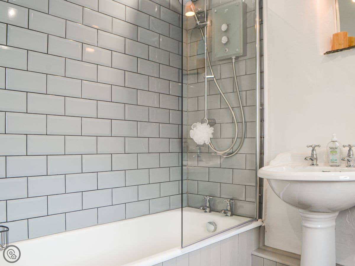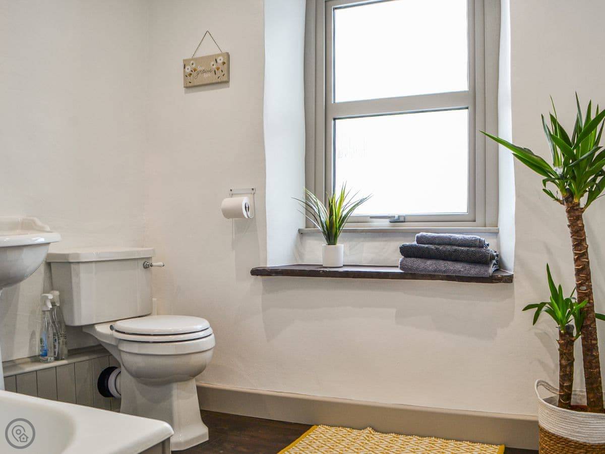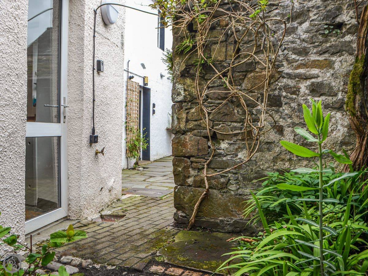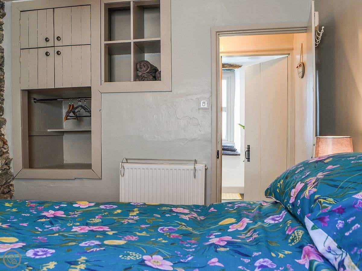 The bedroom is a decent double with exposed stone walls. The bathroom has a shower over the bath. Downstairs there's a small kitchen if you want to cook, and a table for two. There's a little seating area outside at the back.