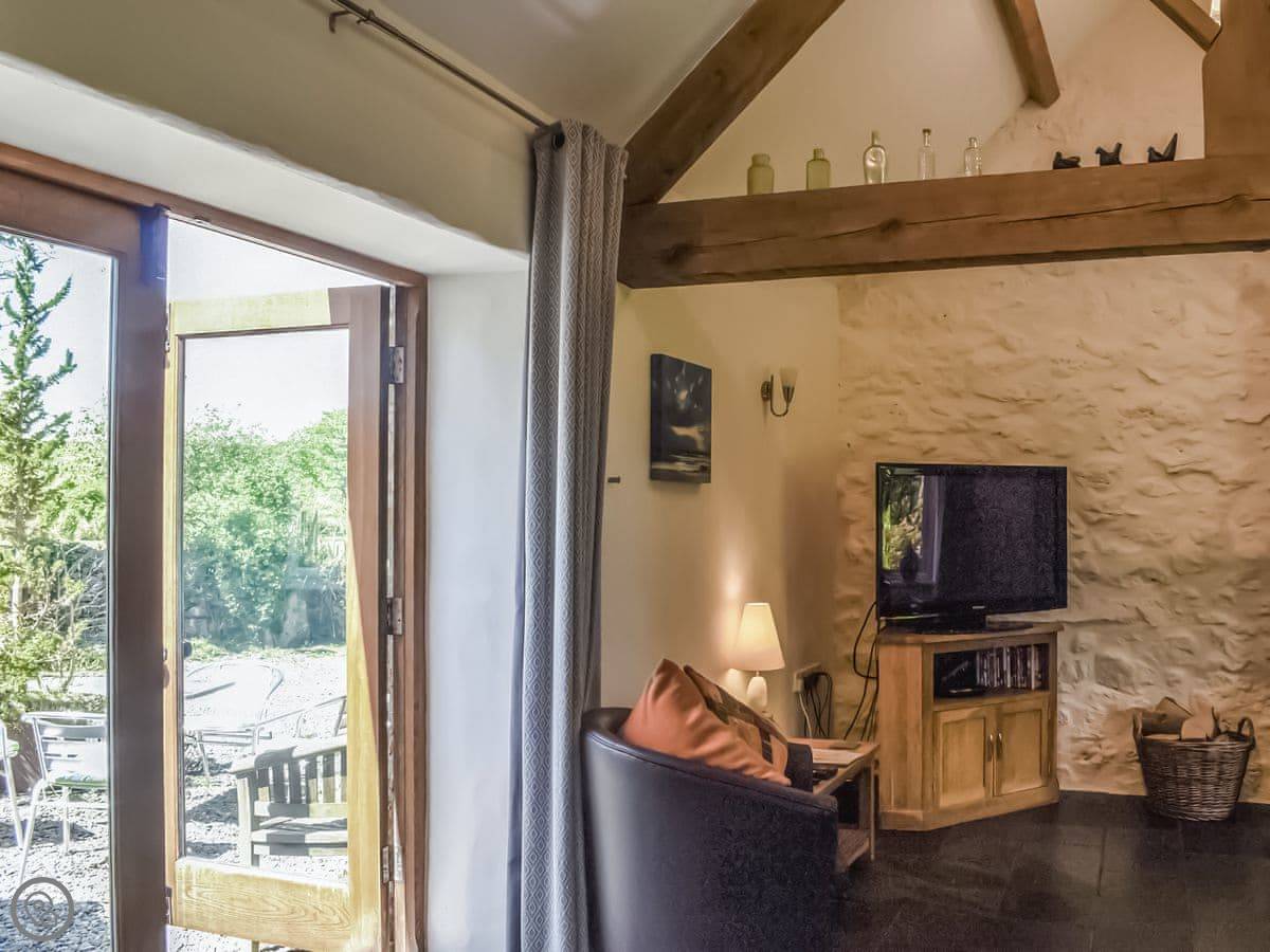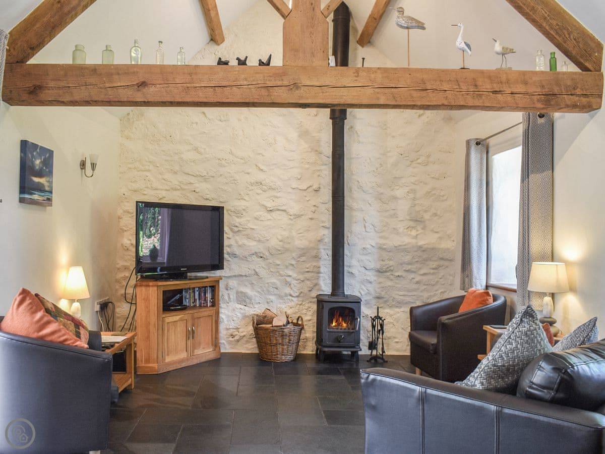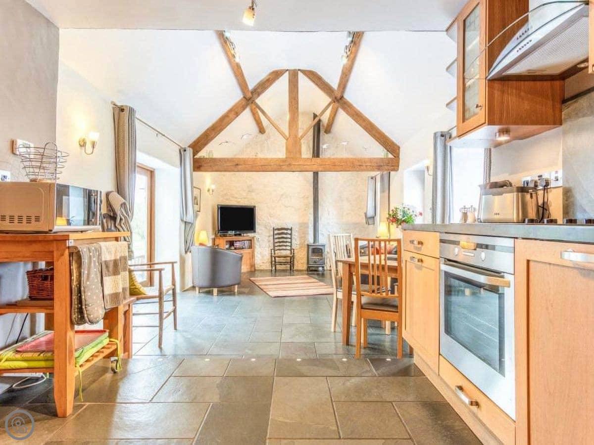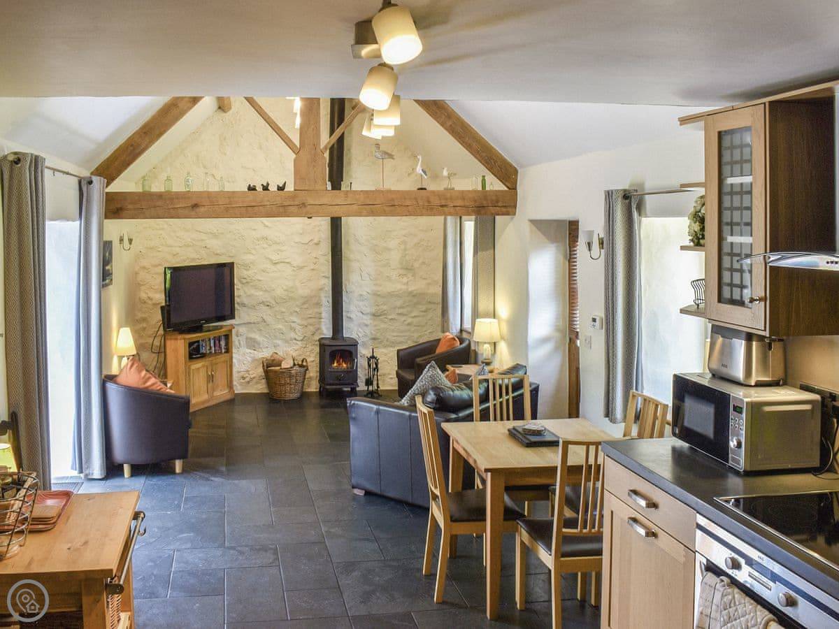 It sleeps four, two bedrooms and one bathroom. It's got a 5 Star rating. The main living space is open plan, with a wood burner. There's a kitchen, dining area and a sofa area all in one room. French doors open out to the patio.