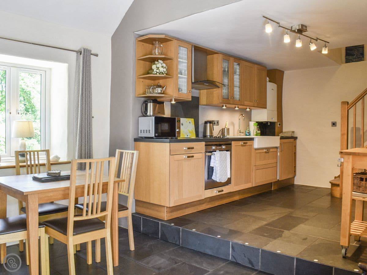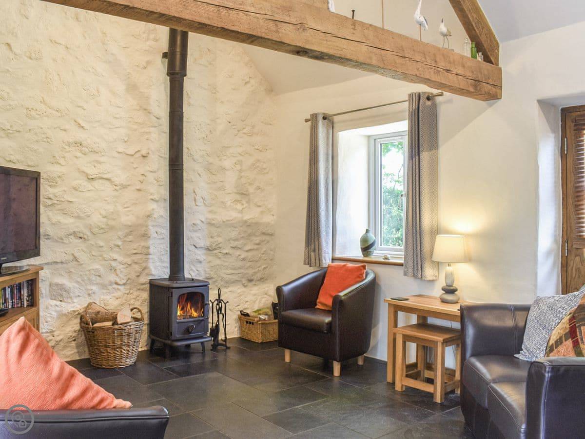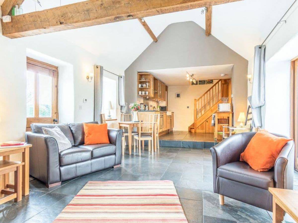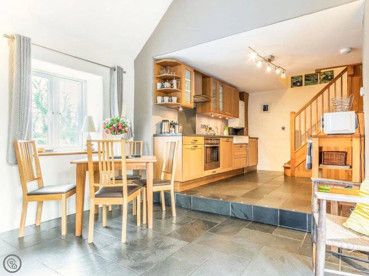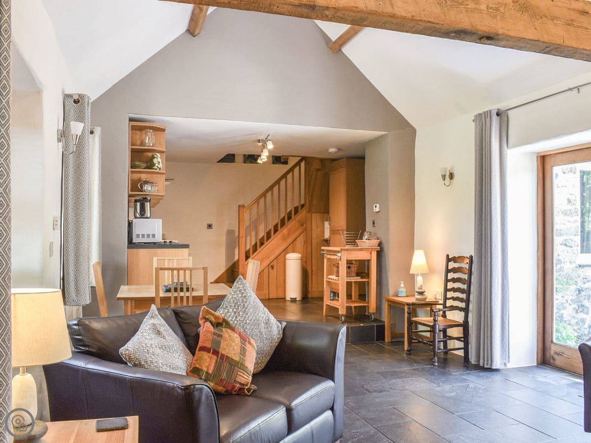 It sleeps four, two bedrooms and one bathroom. It's got a 5 Star rating. The main living space is open plan, with a wood burner. There's a kitchen, dining area and a sofa area all in one room. French doors open out to the patio.