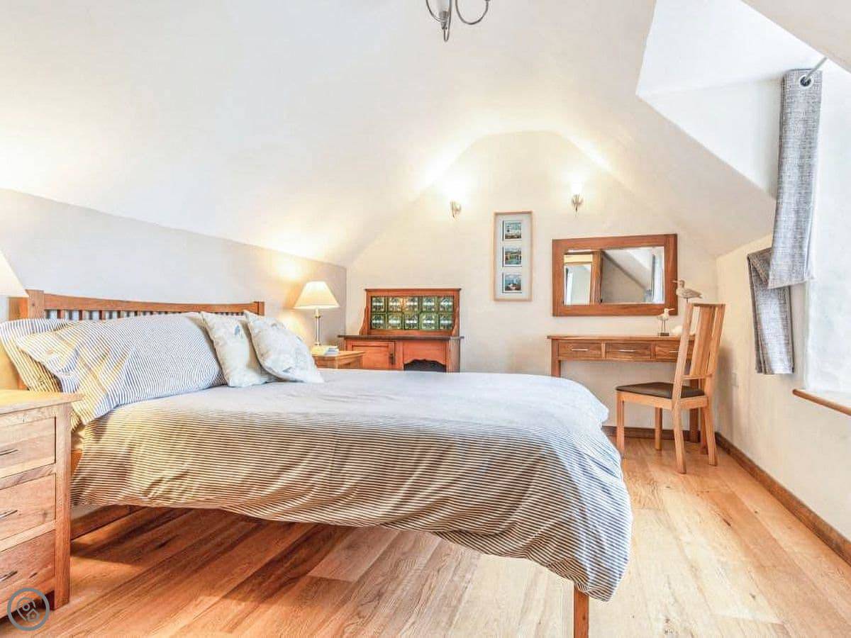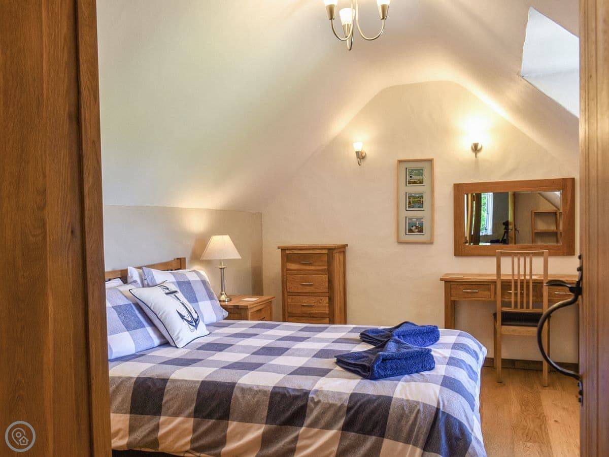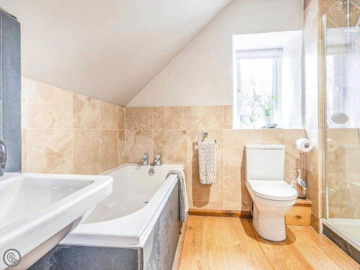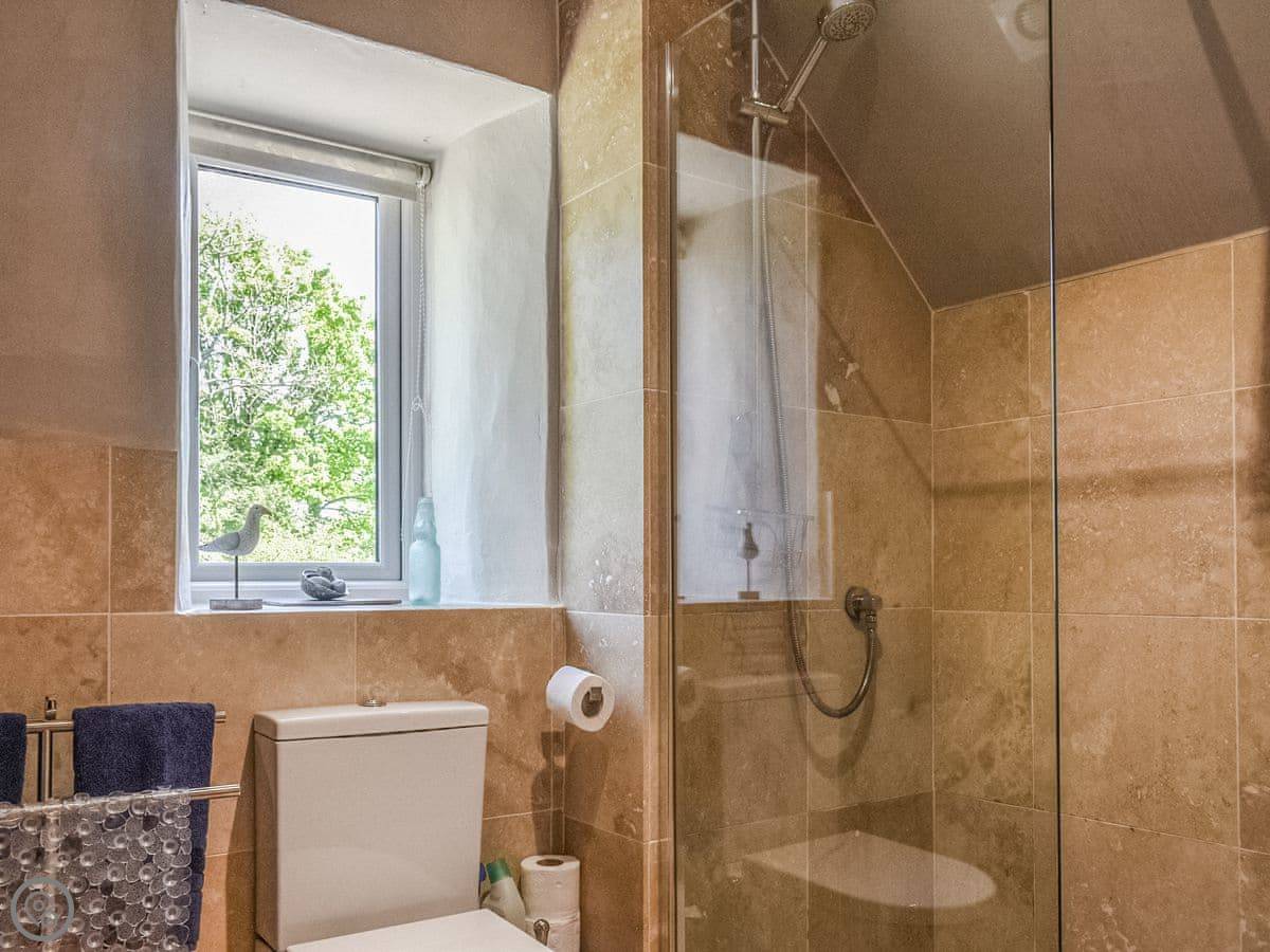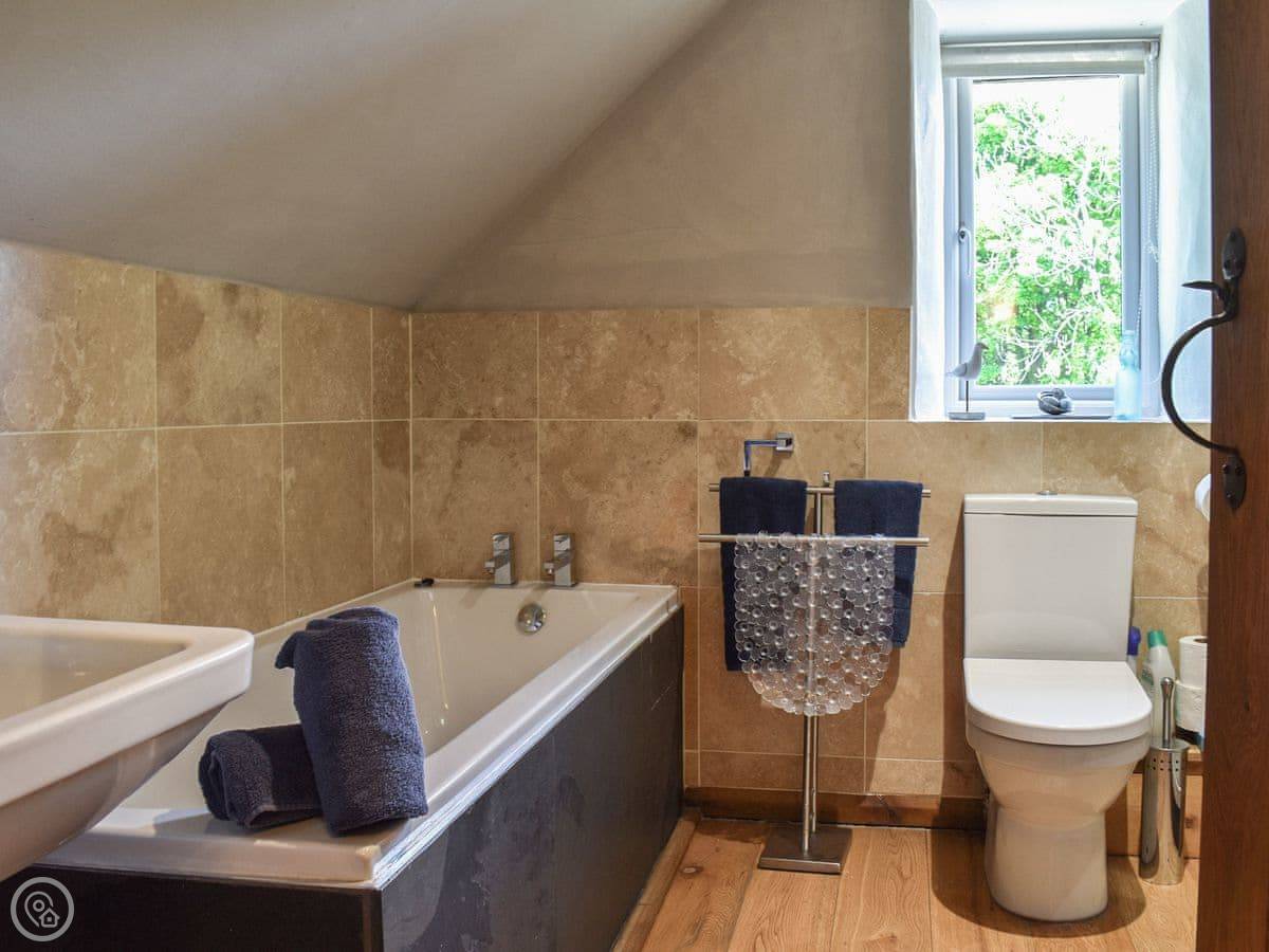 The stairs are oak and a bit bespoke, which means they're not the standard steep cottage stairs, they're quite gentle. Both bedrooms are upstairs. The bathroom has a bath and a separate walk-in shower.