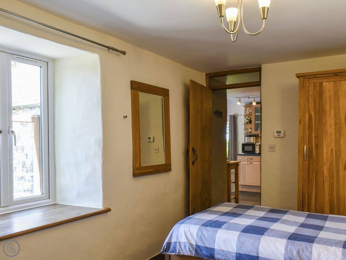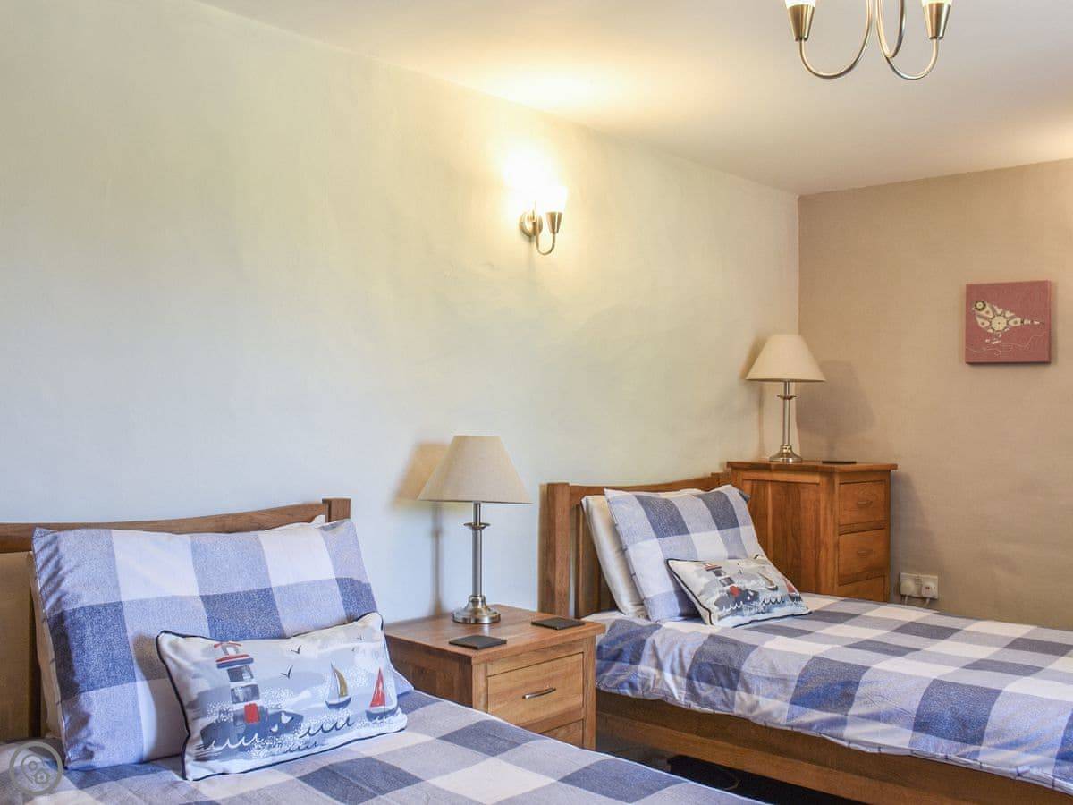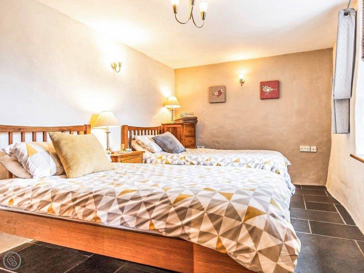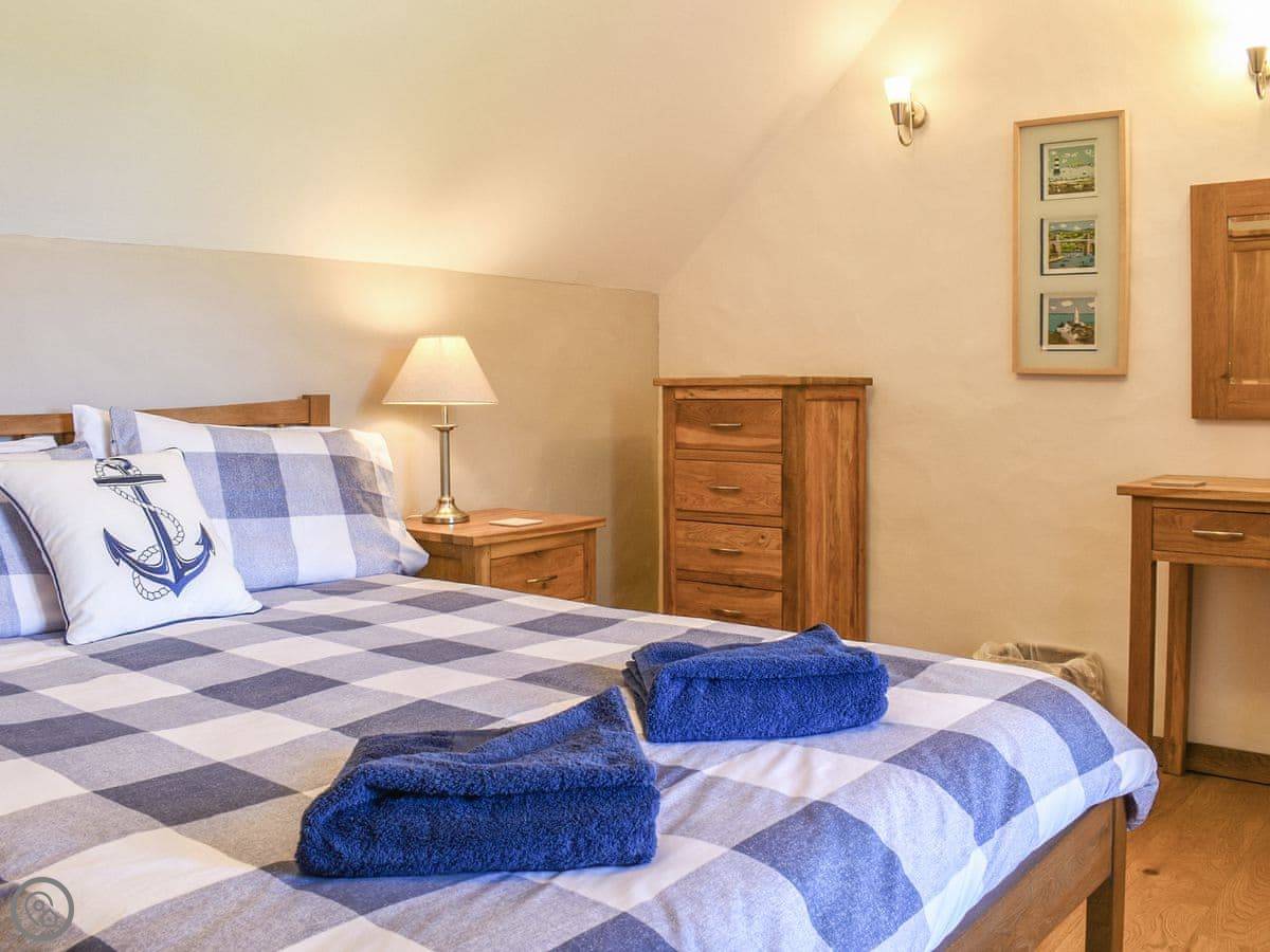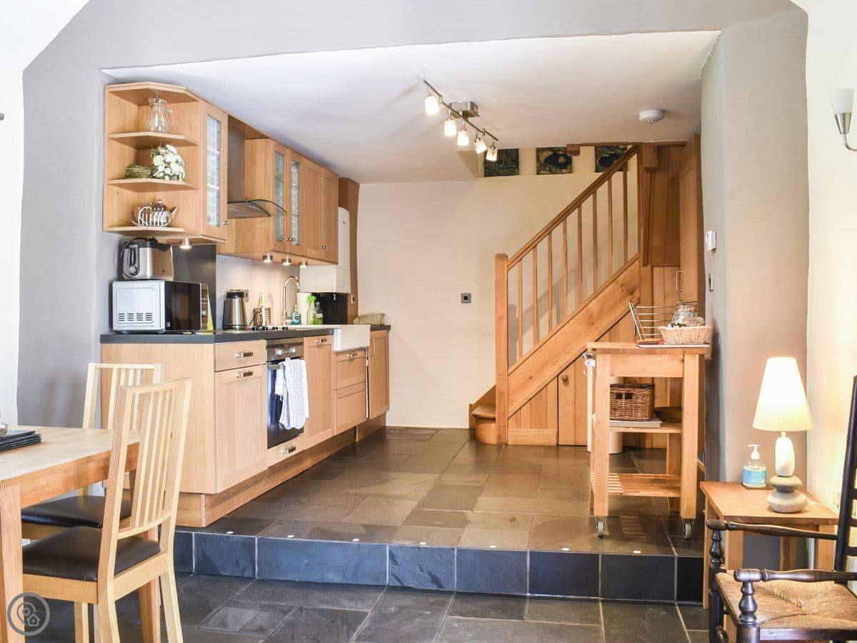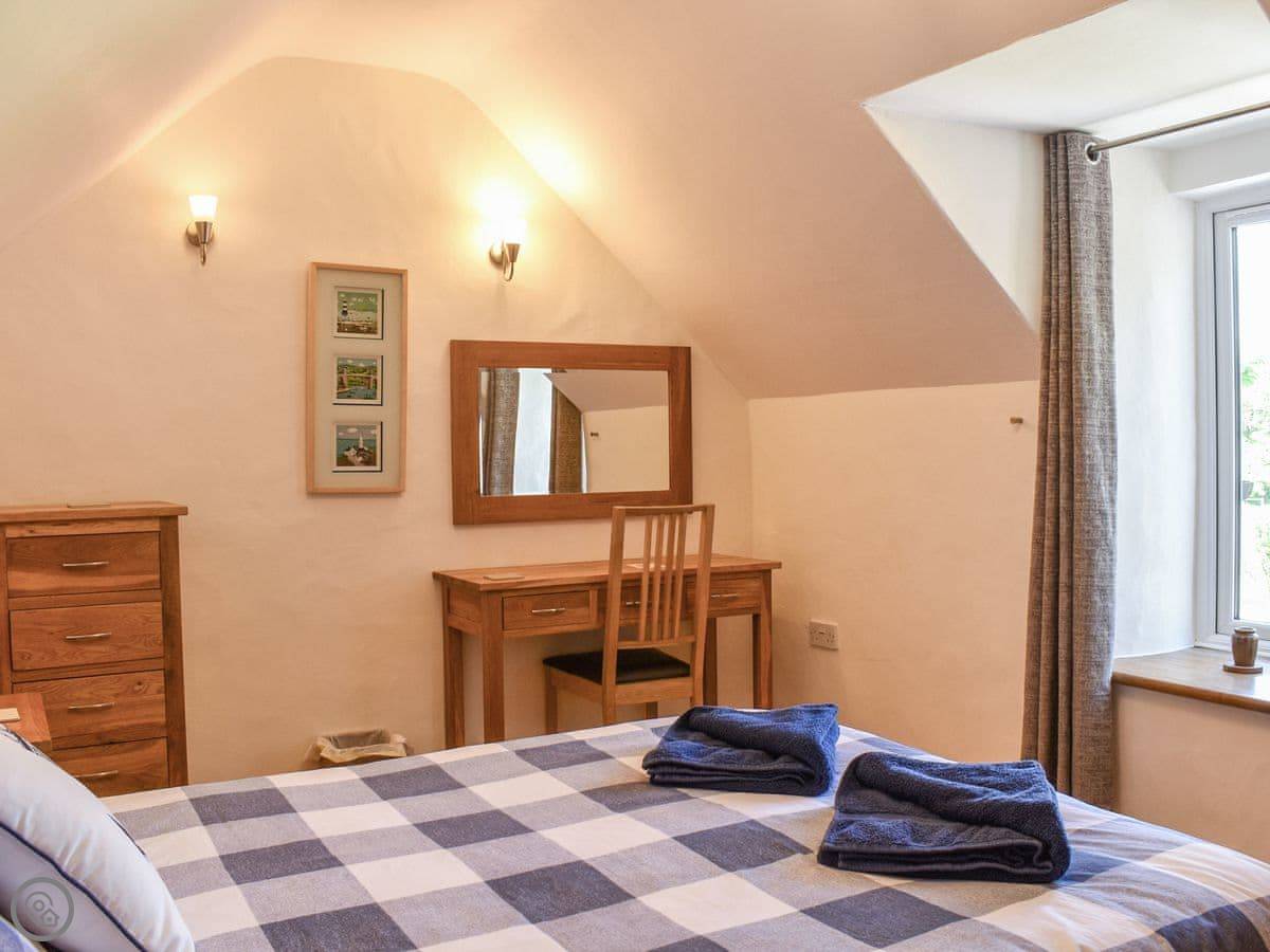 The stairs are oak and a bit bespoke, which means they're not the standard steep cottage stairs, they're quite gentle. Both bedrooms are upstairs. The bathroom has a bath and a separate walk-in shower.