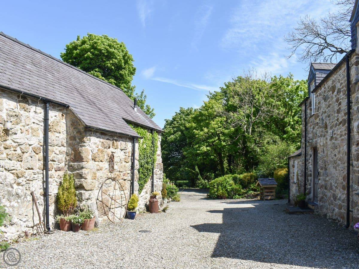 It's on a quiet country lane between Tynygongl and Marianglas. You can walk to Benllech village in about fifteen minutes. There's a shop, a couple of places to eat, and a bowling green there. The nearest beach is Benllech, which is sandy and good for swimming.