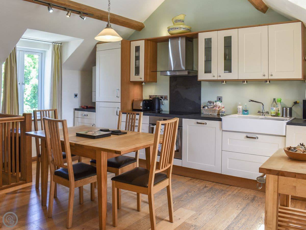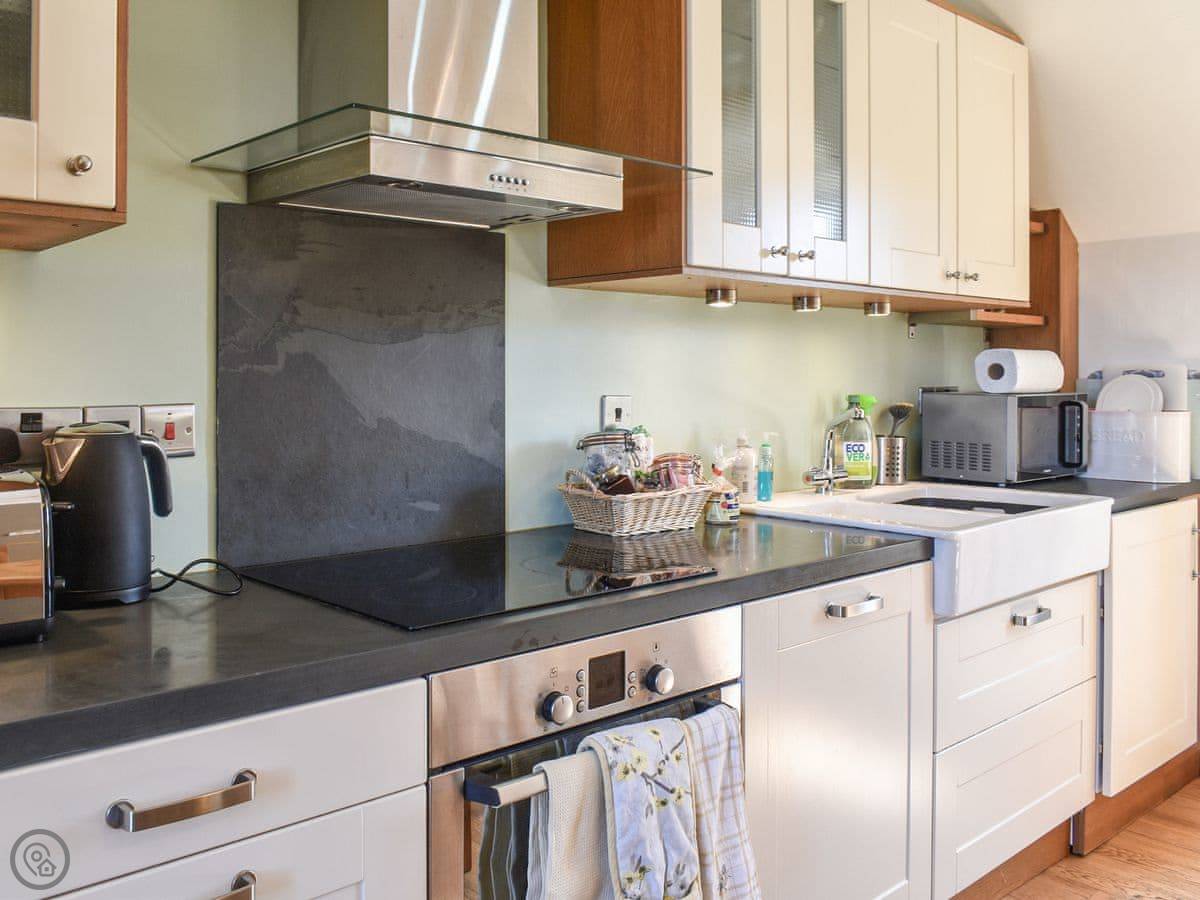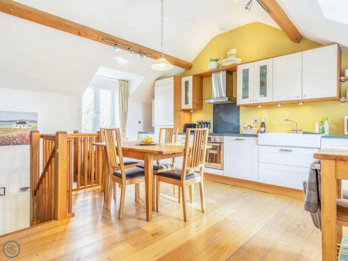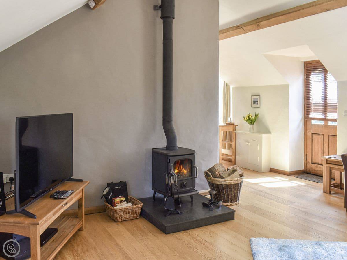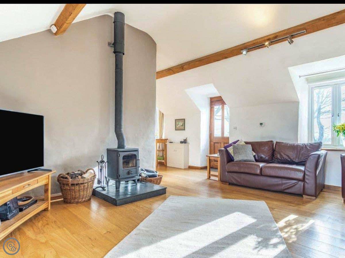 The layout is upside down to make the most of the view. You live upstairs. The kitchen, dining area, and living room are all open plan on the first floor. There's a wood burner for cooler evenings. Doors lead out to a big patio up there.