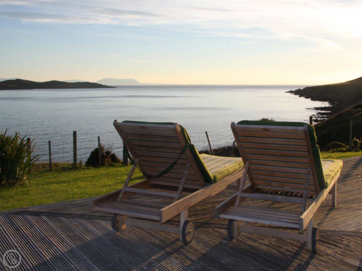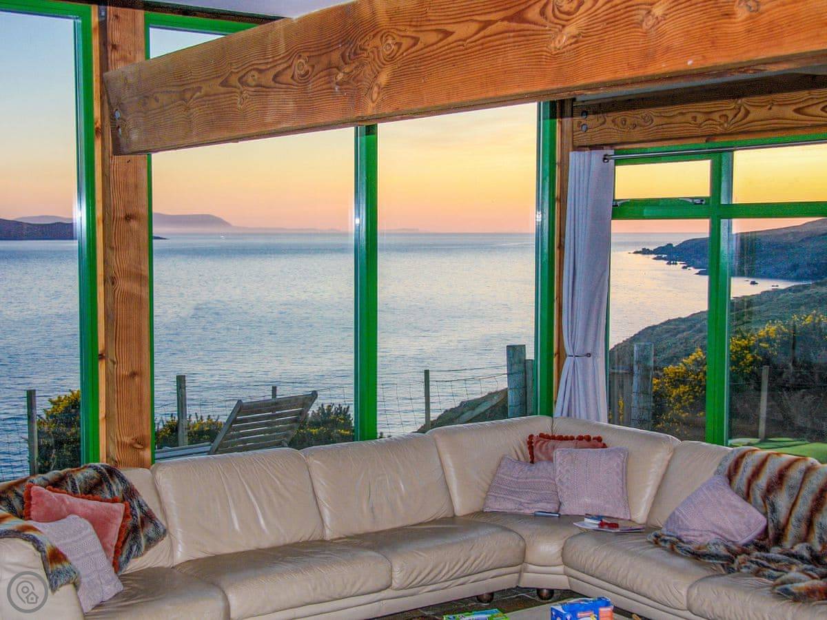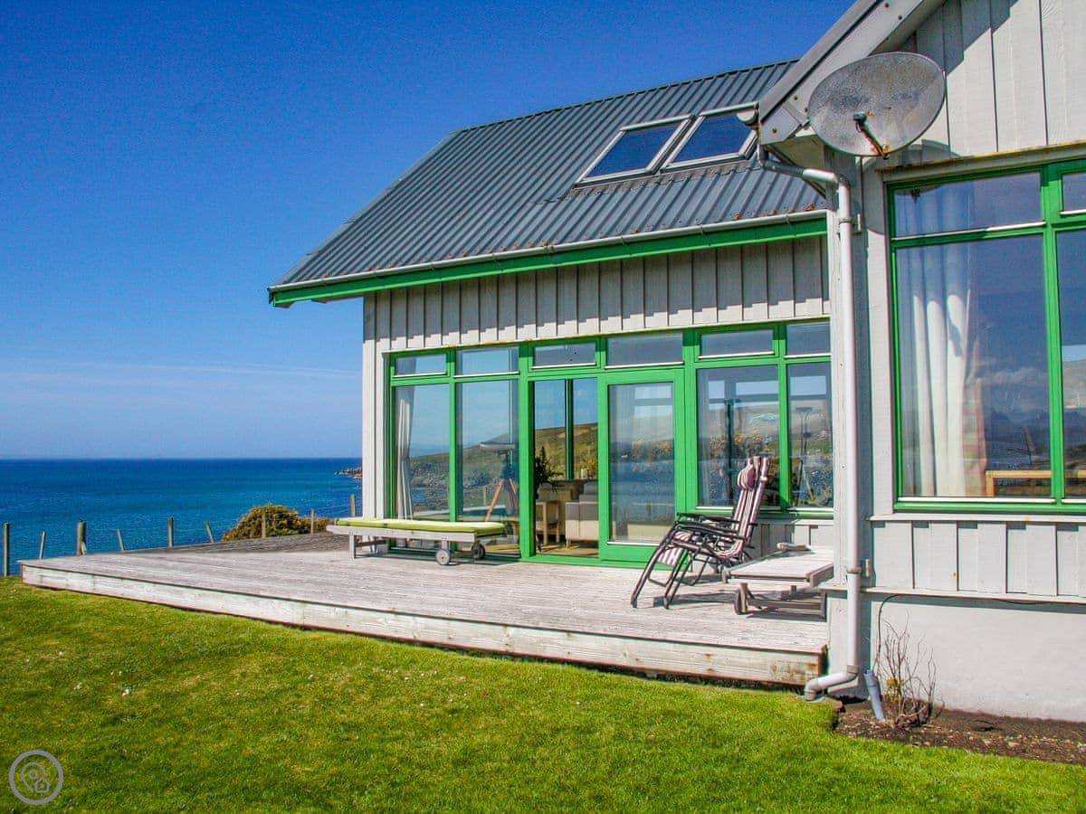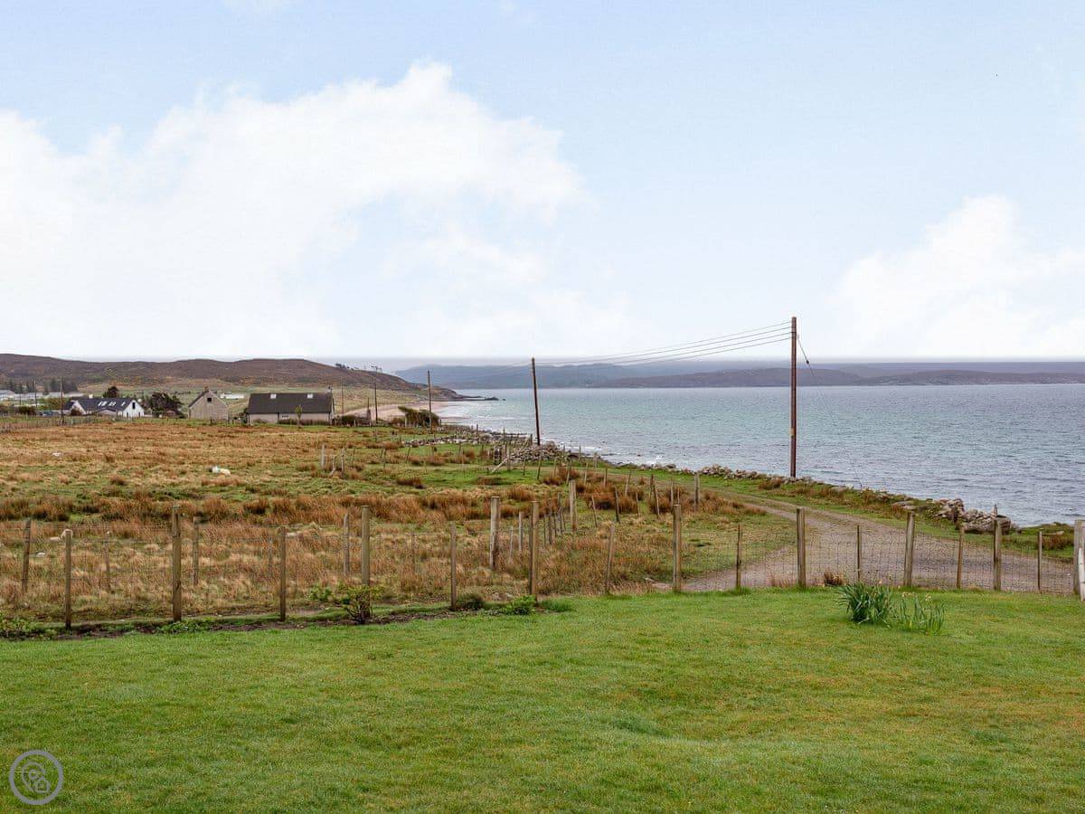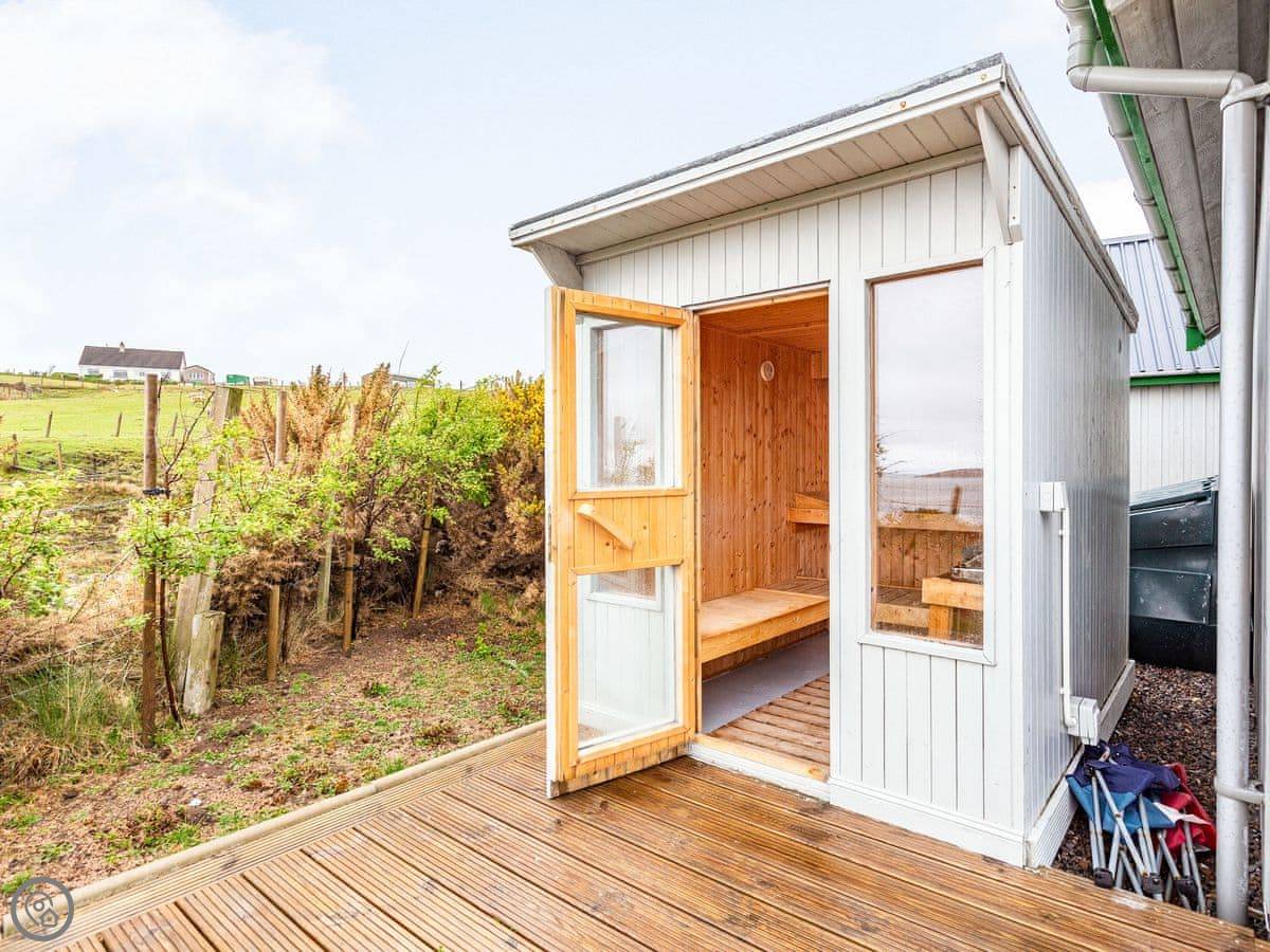 There’s a deck around the living area. Around the side is a sauna that fits six, with a sea view. The garden is lawn, good for kids to run about. A track from the garden gate leads down to the shore and Big Sand beach.