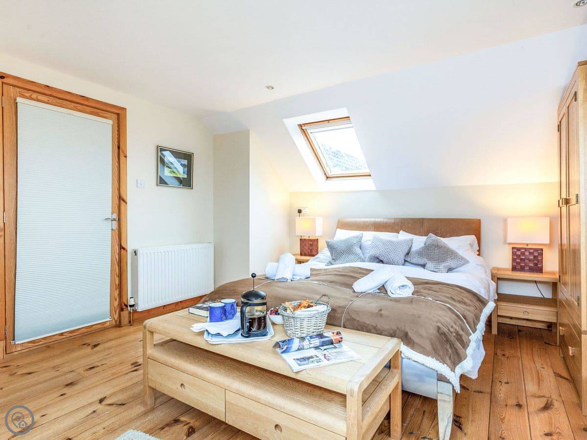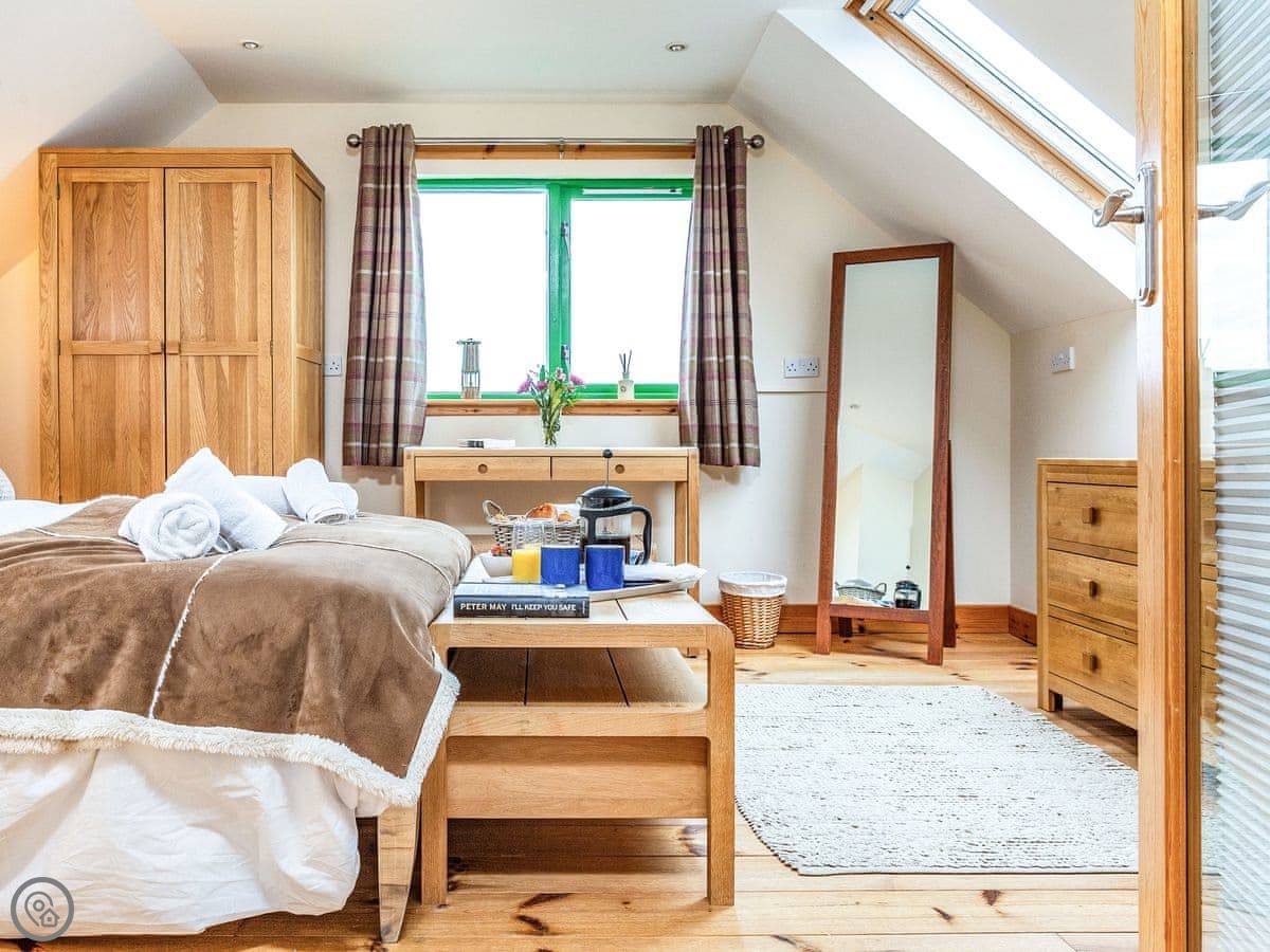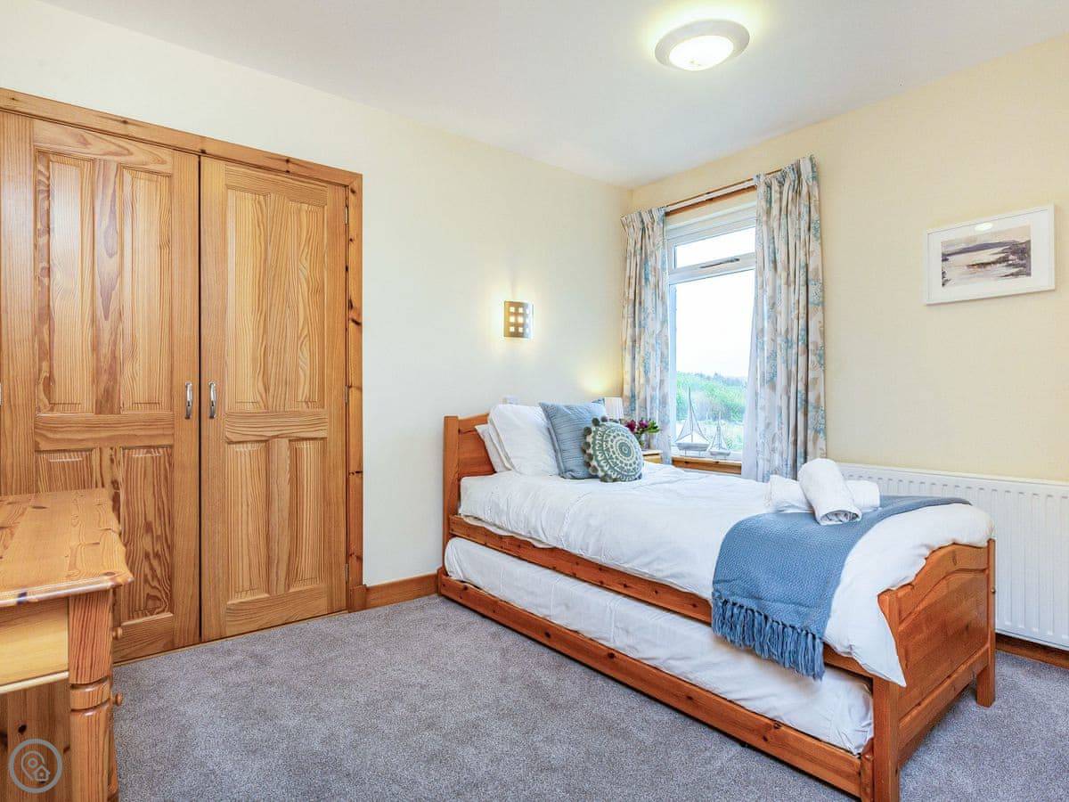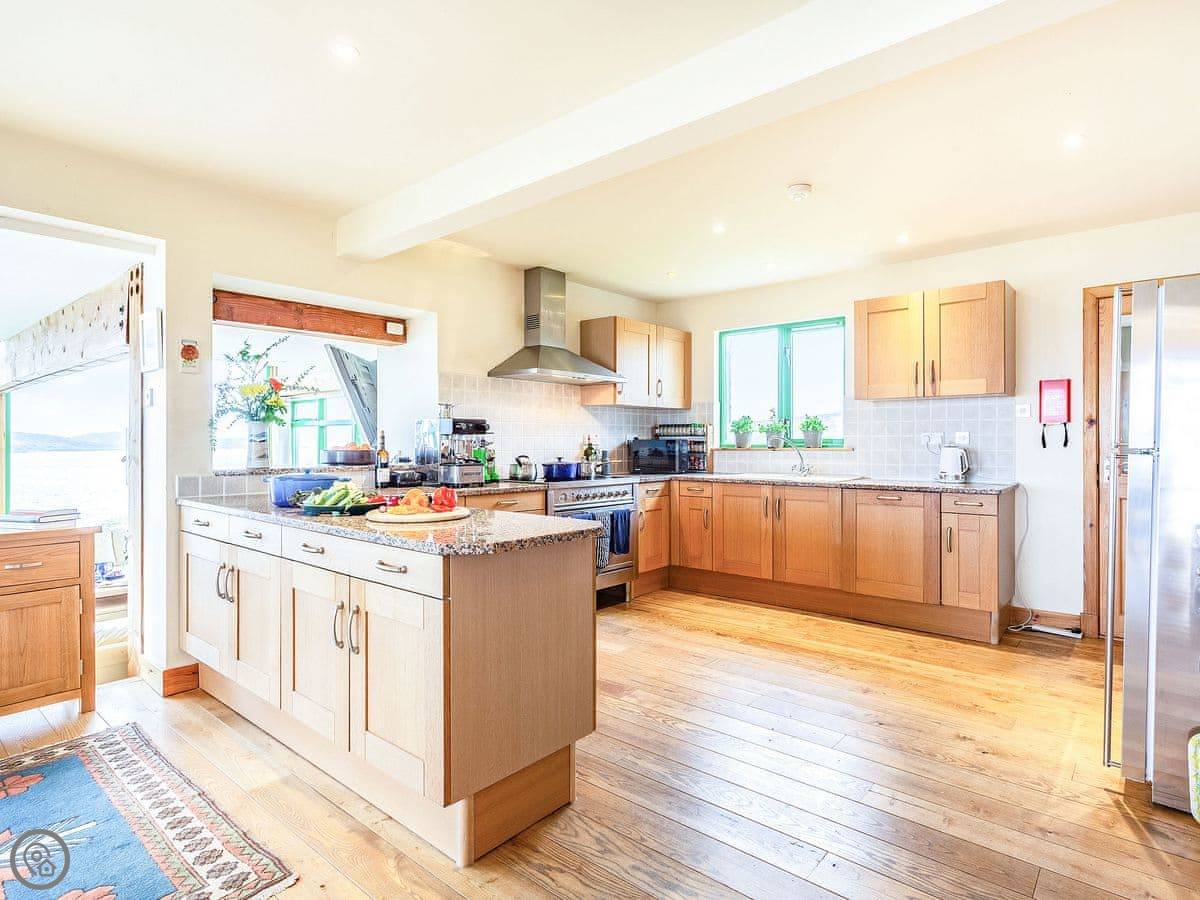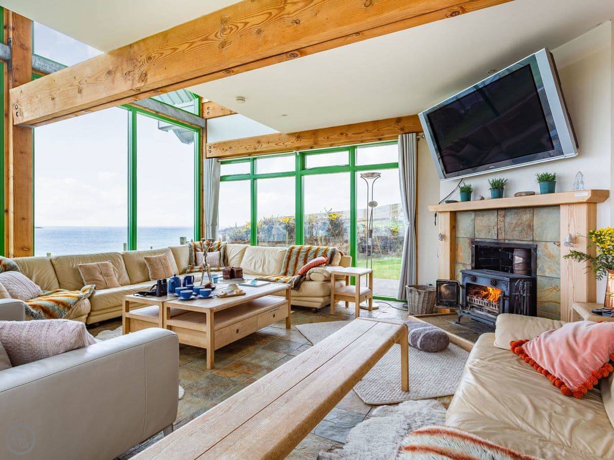 There’s a deck around the living area. Around the side is a sauna that fits six, with a sea view. The garden is lawn, good for kids to run about. A track from the garden gate leads down to the shore and Big Sand beach.