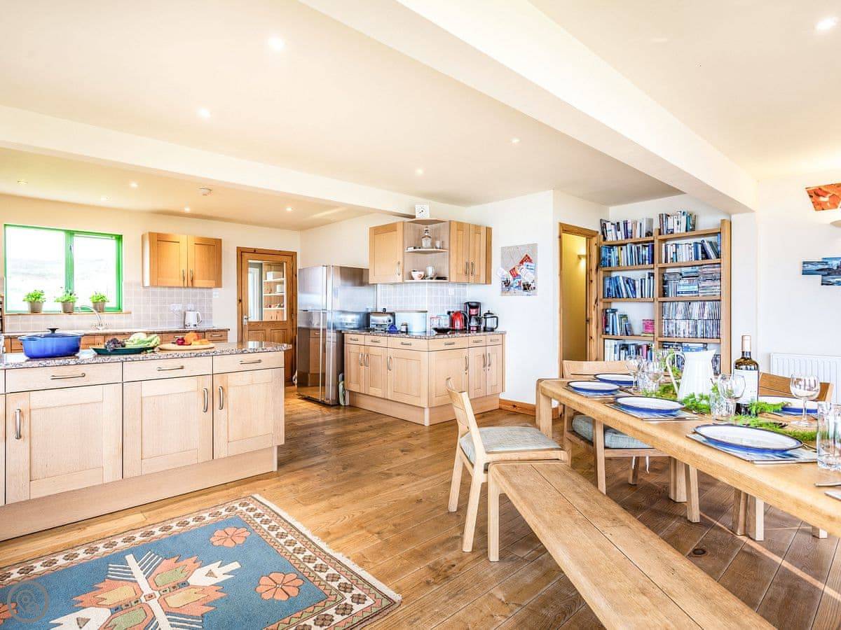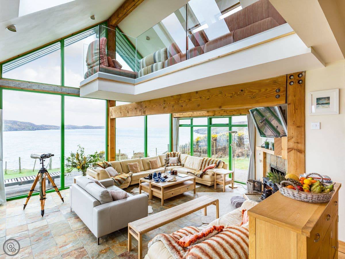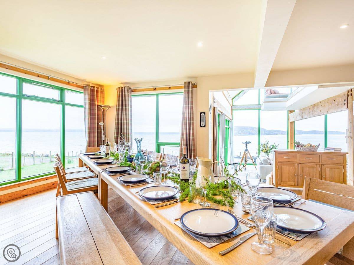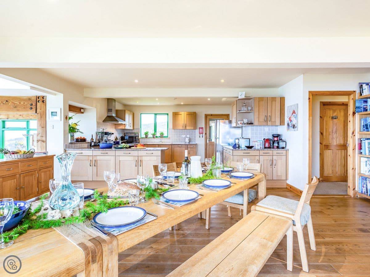 Inside, the layout works for a crowd. The back door brings you into a boot room with a washing machine, handy for wet coats and boots. Four bedrooms and two bathrooms are on the ground floor. The main space is open plan: kitchen, big dining table that seats sixteen, and a living room with those full-height windows. Upstairs are another four bedrooms and a mezzanine sitting area with more views.