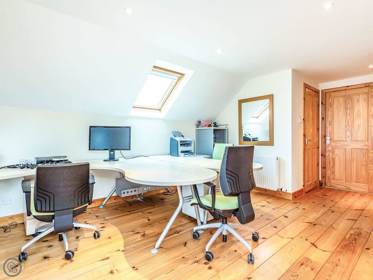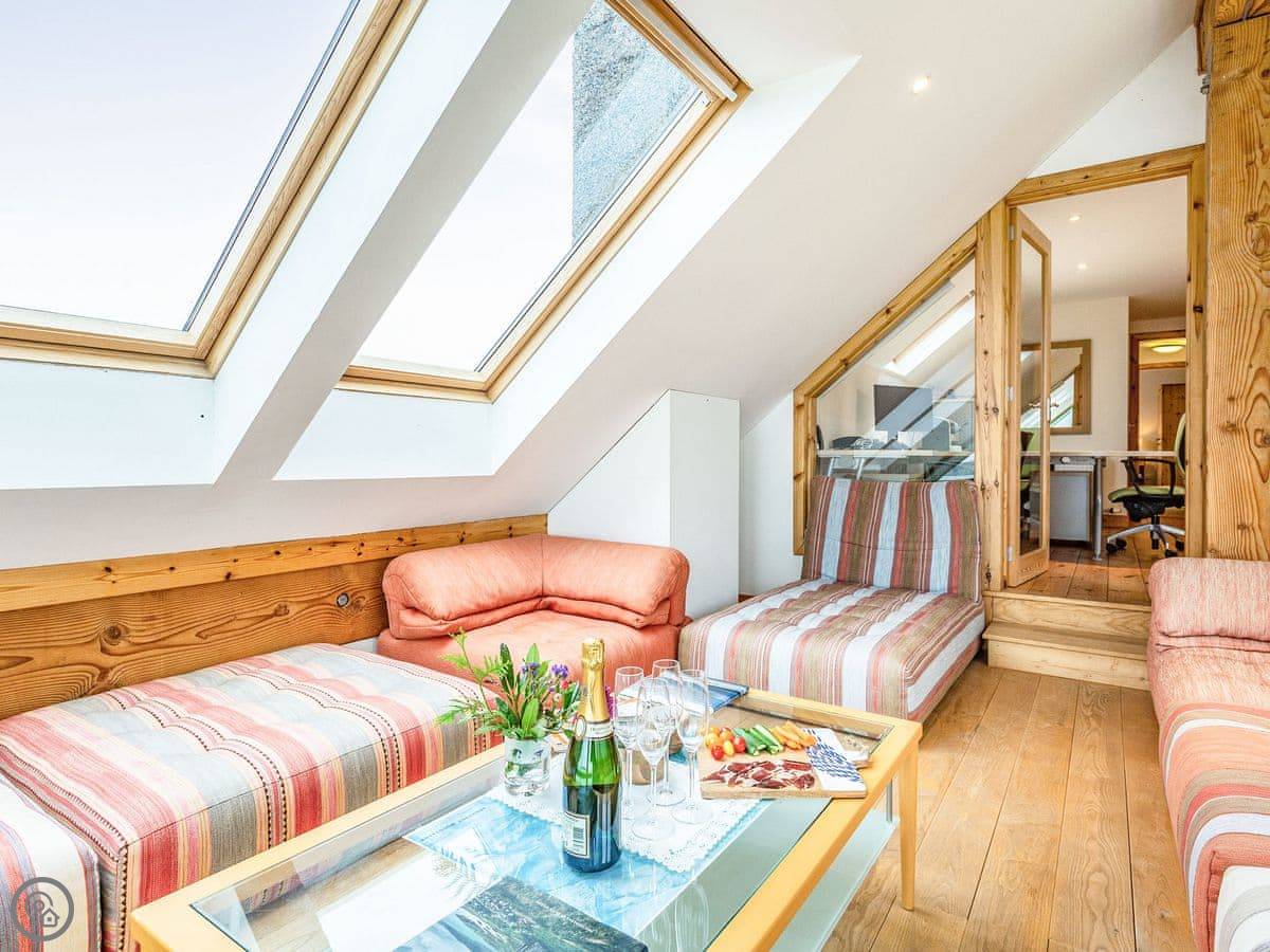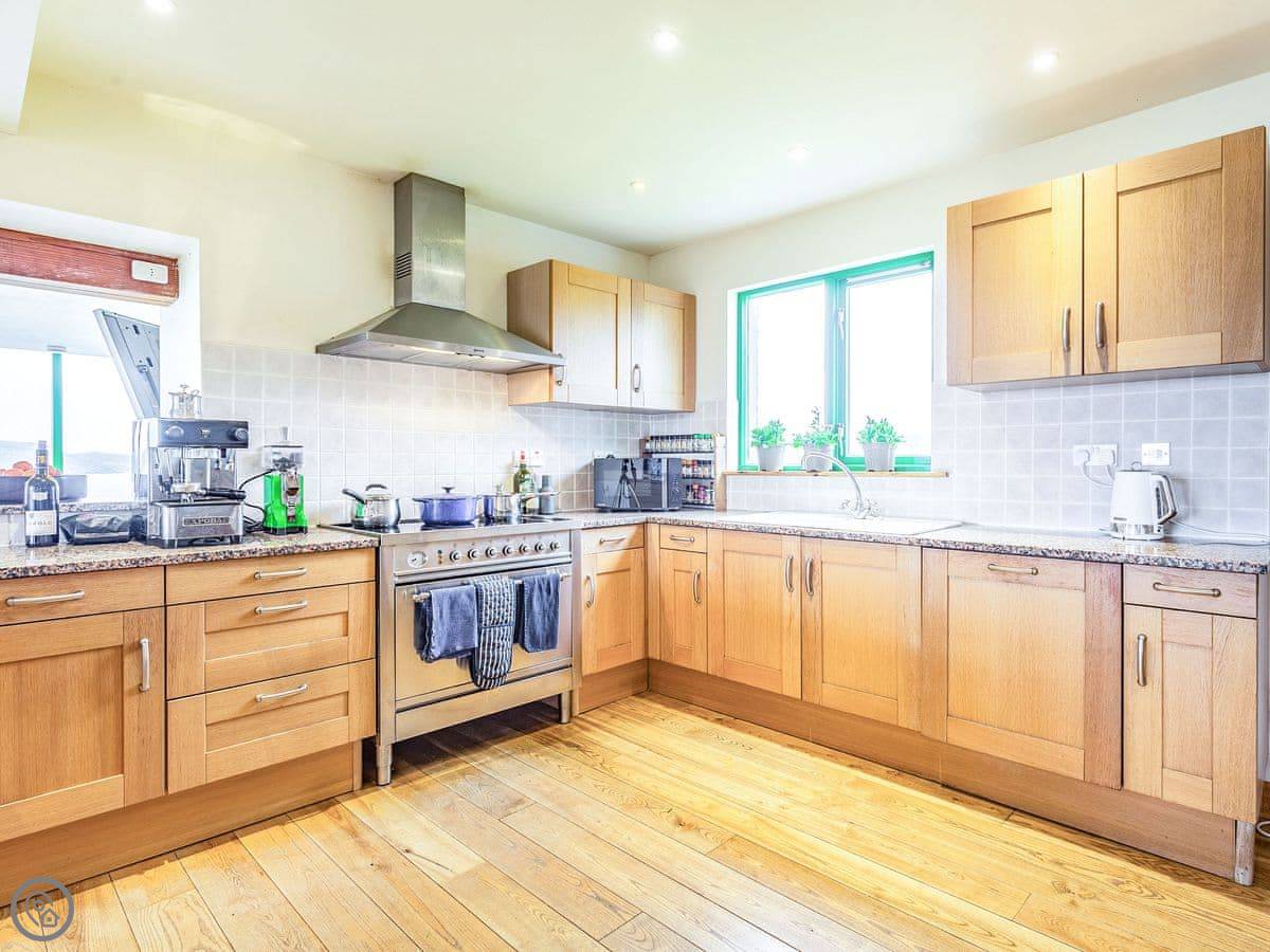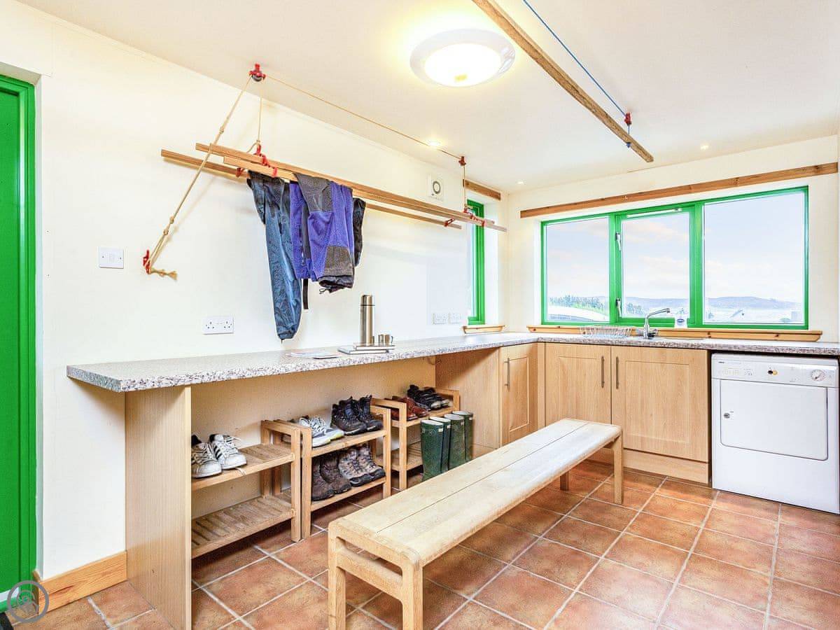 Inside, the layout works for a crowd. The back door brings you into a boot room with a washing machine, handy for wet coats and boots. Four bedrooms and two bathrooms are on the ground floor. The main space is open plan: kitchen, big dining table that seats sixteen, and a living room with those full-height windows. Upstairs are another four bedrooms and a mezzanine sitting area with more views.