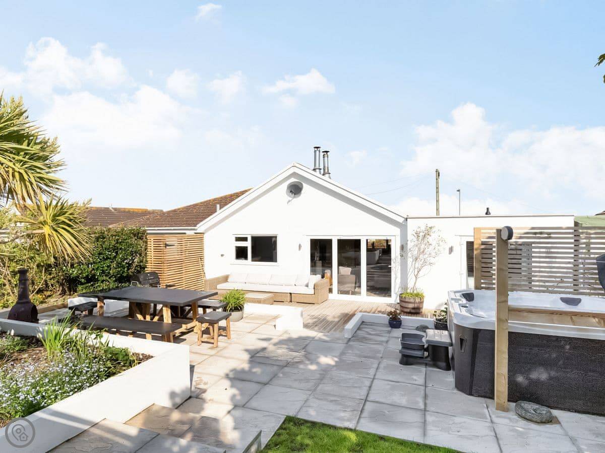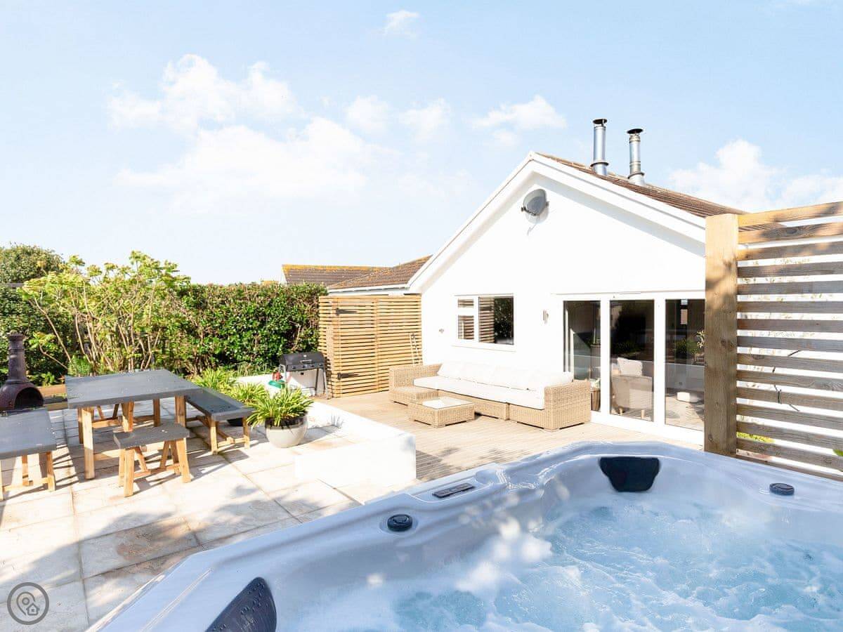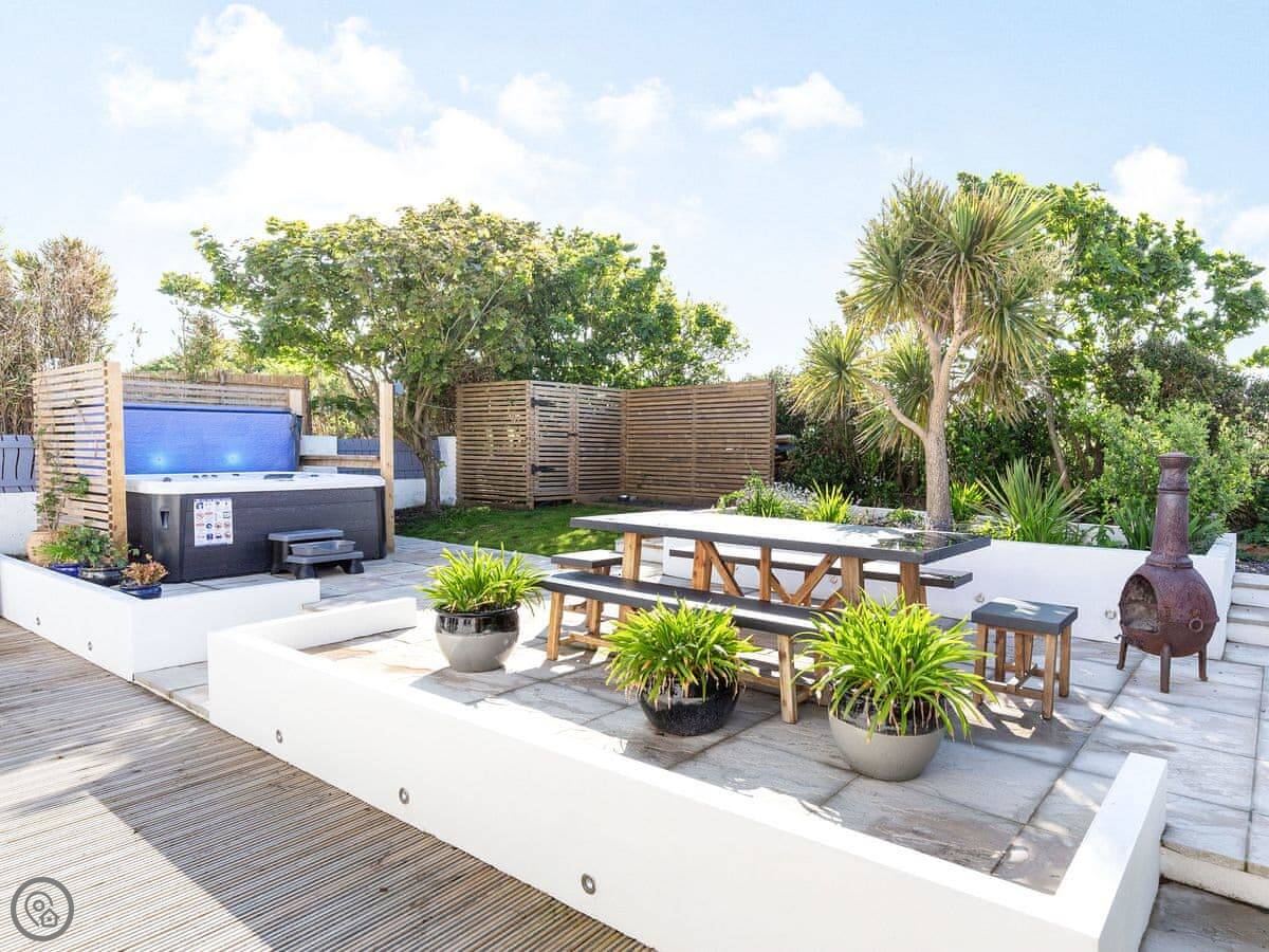 The garden backs onto fields. There's a deck with a hot tub for six, a firepit, a barbecue, and a lawn. Garden furniture is there.
