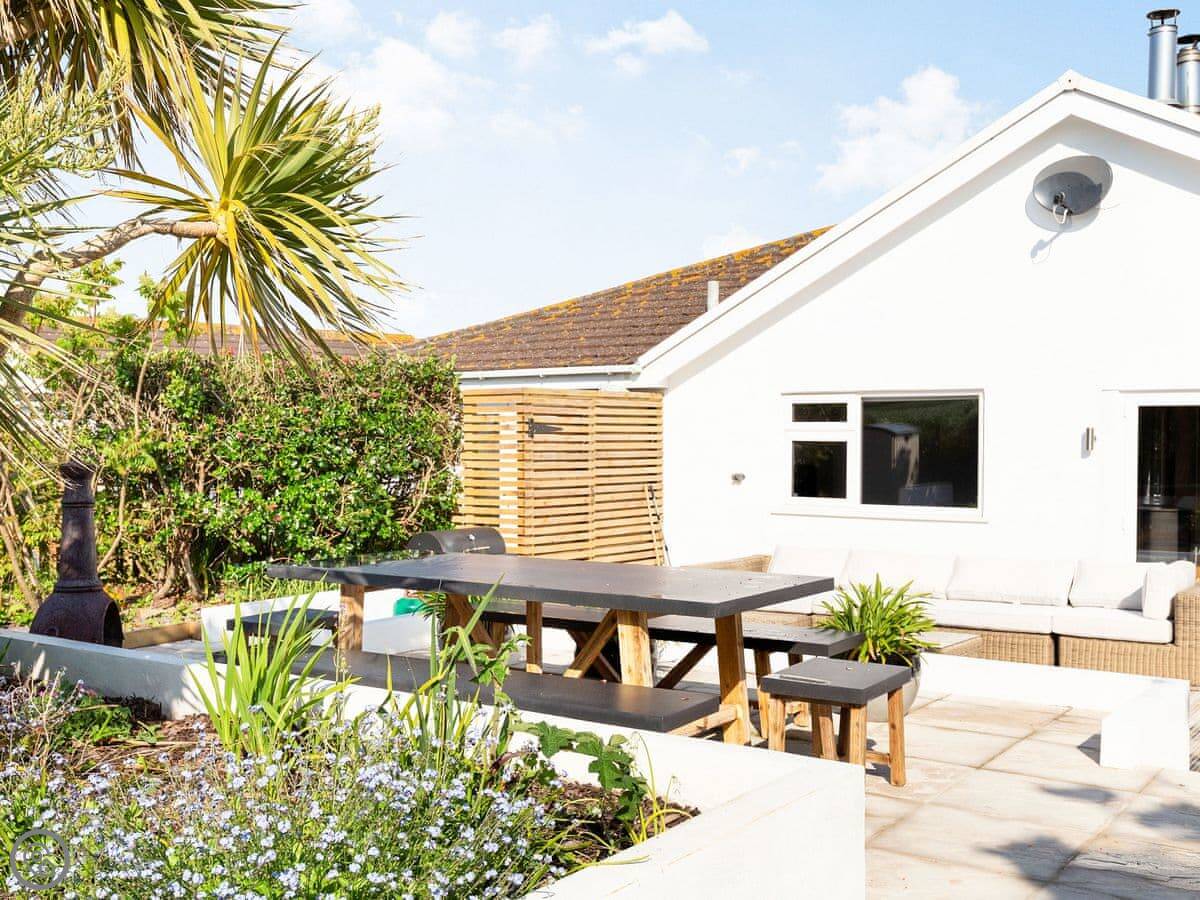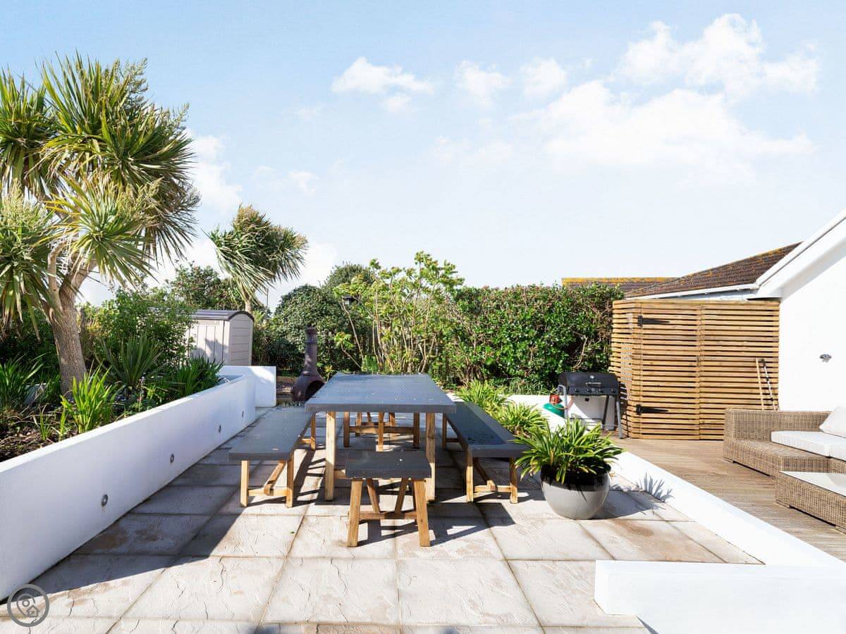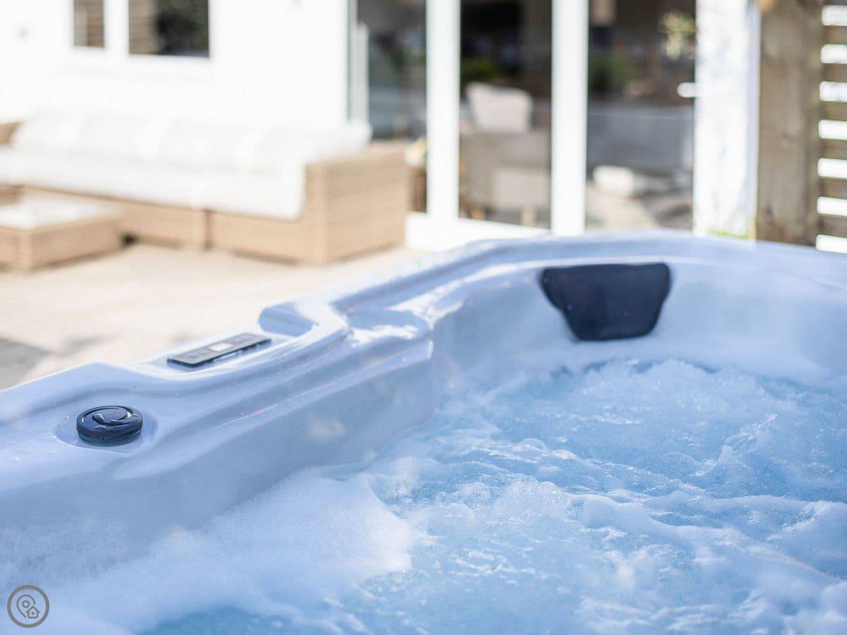 The garden backs onto fields. There's a deck with a hot tub for six, a firepit, a barbecue, and a lawn. Garden furniture is there.