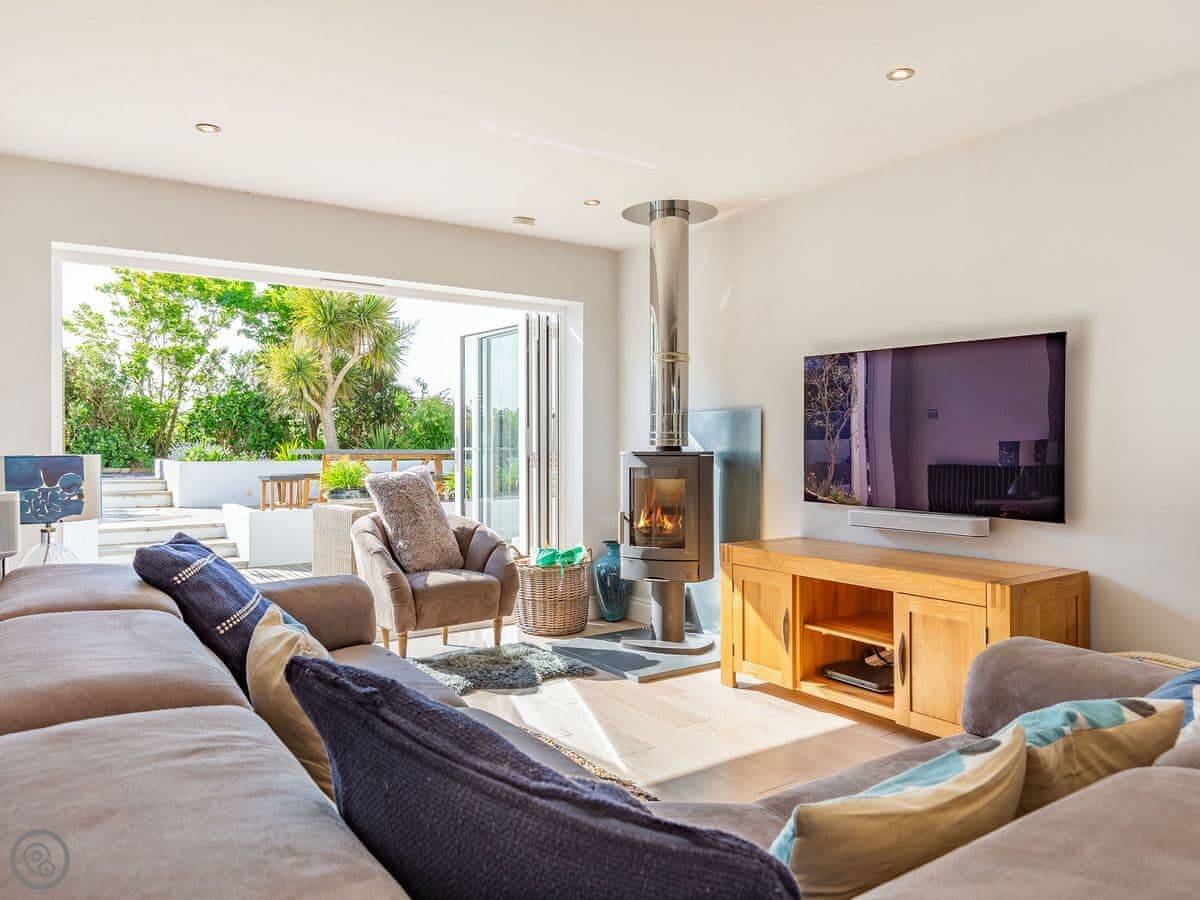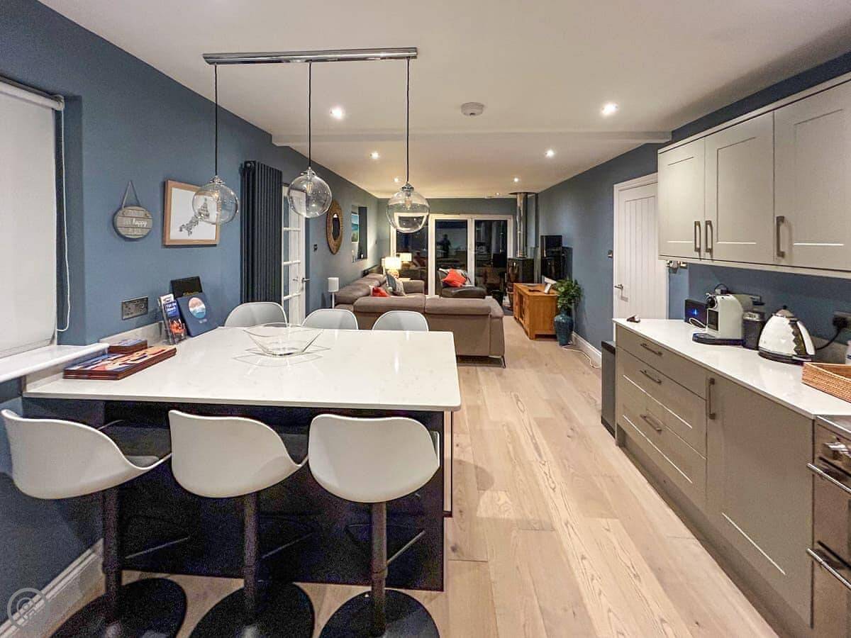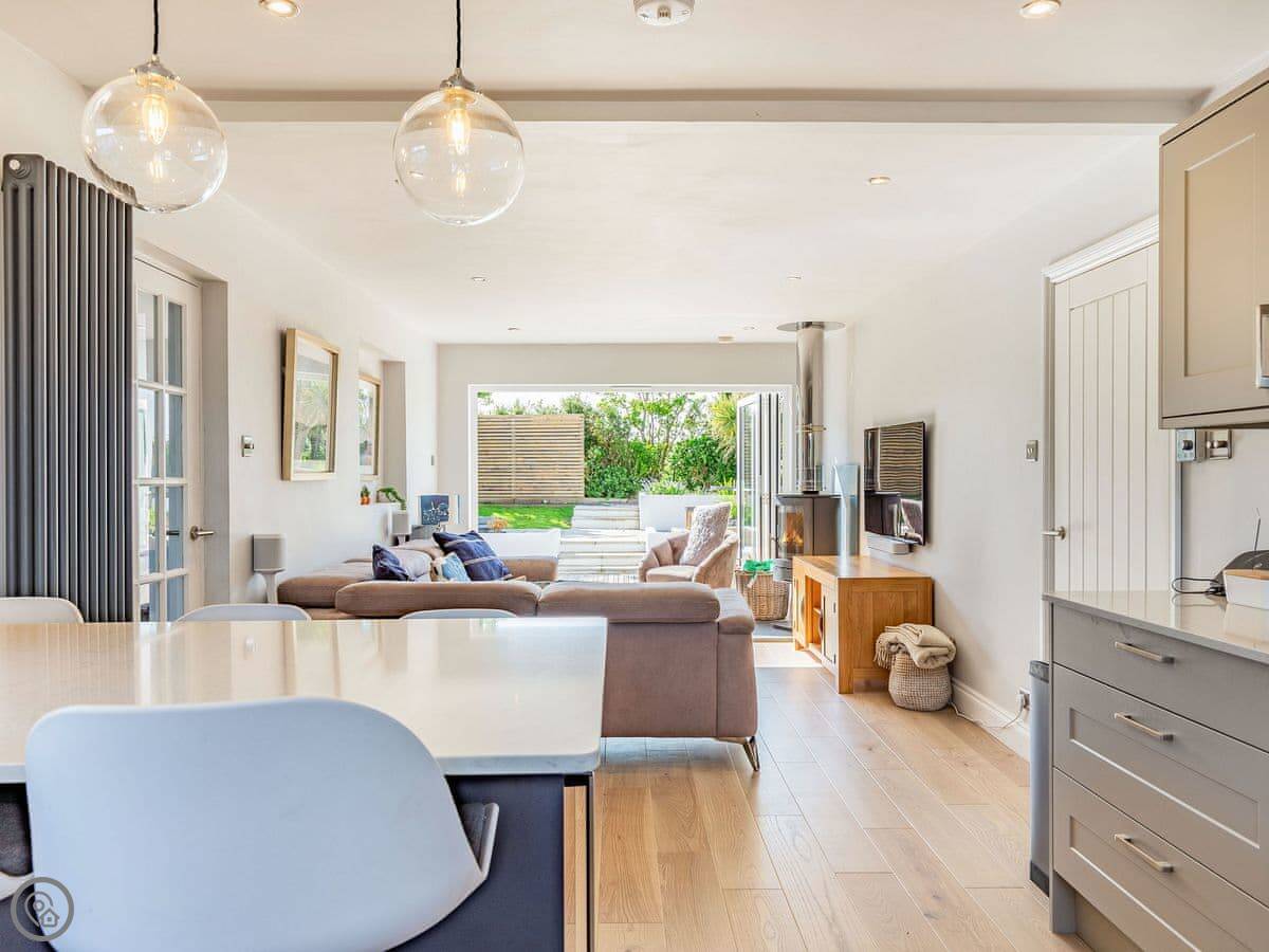 It's open plan inside. The kitchen's big, with an island you can sit at. There's a wood burner in the living area. The doors fold back completely to open the whole room onto the deck.