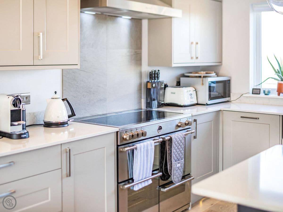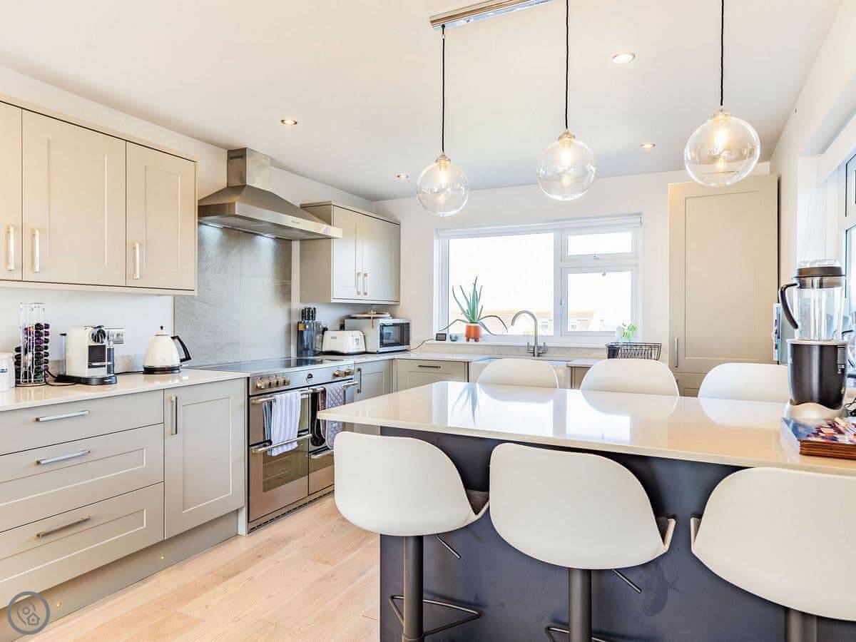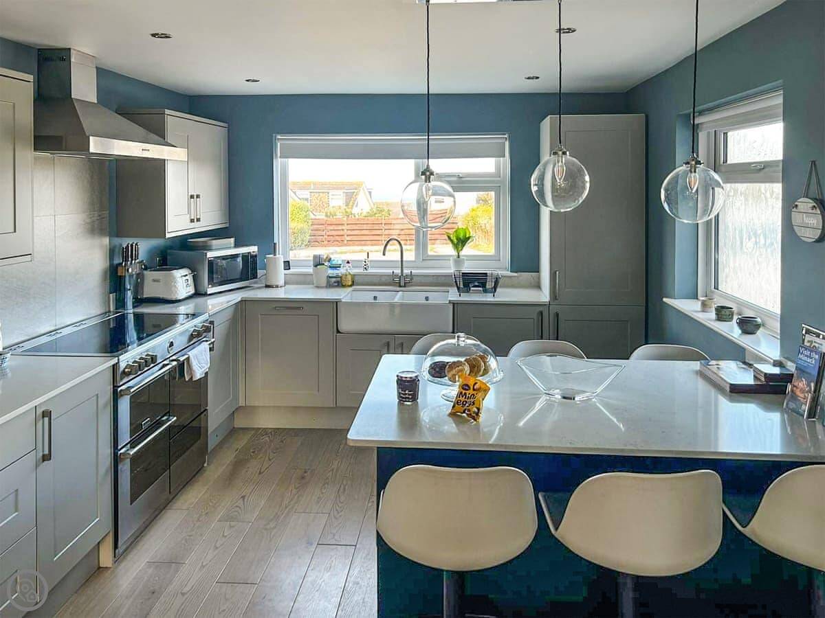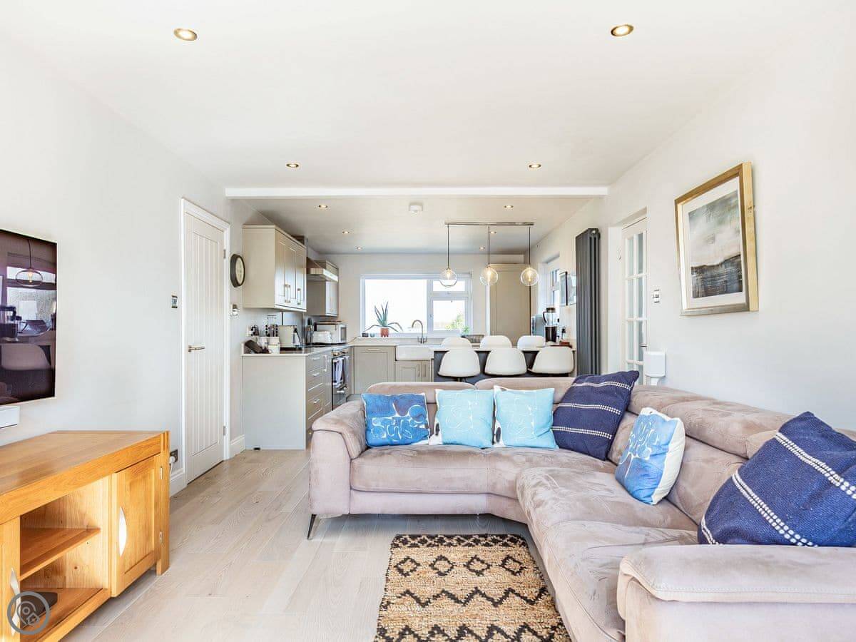 It's open plan inside. The kitchen's big, with an island you can sit at. There's a wood burner in the living area. The doors fold back completely to open the whole room onto the deck.
