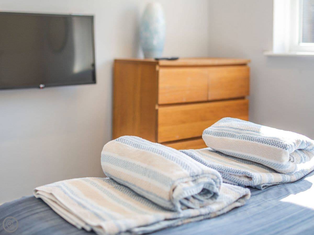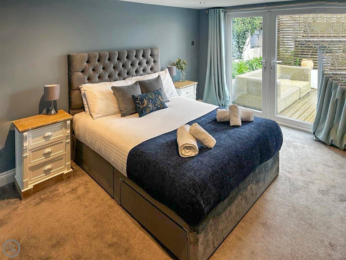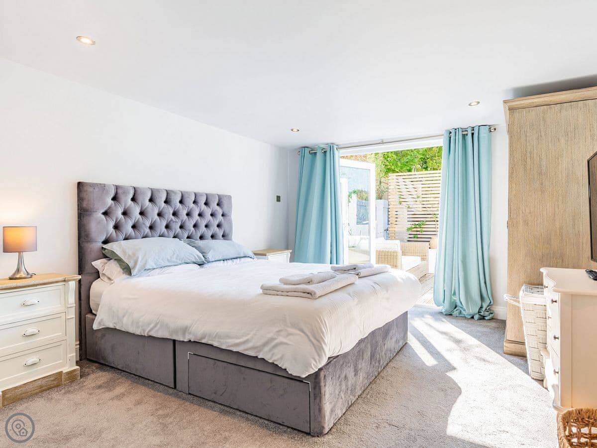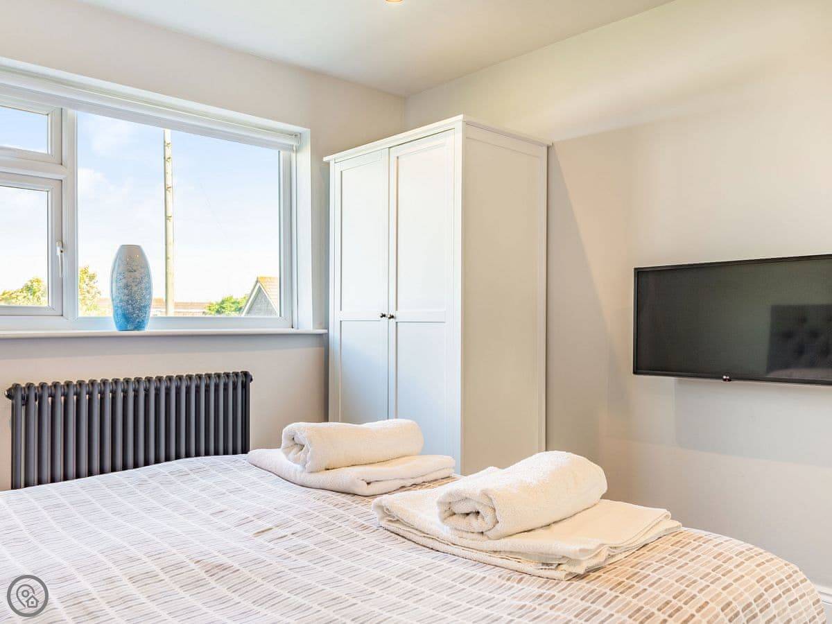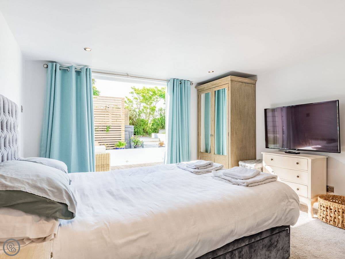 The house is all on one floor. There are three double bedrooms. The main one has its own shower room and doors out to the garden. All bedrooms have TVs on the wall. There are two bathrooms in total.
