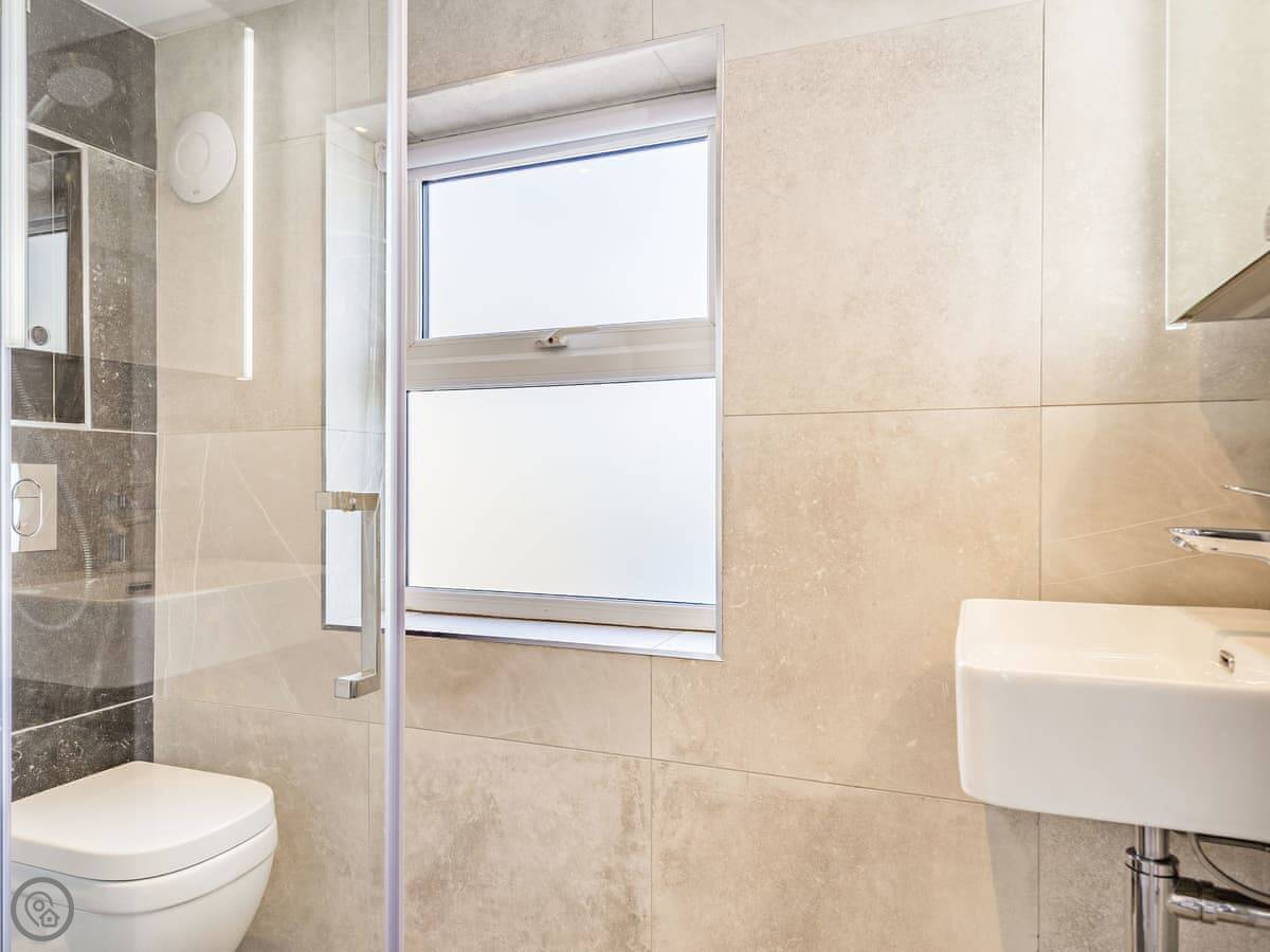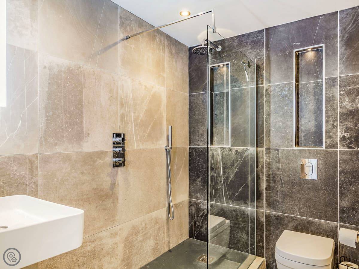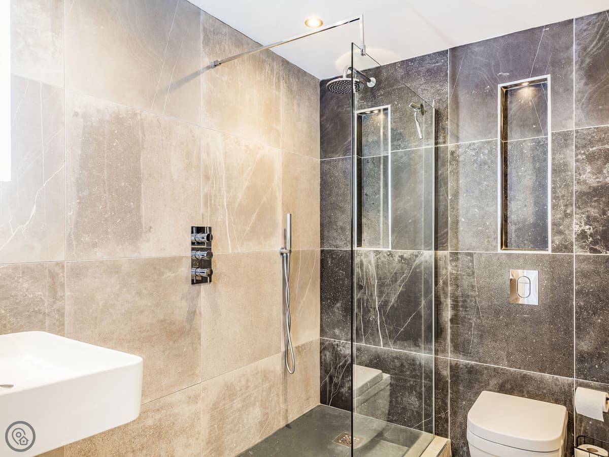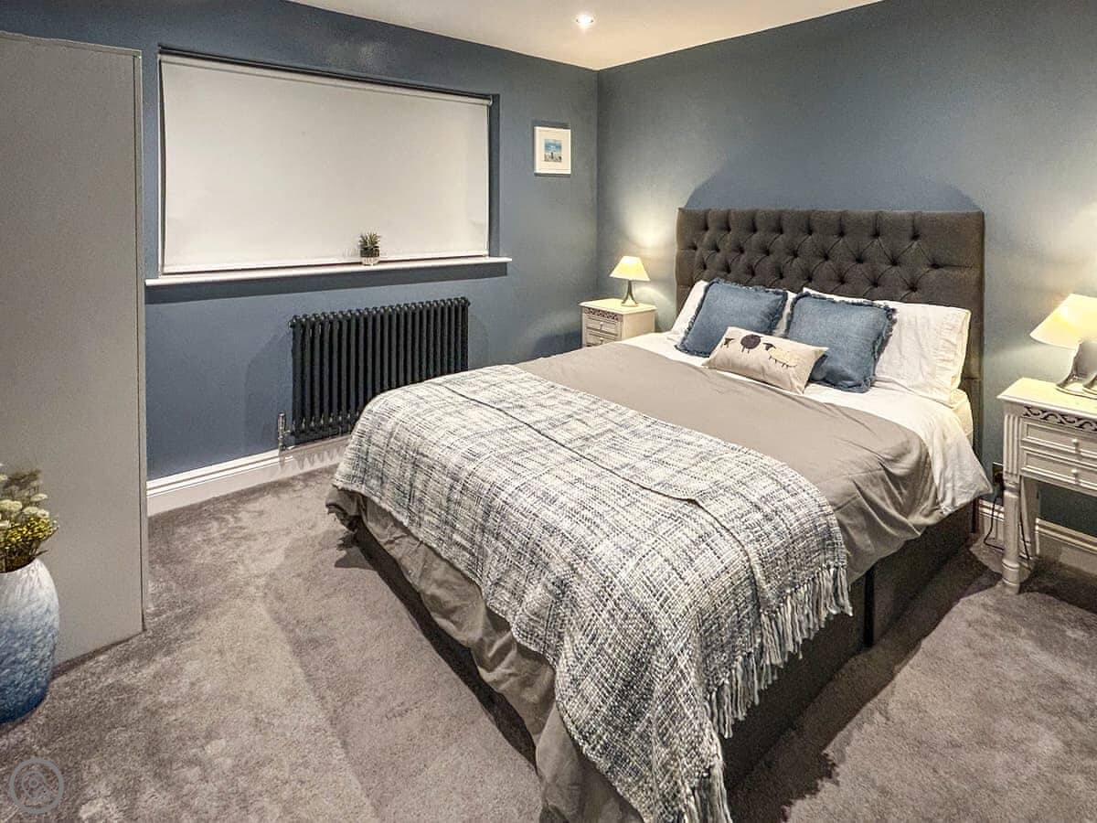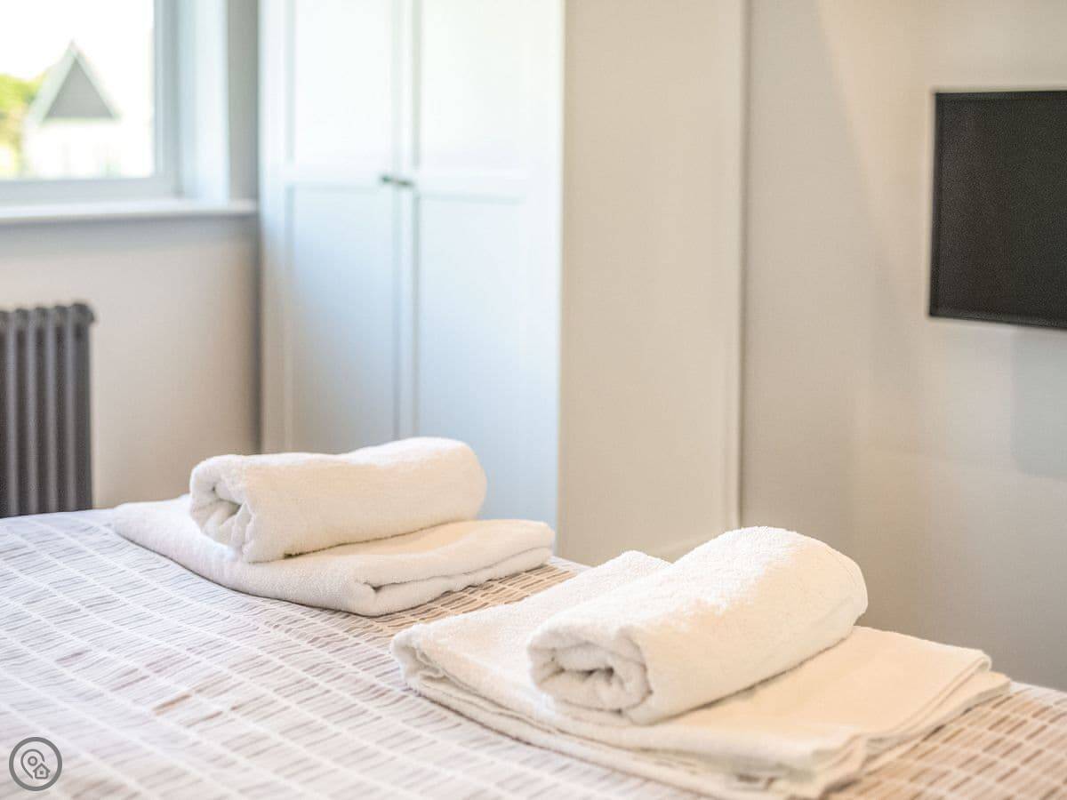 The house is all on one floor. There are three double bedrooms. The main one has its own shower room and doors out to the garden. All bedrooms have TVs on the wall. There are two bathrooms in total.