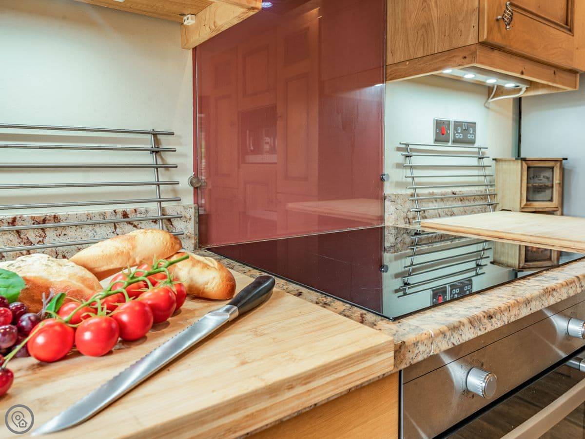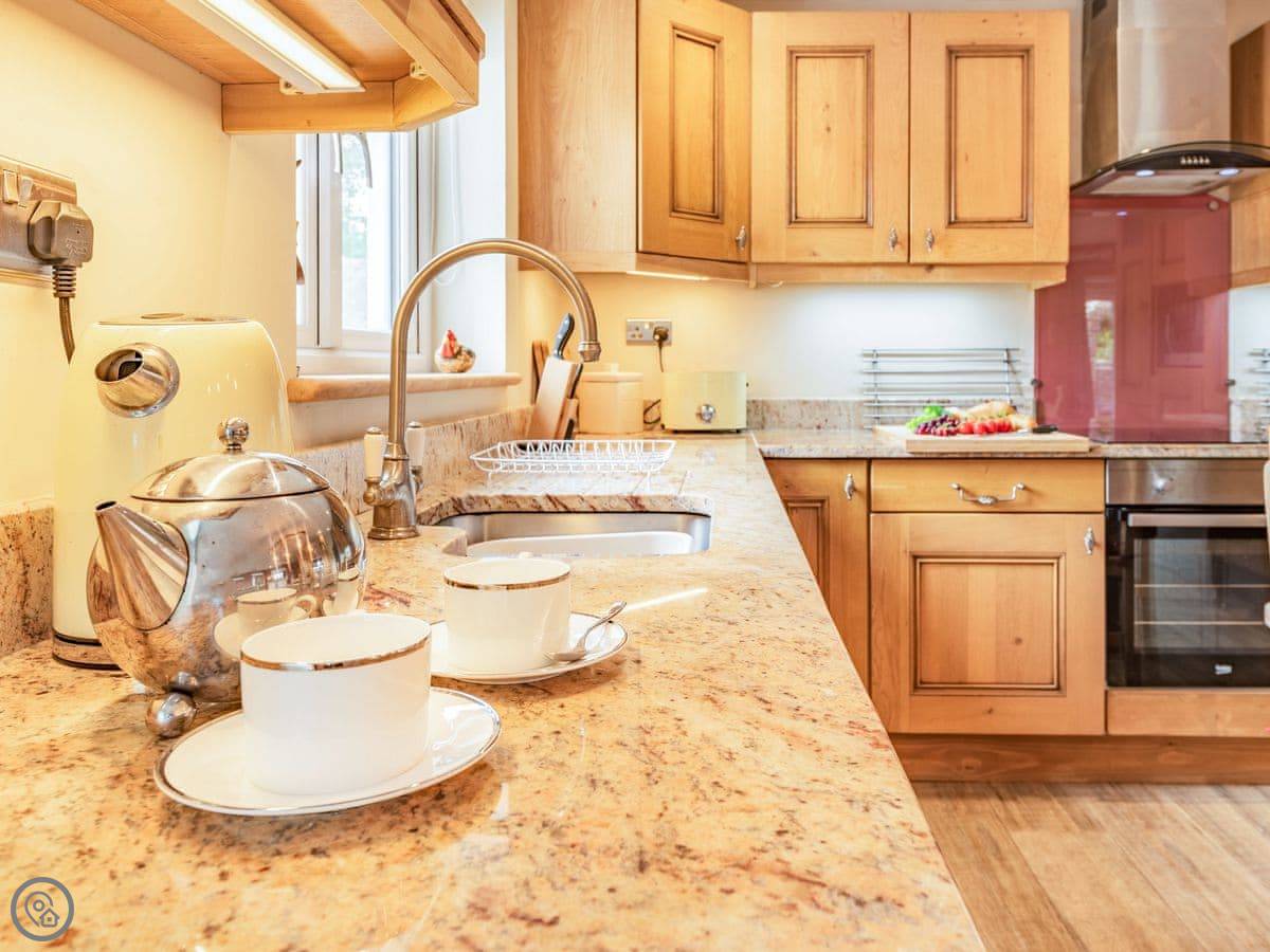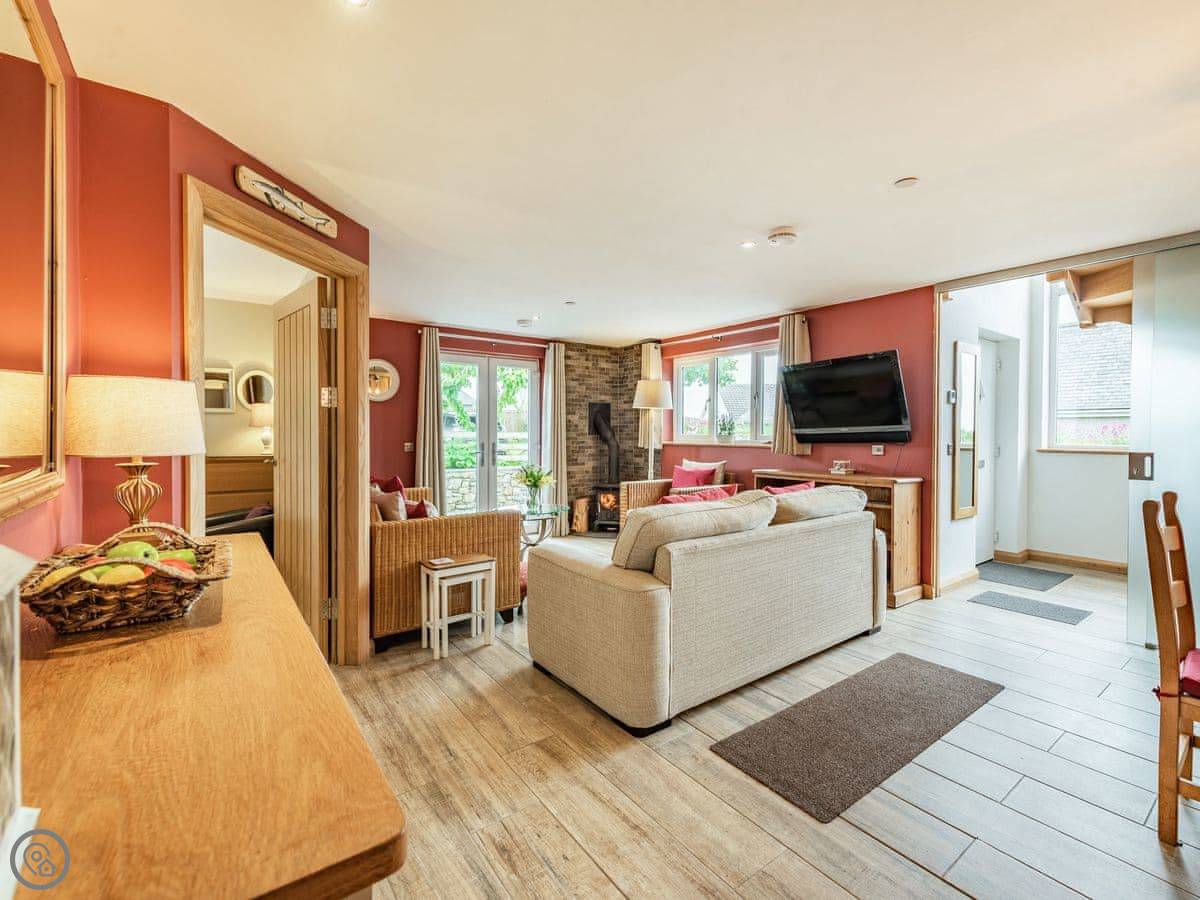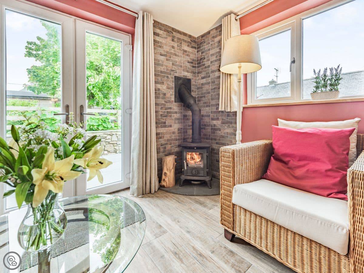 There's a wood burner in the ground floor living area. French doors go out to the patio. The kitchen has solid oak and granite worktops. It's well equipped.