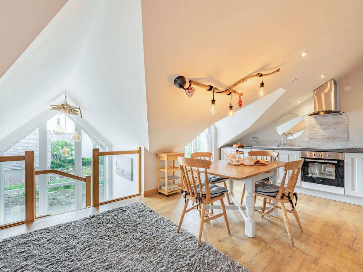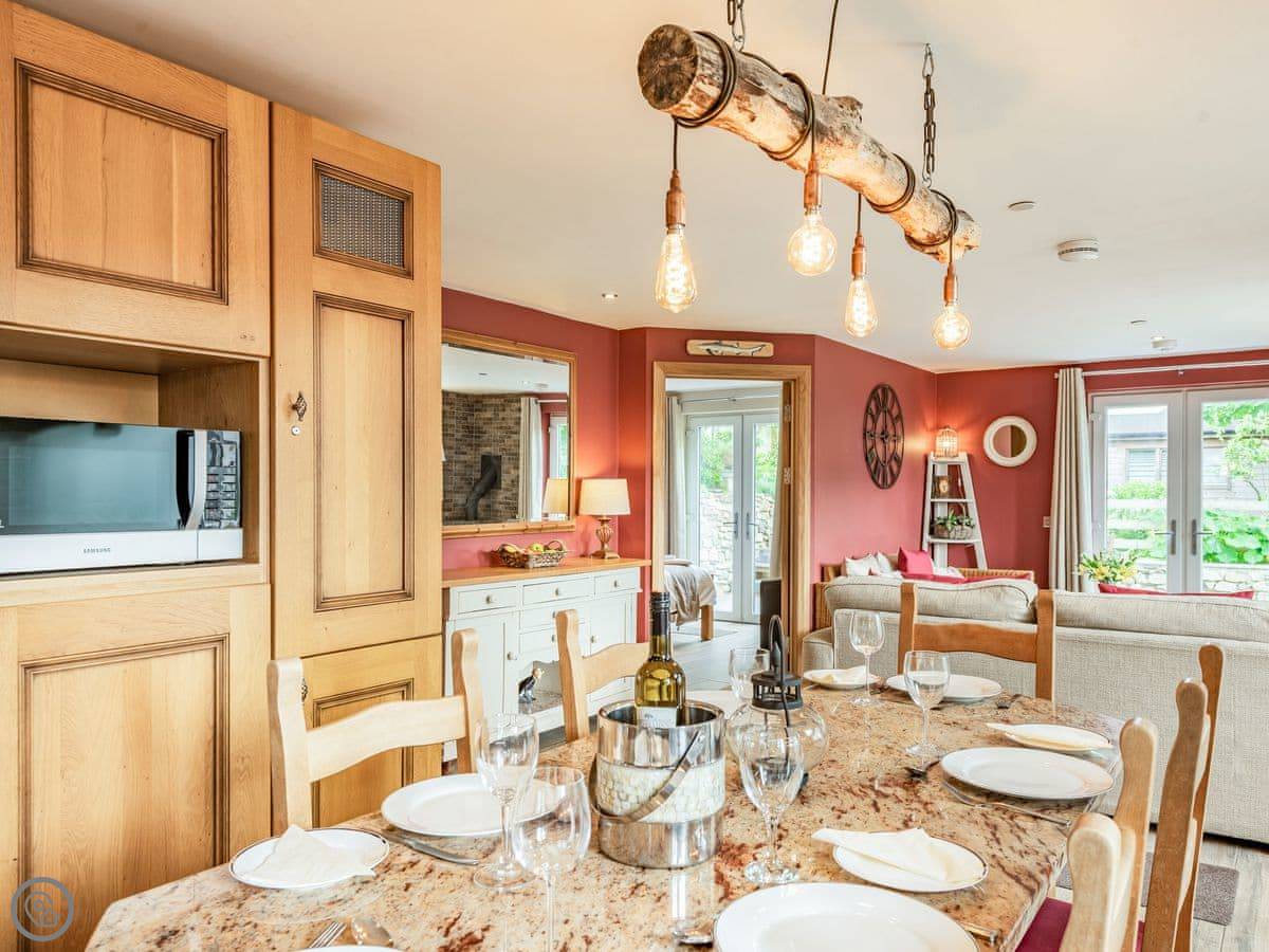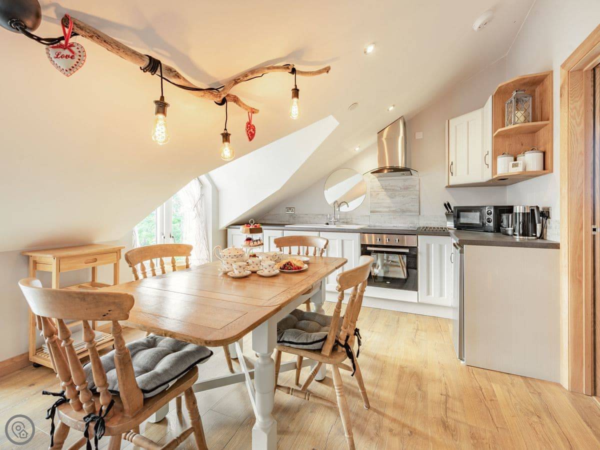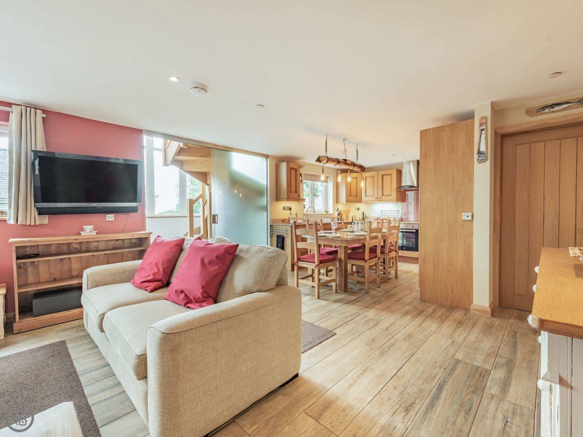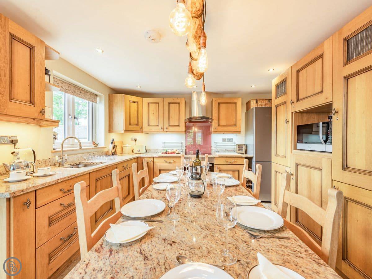 There's a wood burner in the ground floor living area. French doors go out to the patio. The kitchen has solid oak and granite worktops. It's well equipped.