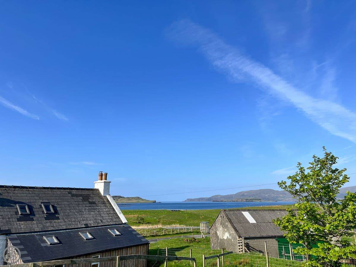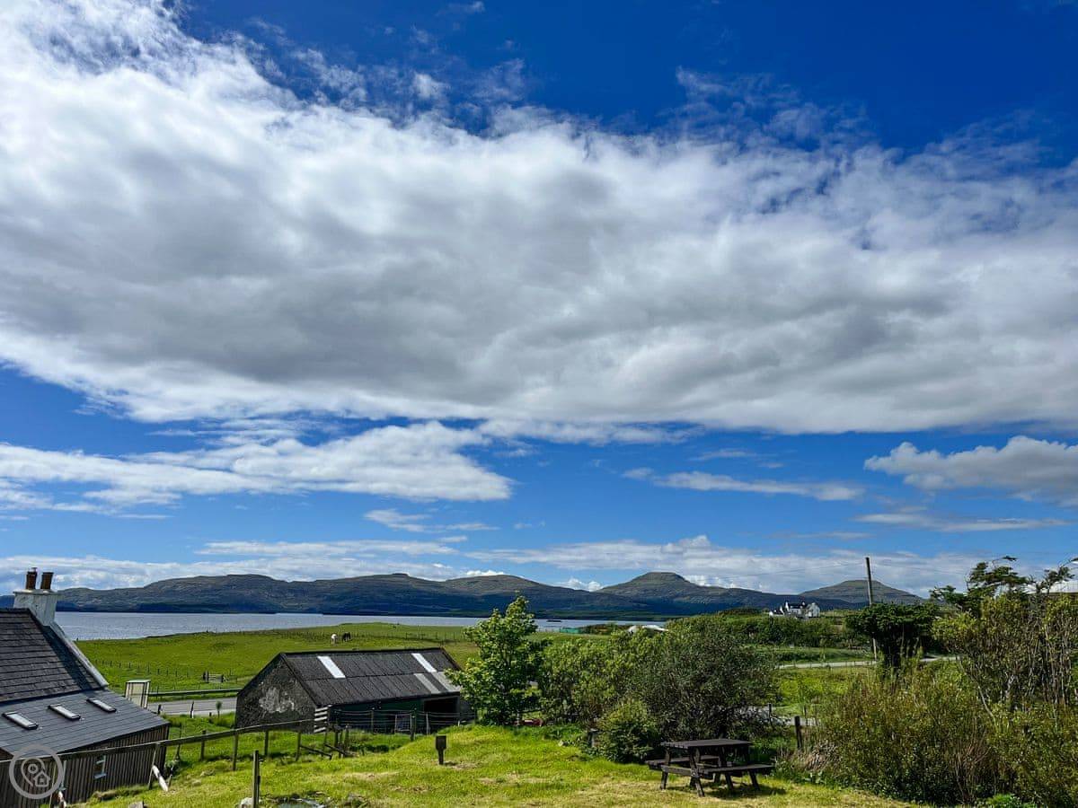 To the front of the cottage, the south-facing bench and table offer the perfect place to enjoy morning coffee, lunch or an evening meal, while taking in views of Loch Bracadale and MacLeod’s Tables. The kitchen rear door provides access to the garden, with a bench and table, and elevated seating providing panoramic views of MacLeod’s Tables, the Black Cuillins and Loch Bracadale. There are also washing lines and a hose for cleaning muddy boots.