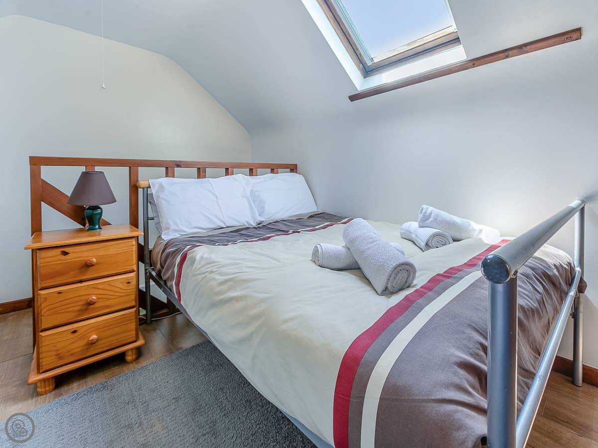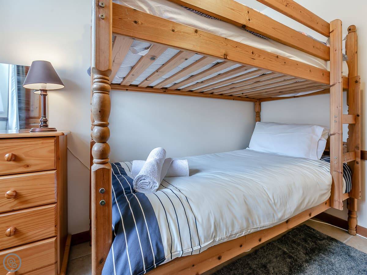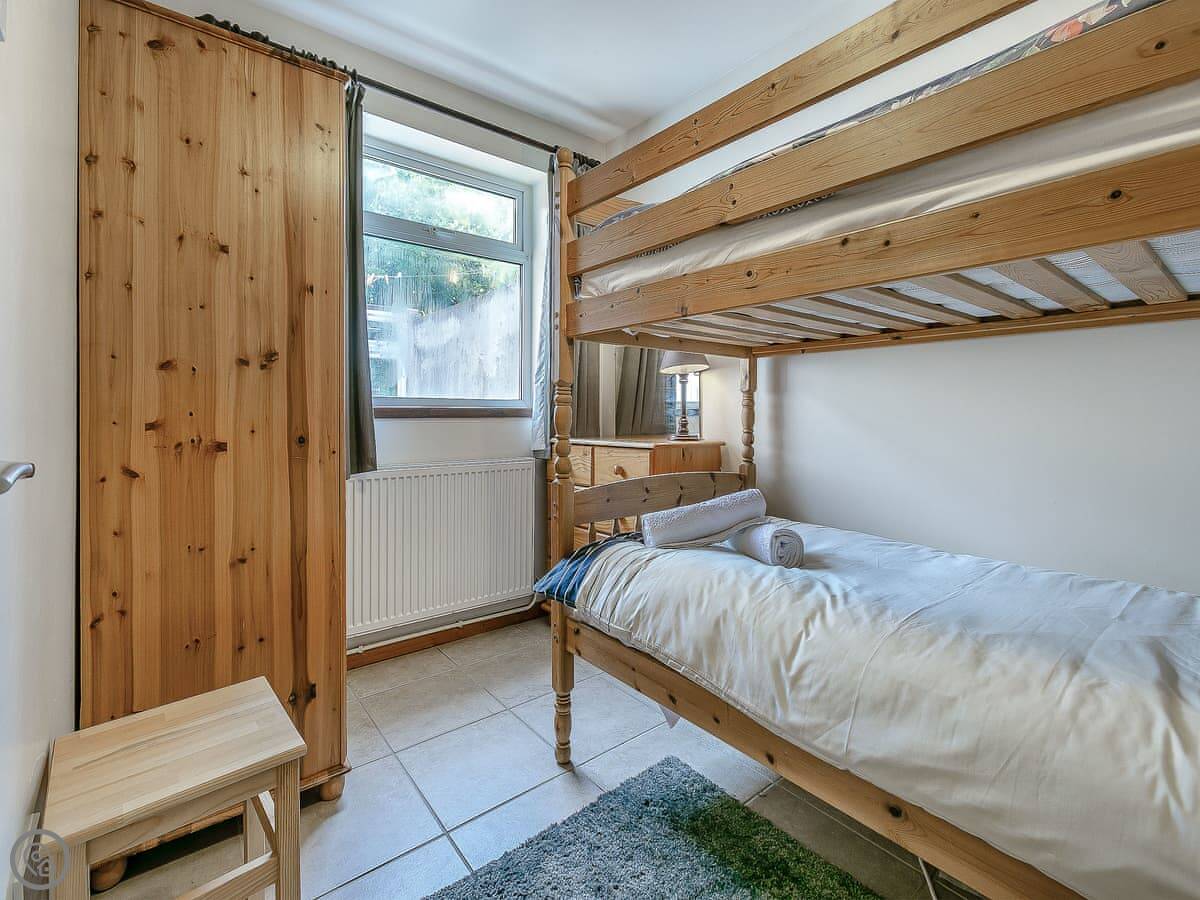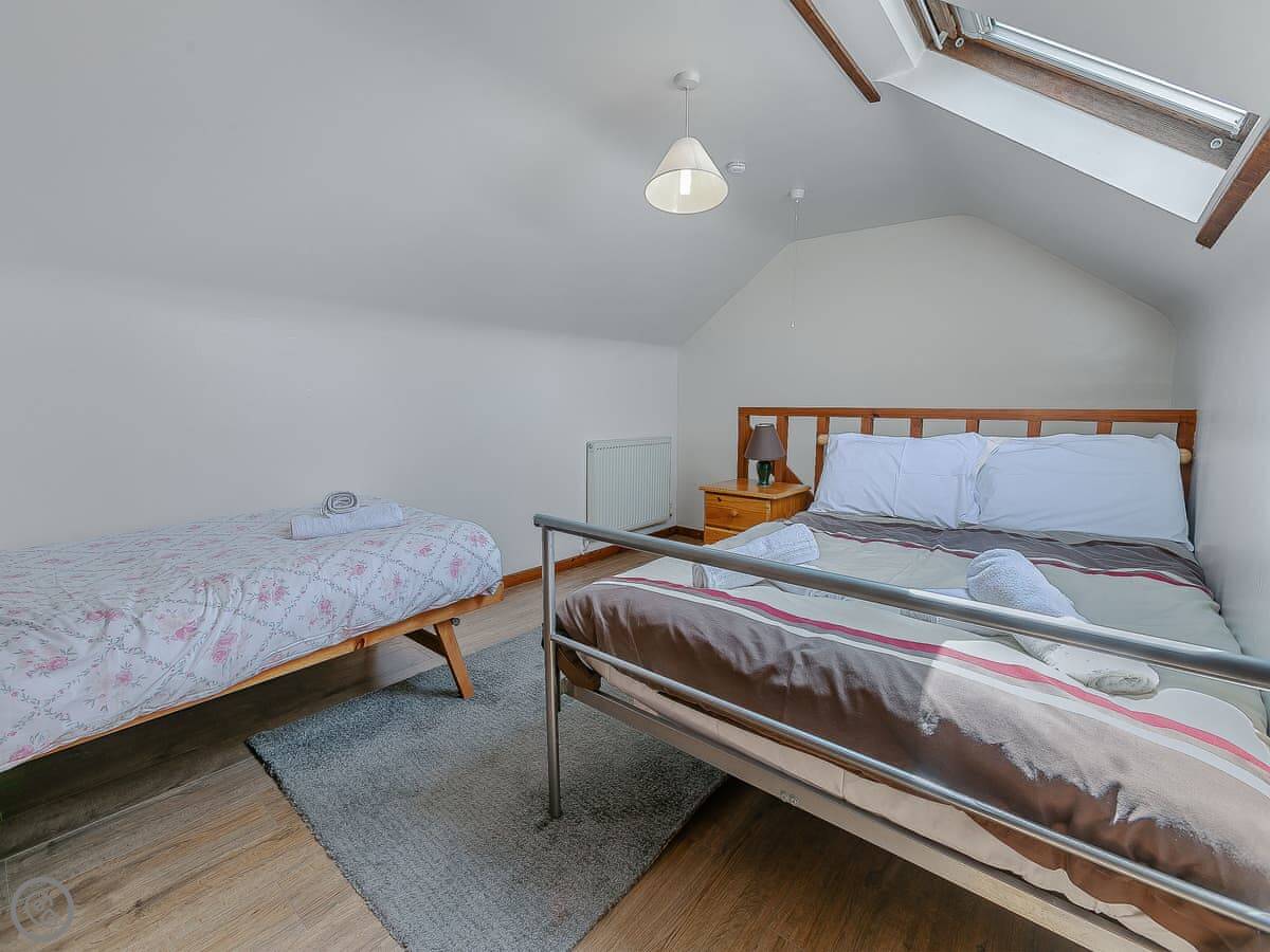 It sleeps six. Three bedrooms and one bathroom. One double bedroom is upstairs in the dormer. Downstairs there's another double and a twin bedroom with bunk beds. The stairs are fine, just normal cottage stairs.
