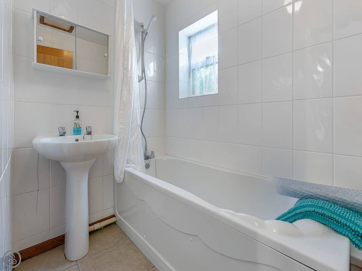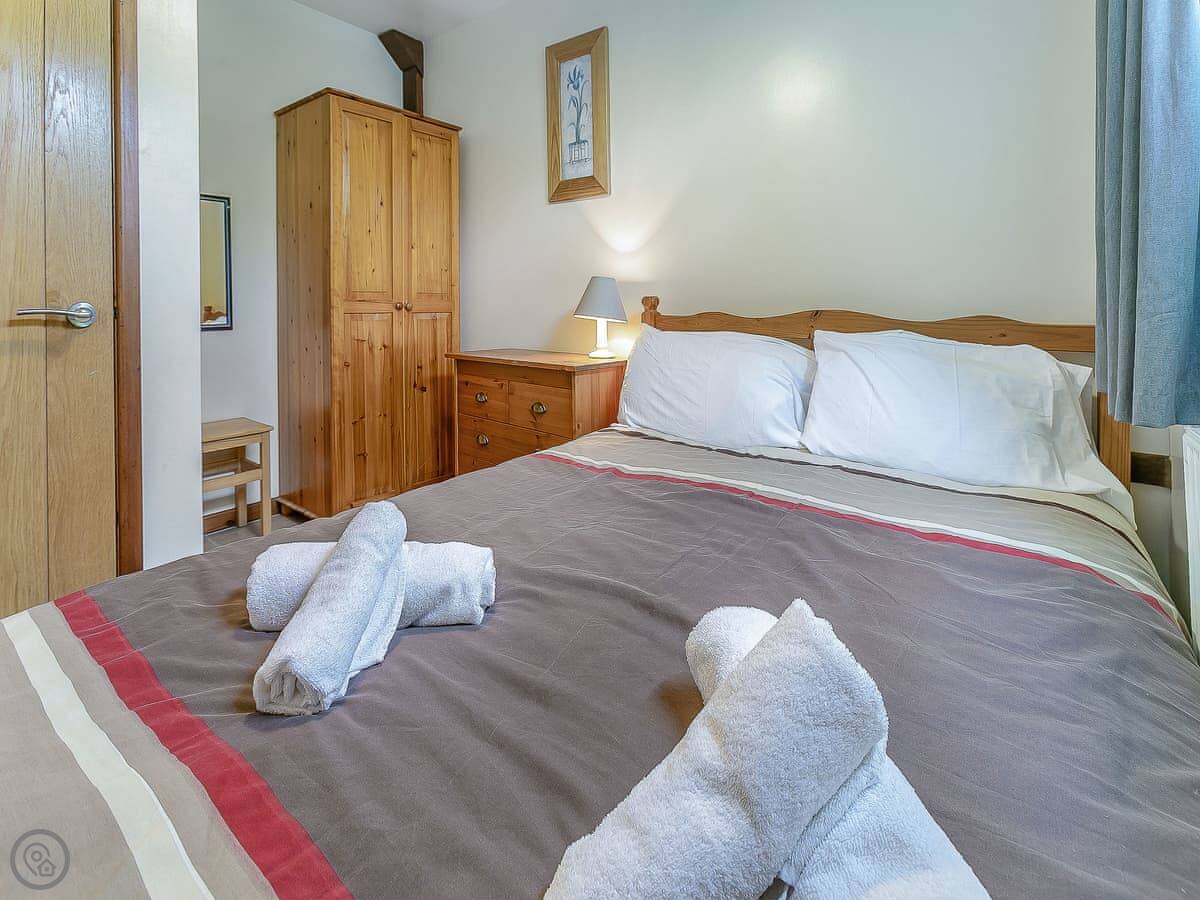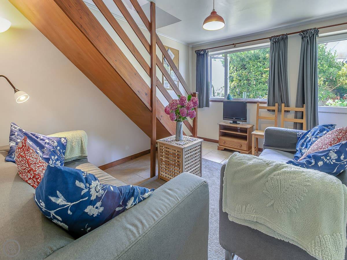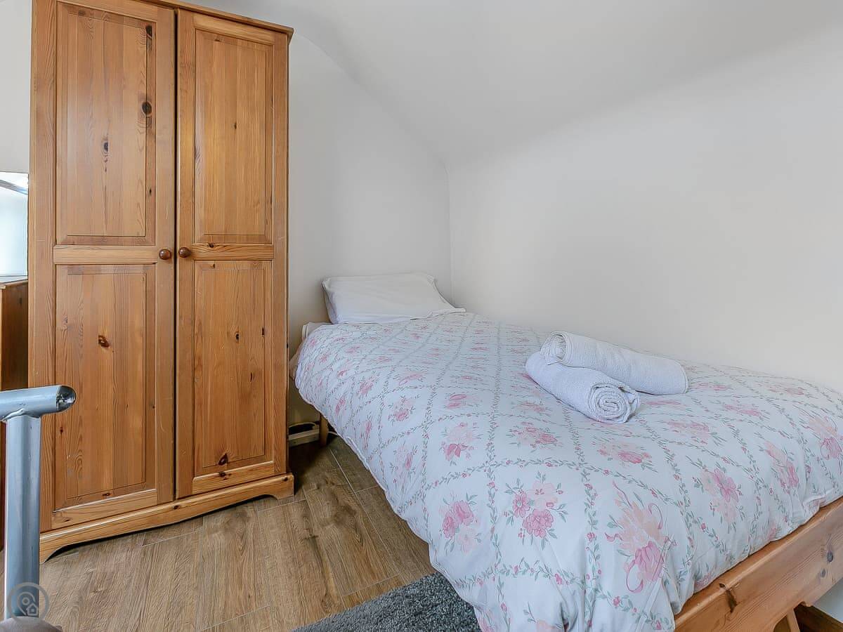 It sleeps six. Three bedrooms and one bathroom. One double bedroom is upstairs in the dormer. Downstairs there's another double and a twin bedroom with bunk beds. The stairs are fine, just normal cottage stairs.