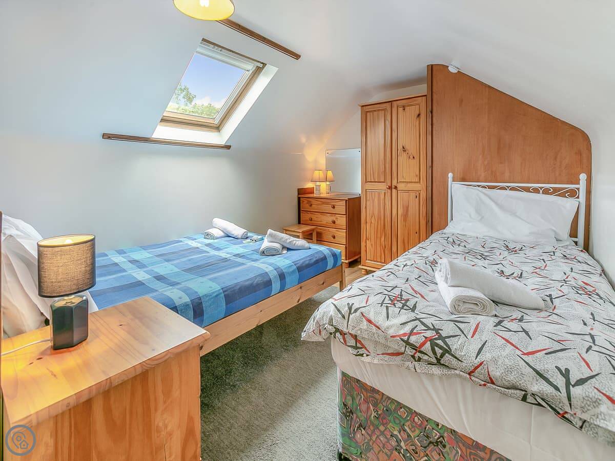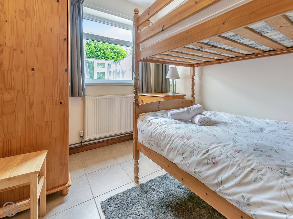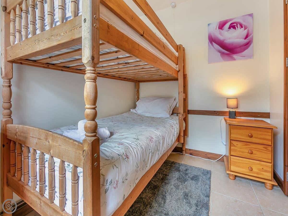 It sleeps six. There are three bedrooms and one bathroom. One double bedroom is on the first floor. On the ground floor there's another double and a twin room with bunk beds. There's also a single bed in the ground floor double room, which is handy for a young child. We don't provide travel cots.