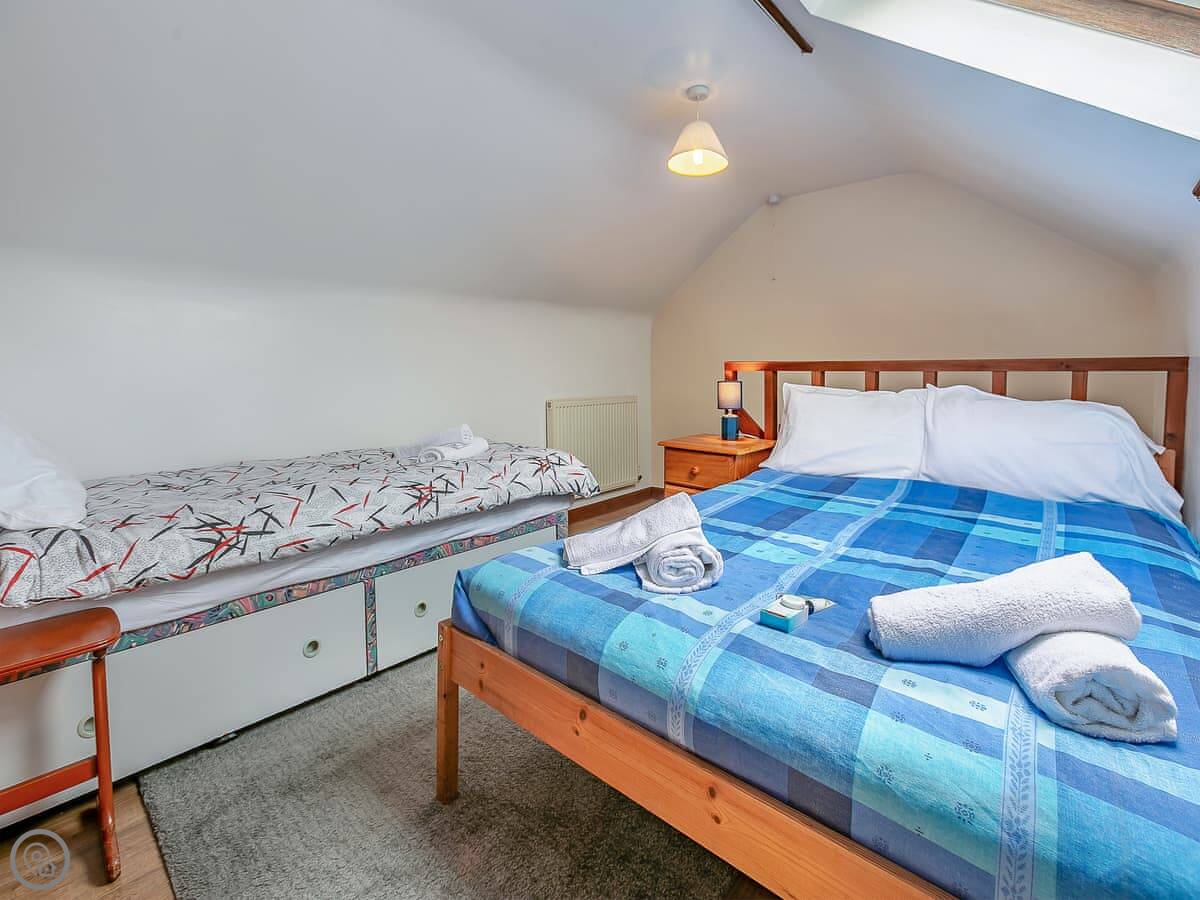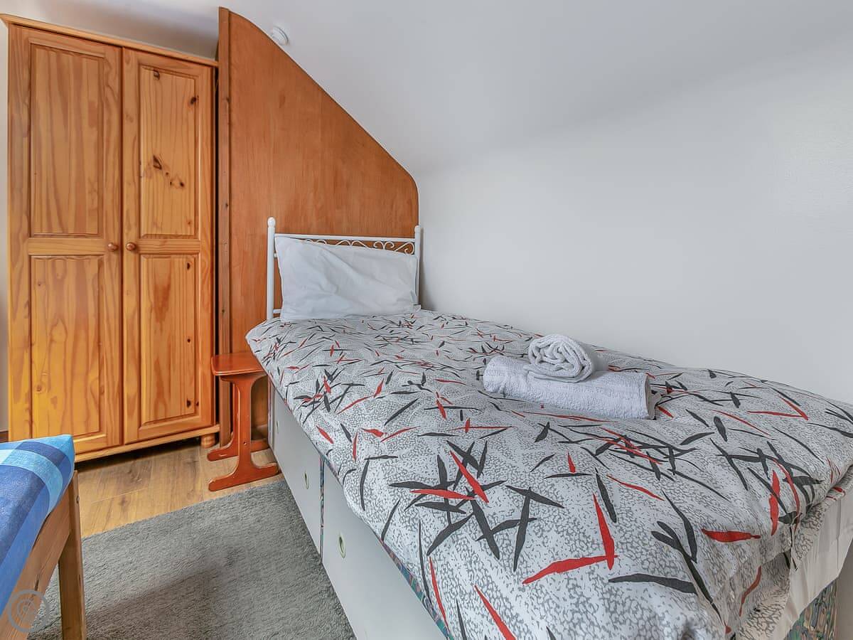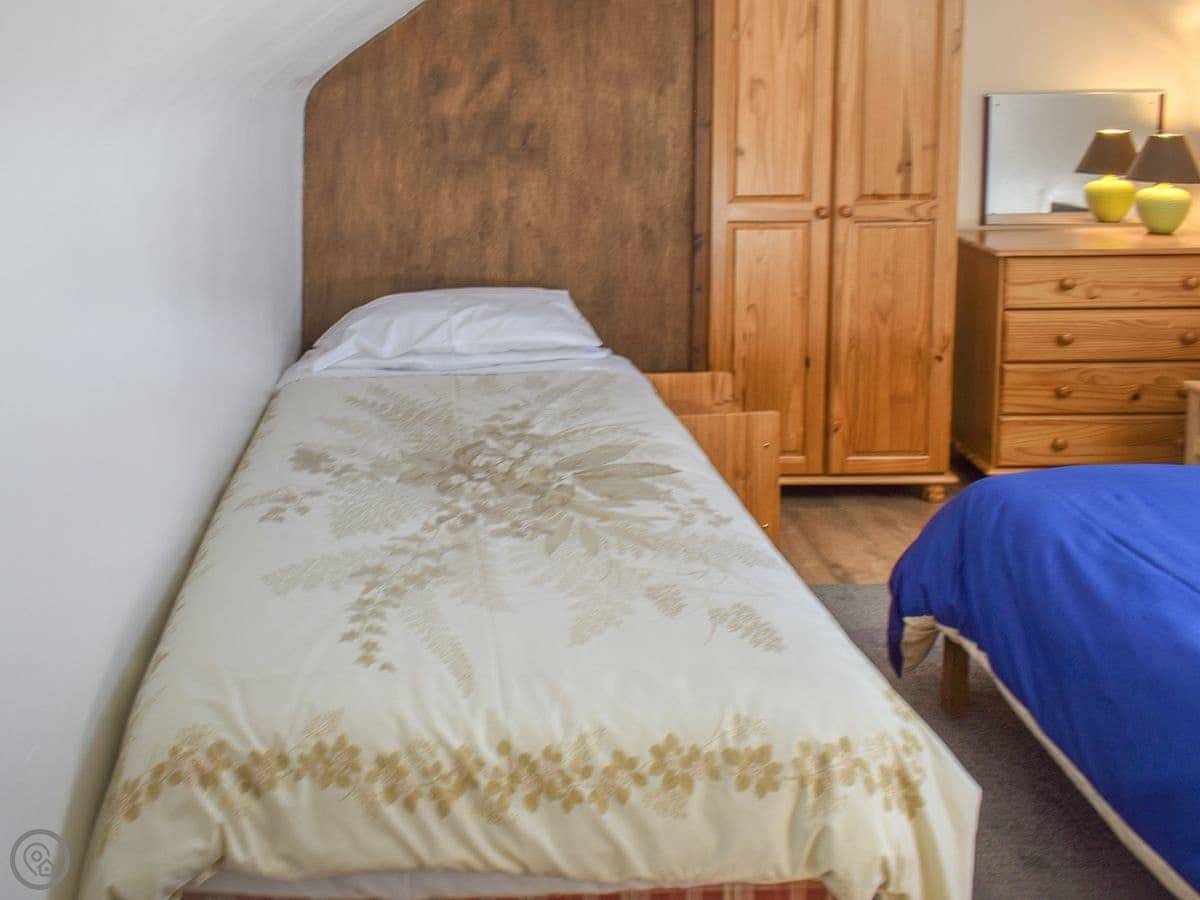 It sleeps six. There are three bedrooms and one bathroom. One double bedroom is on the first floor. On the ground floor there's another double and a twin room with bunk beds. There's also a single bed in the ground floor double room, which is handy for a young child. We don't provide travel cots.