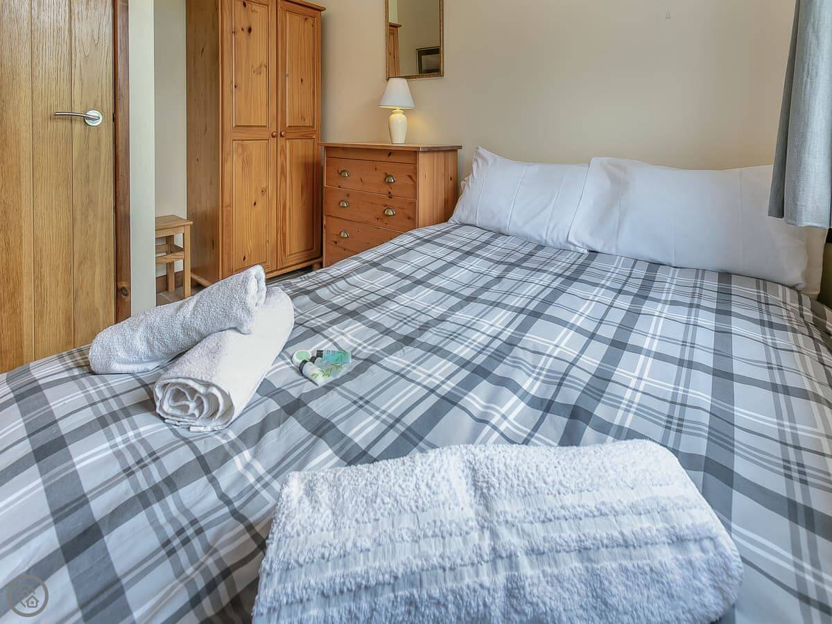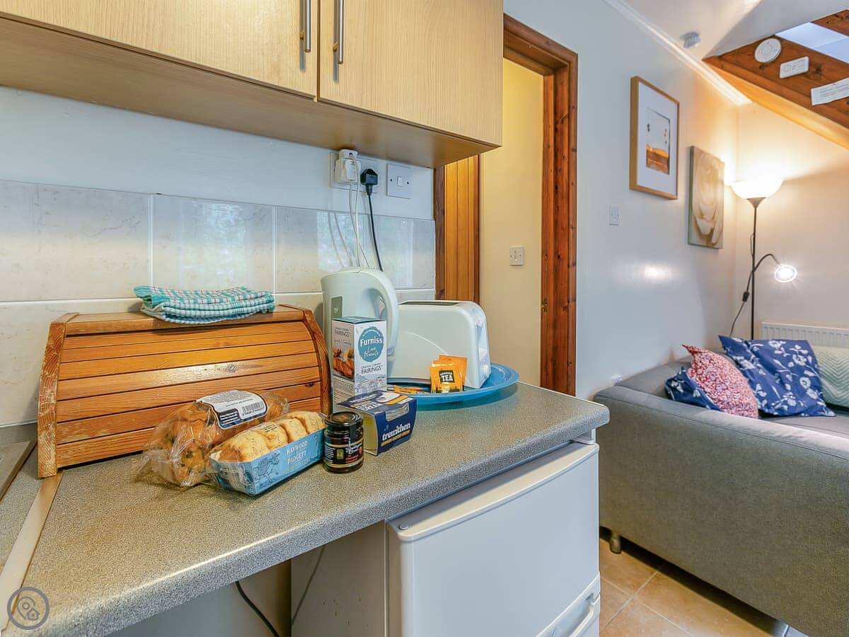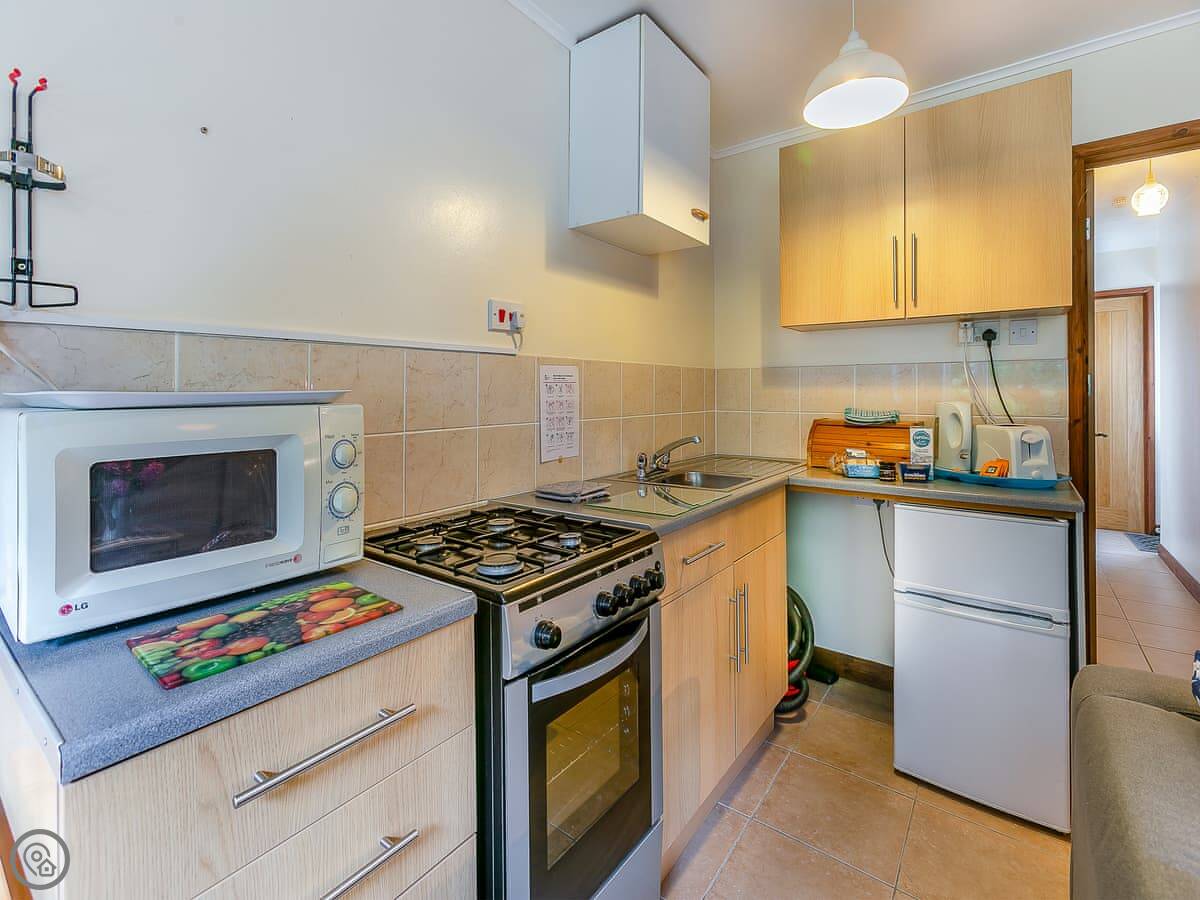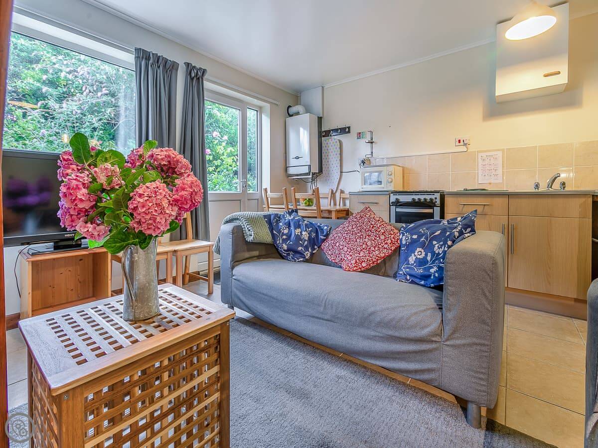 The living space is open plan. It's got a TV, fridge, microwave, and all the usual kitchen things. The cottage has a 3 Star rating. It's comfortable and clean.
