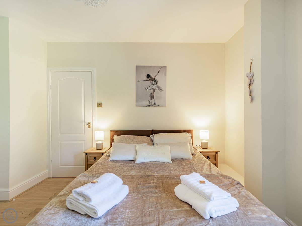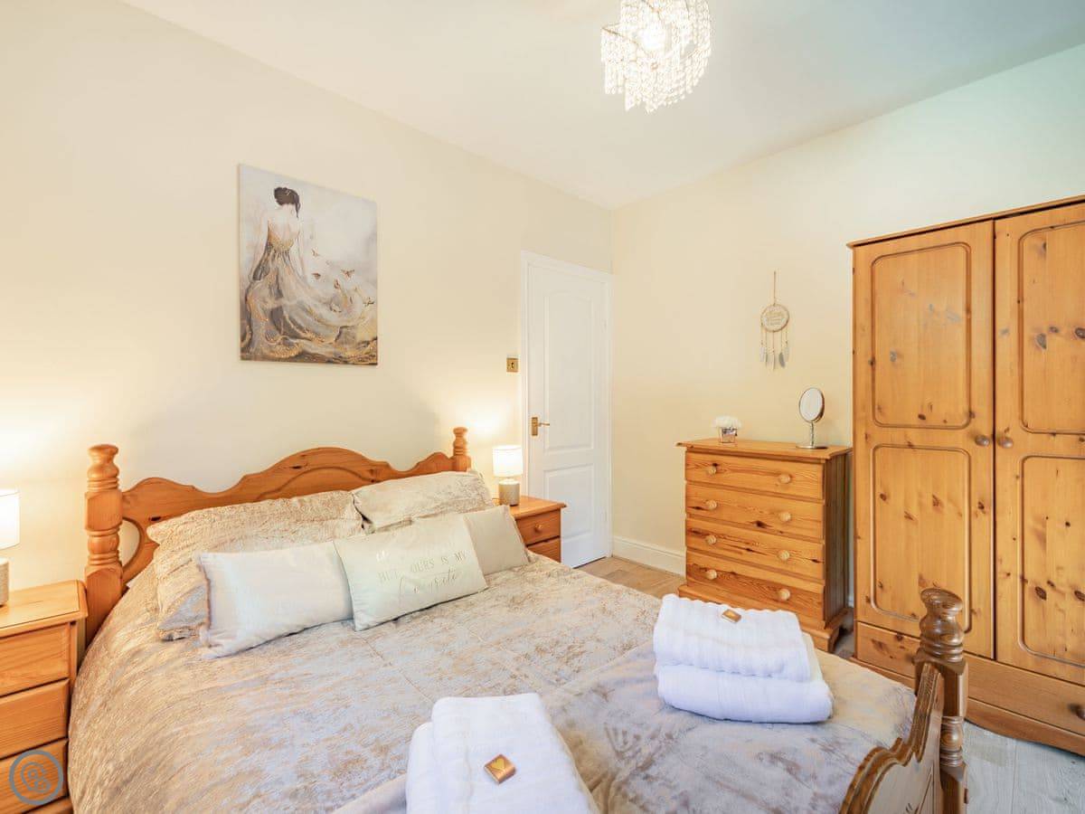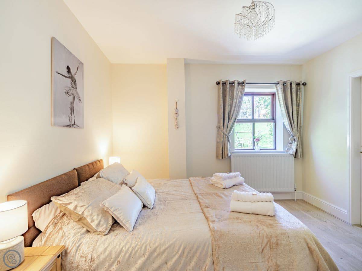 Sleeps four. Two bedrooms, one bathroom with a shower over the bath. The rating is 4 Star. One bedroom has a double bed and the other has a kingsize, which we can make into twins if you ask beforehand. The kingsize room looks out towards Stanhope Castle.
