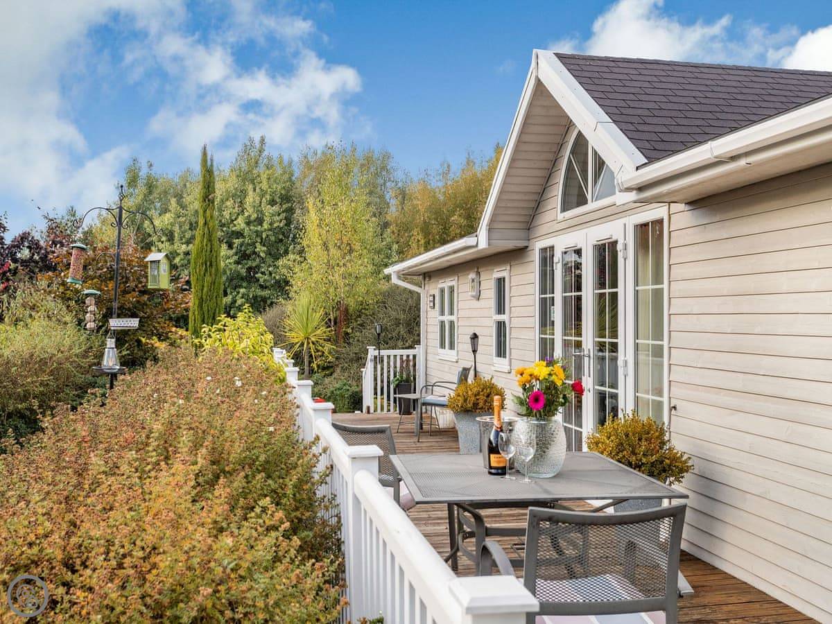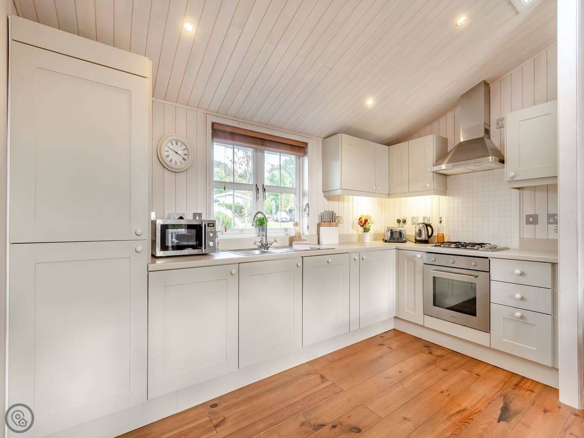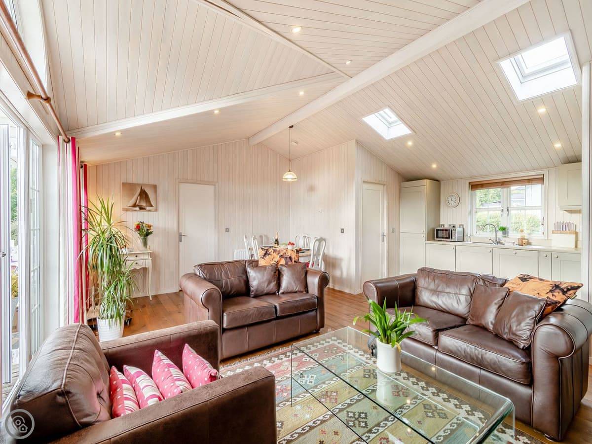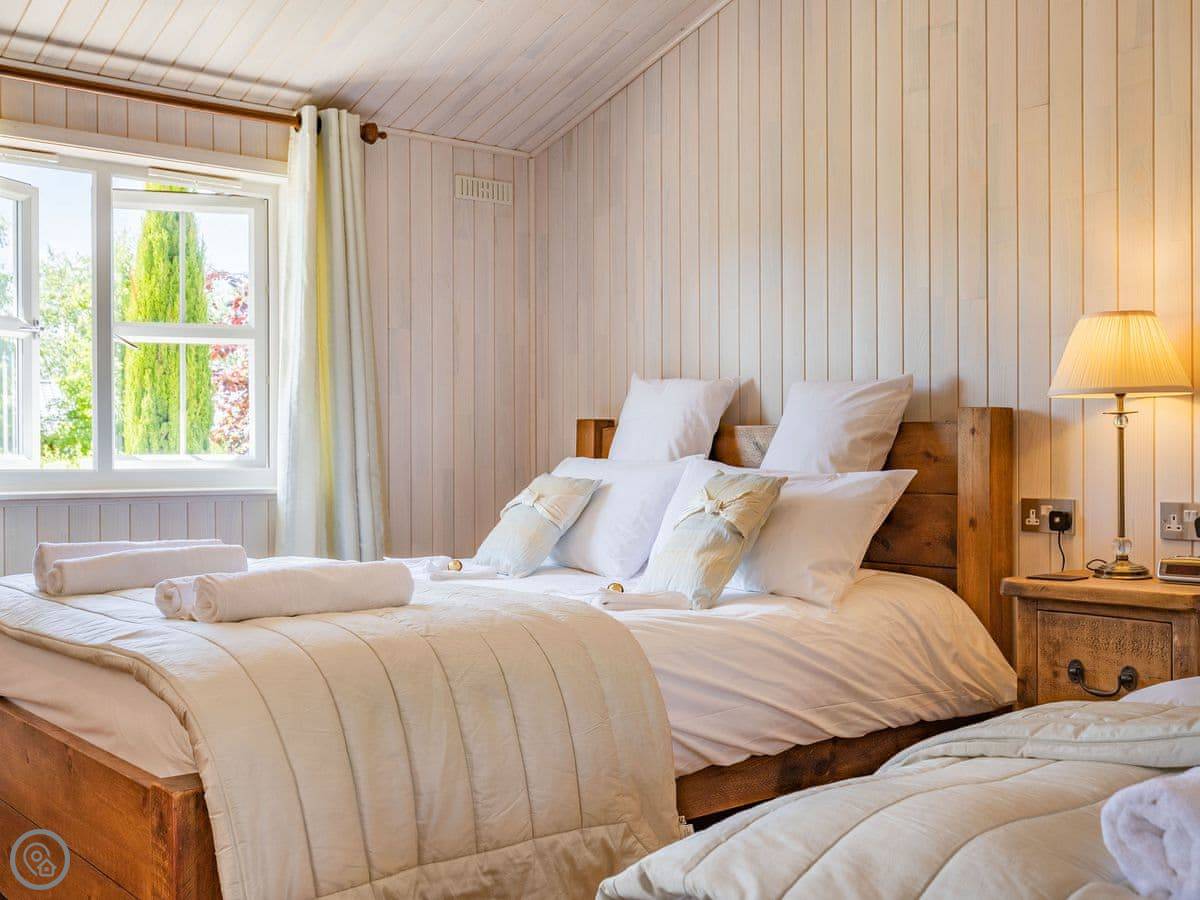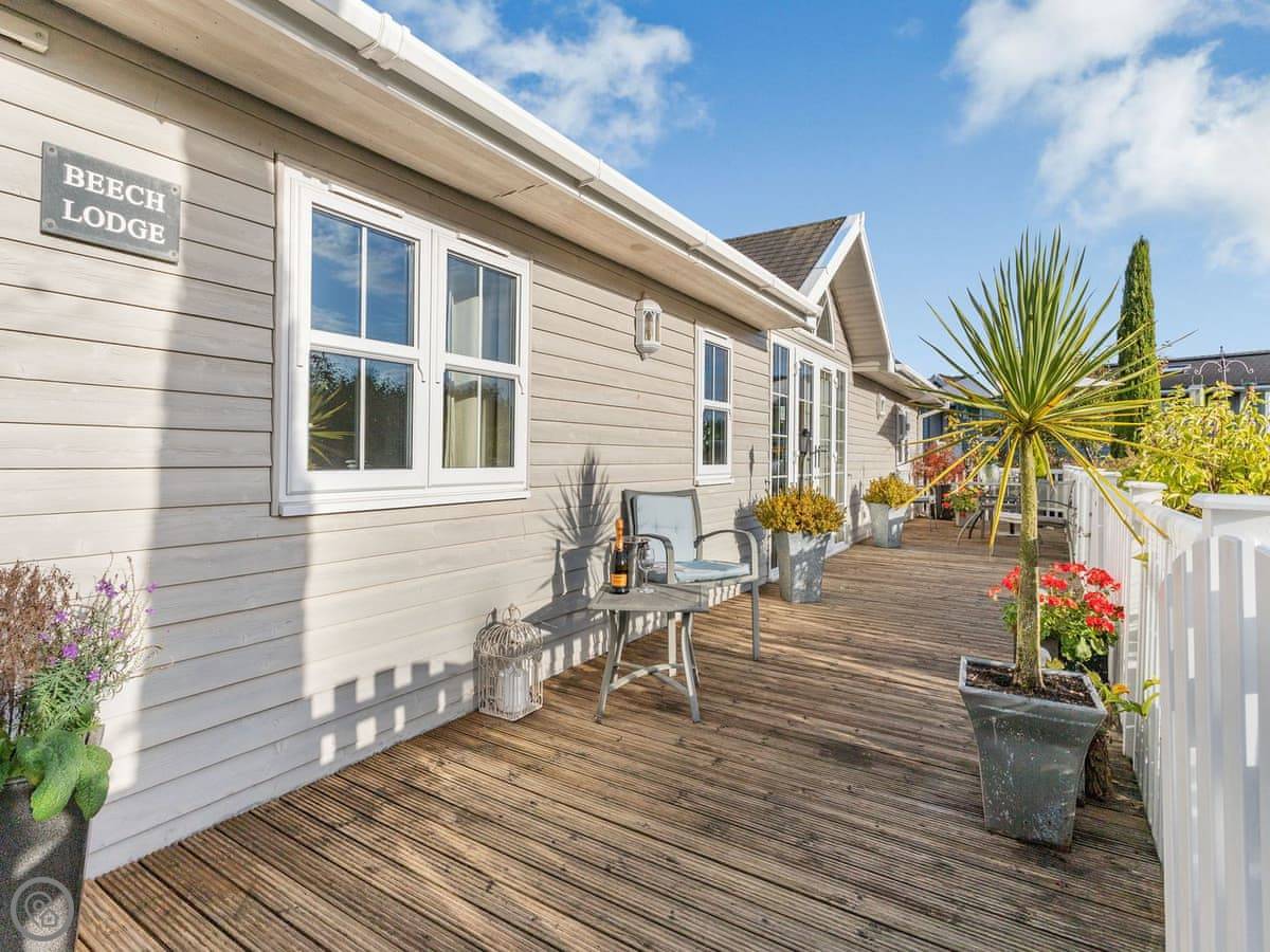 Inside, the lodge is equipped with everything you may need to make your stay enjoyable, including microwave, dishwasher, fibre broadband, Smart TV and fire stick providing access to your own Netflix, Amazon, Amazon music and Disney accounts. The attractive spacious open plan living space provides comfortable seating and dining, overlooking the outside veranda. The appealing layout of the lodge includes two spacious bedrooms, one each side of the central living area. One bedroom has a kingsize bed and en-suite bathroom with roll-top bath, while the other bedroom has a double bed and a single bed with spacious en-suite shower. Both bedrooms have large, adjoining walk-in closets where you will find hanging space and baby equipment. The owners have also provided a cool bag, rug and picnic set to use for days out, or even just a stroll to the park area with its variety of trees and picnic benches.