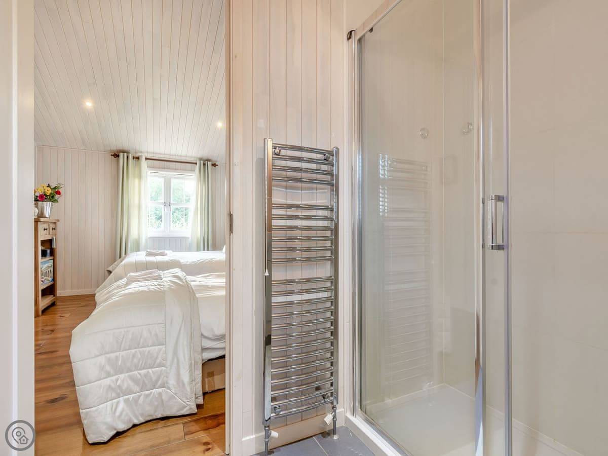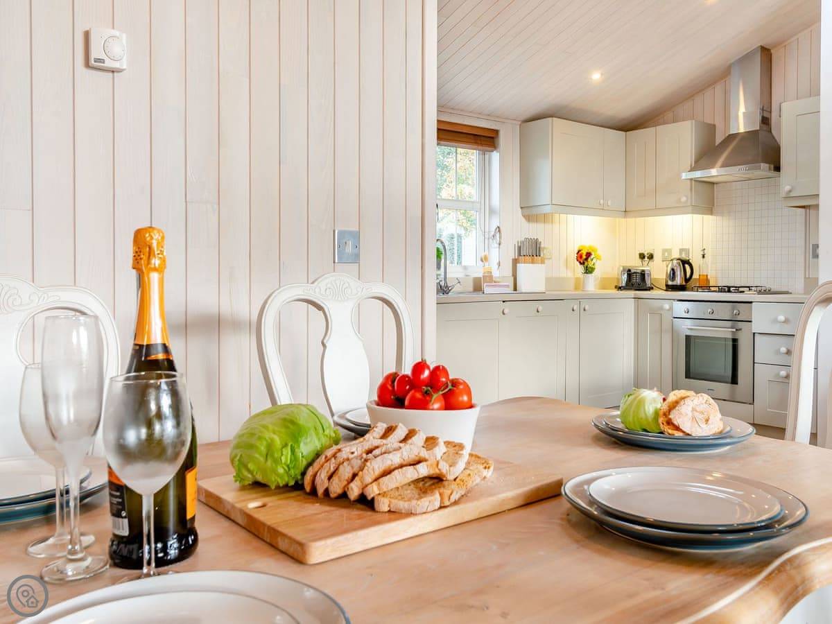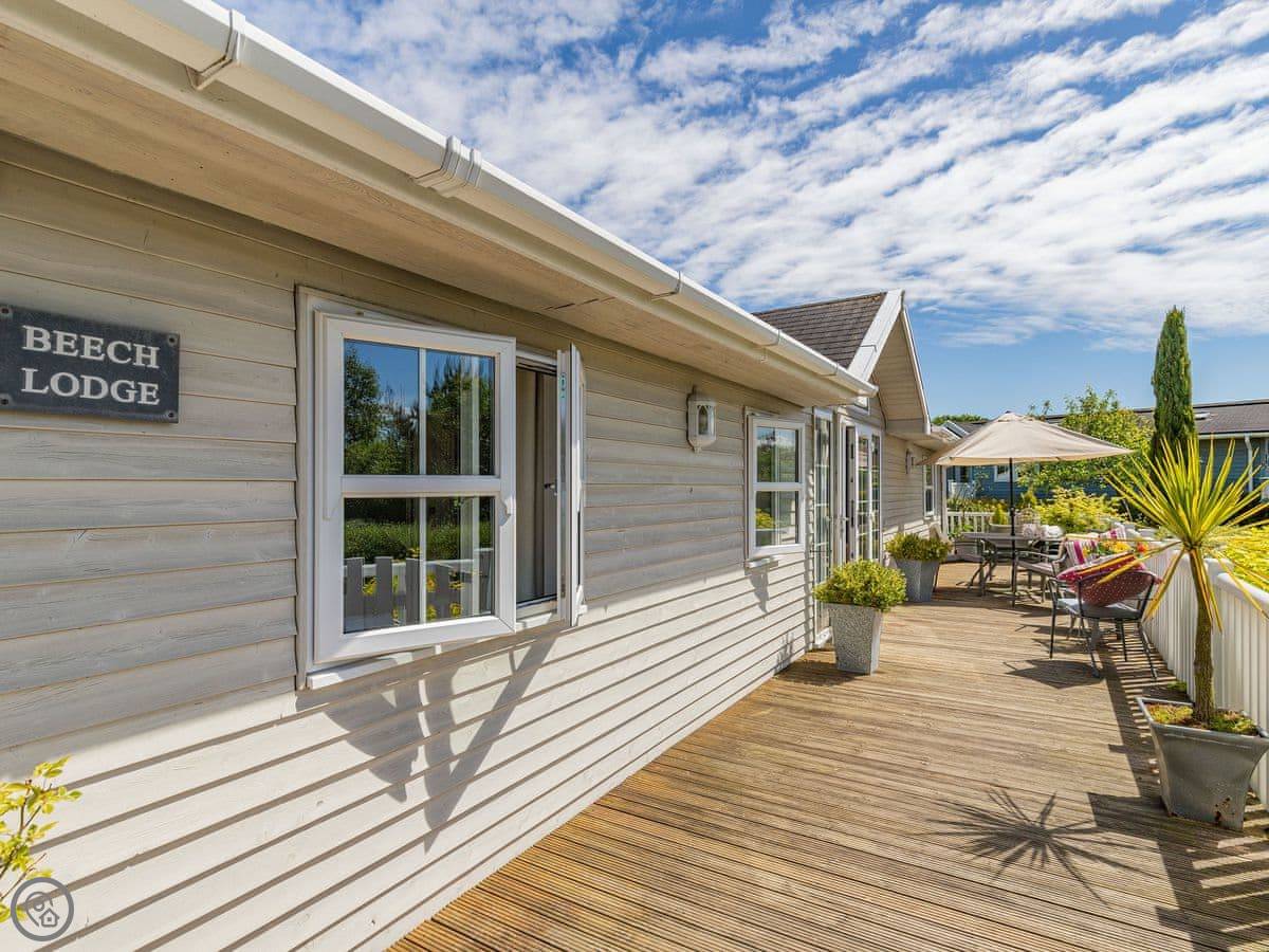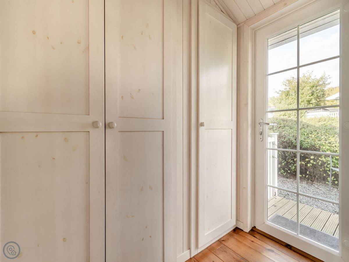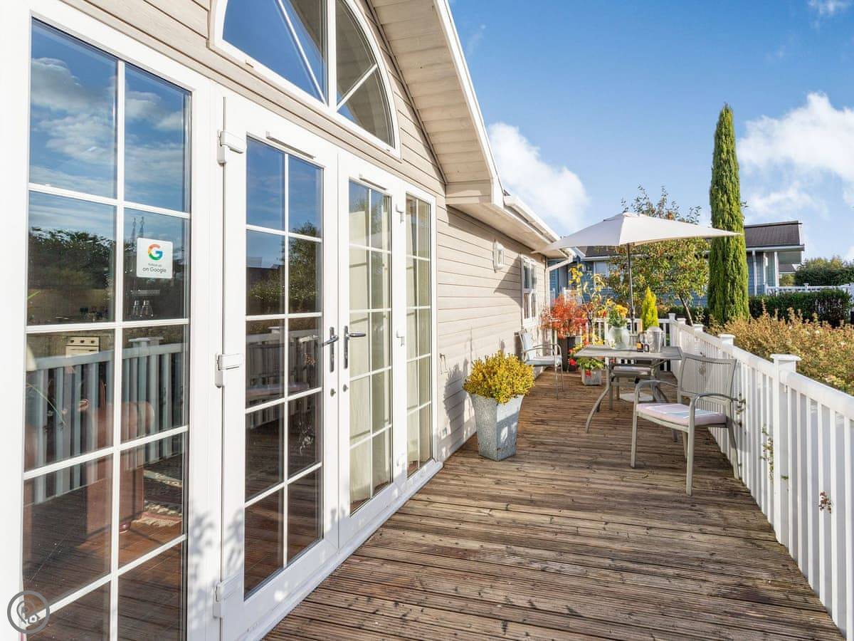 Inside, the lodge is equipped with everything you may need to make your stay enjoyable, including microwave, dishwasher, fibre broadband, Smart TV and fire stick providing access to your own Netflix, Amazon, Amazon music and Disney accounts. The attractive spacious open plan living space provides comfortable seating and dining, overlooking the outside veranda. The appealing layout of the lodge includes two spacious bedrooms, one each side of the central living area. One bedroom has a kingsize bed and en-suite bathroom with roll-top bath, while the other bedroom has a double bed and a single bed with spacious en-suite shower. Both bedrooms have large, adjoining walk-in closets where you will find hanging space and baby equipment. The owners have also provided a cool bag, rug and picnic set to use for days out, or even just a stroll to the park area with its variety of trees and picnic benches.