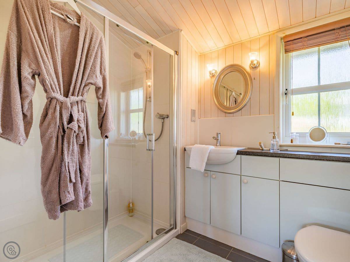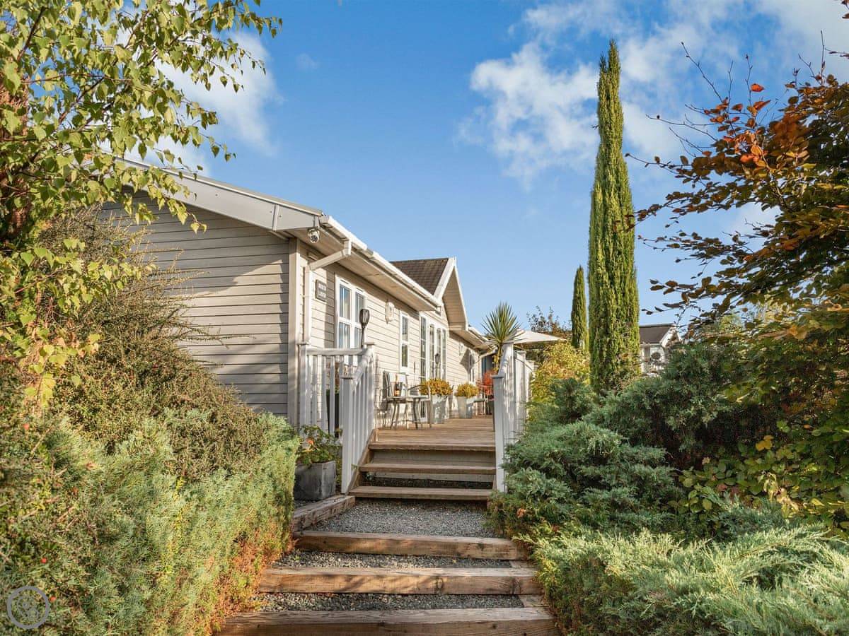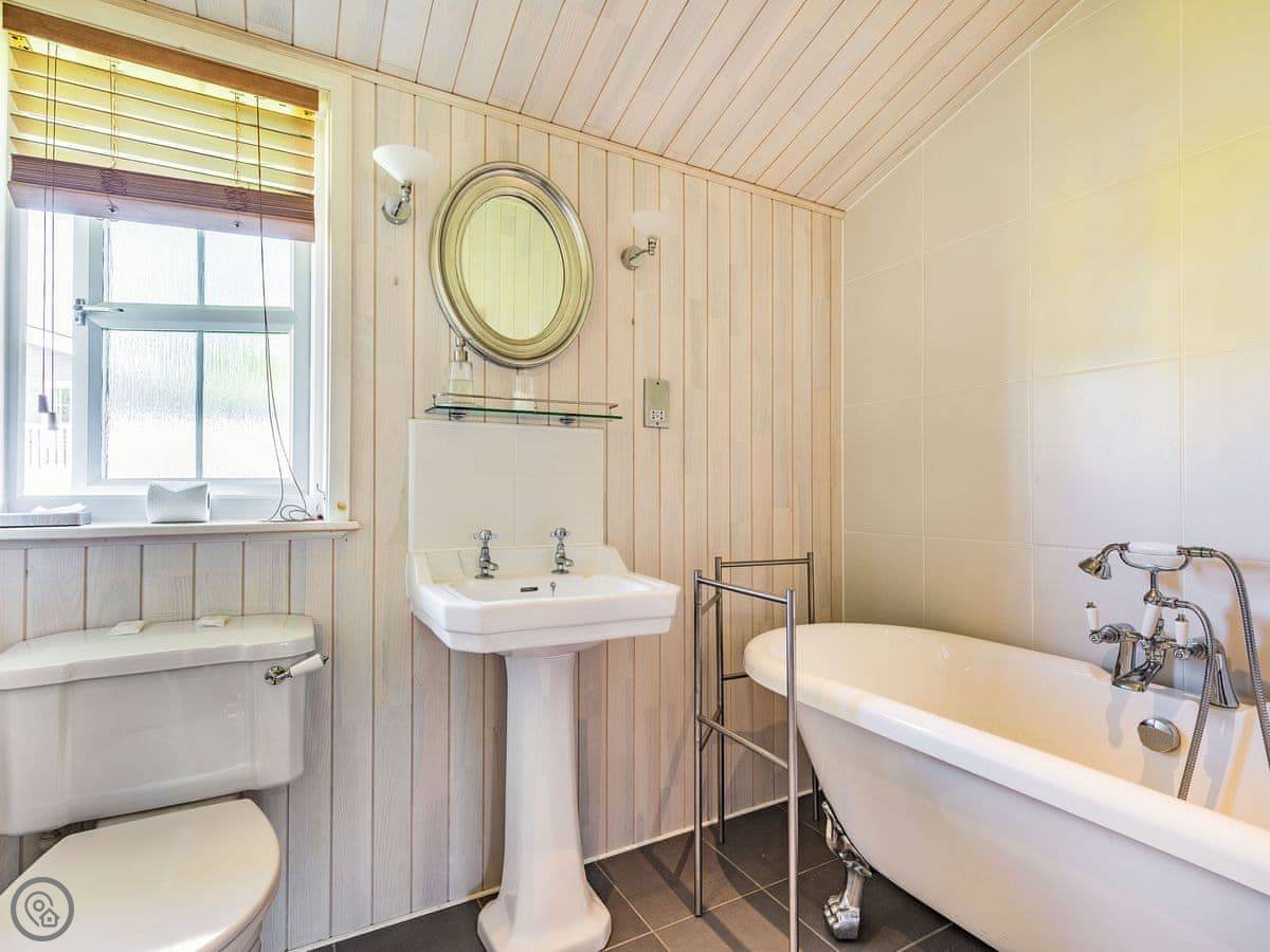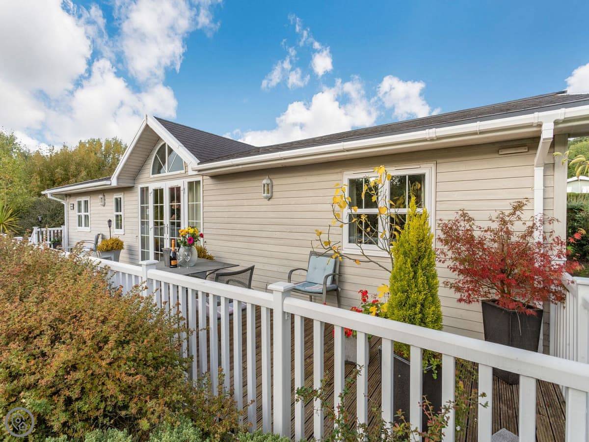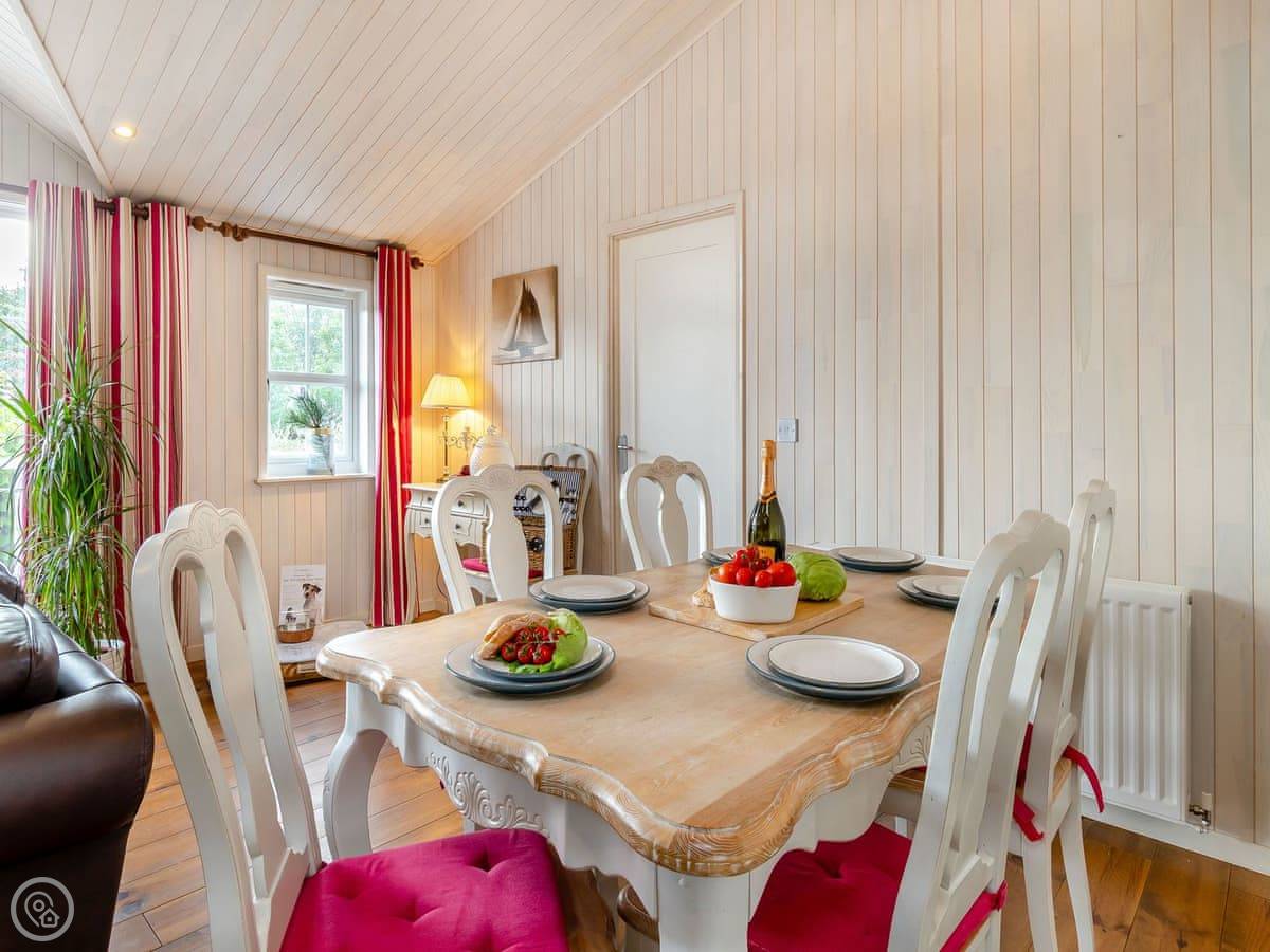 Inside, the lodge is equipped with everything you may need to make your stay enjoyable, including microwave, dishwasher, fibre broadband, Smart TV and fire stick providing access to your own Netflix, Amazon, Amazon music and Disney accounts. The attractive spacious open plan living space provides comfortable seating and dining, overlooking the outside veranda. The appealing layout of the lodge includes two spacious bedrooms, one each side of the central living area. One bedroom has a kingsize bed and en-suite bathroom with roll-top bath, while the other bedroom has a double bed and a single bed with spacious en-suite shower. Both bedrooms have large, adjoining walk-in closets where you will find hanging space and baby equipment. The owners have also provided a cool bag, rug and picnic set to use for days out, or even just a stroll to the park area with its variety of trees and picnic benches.