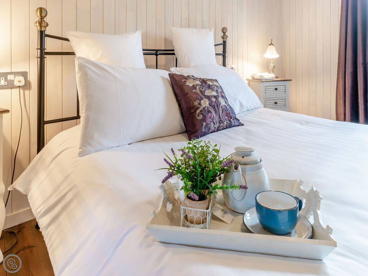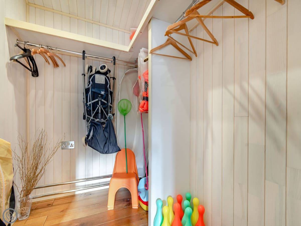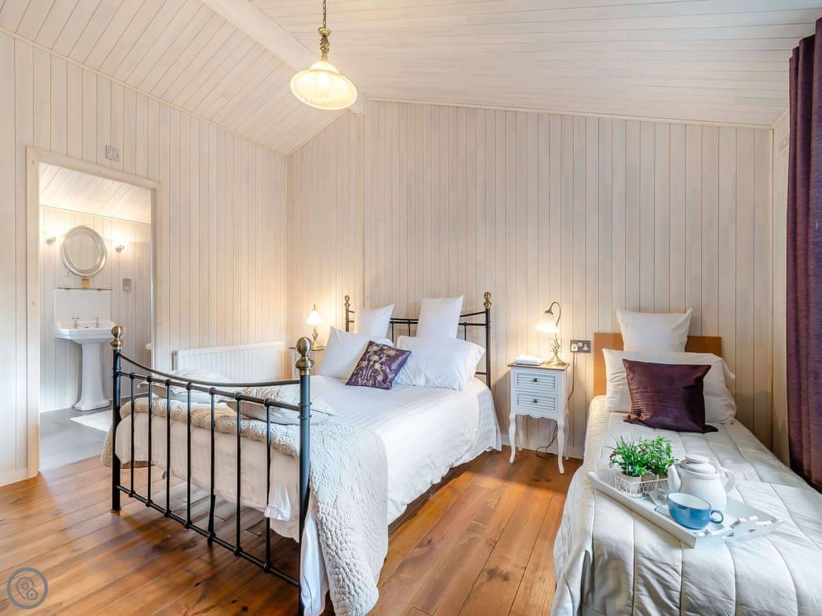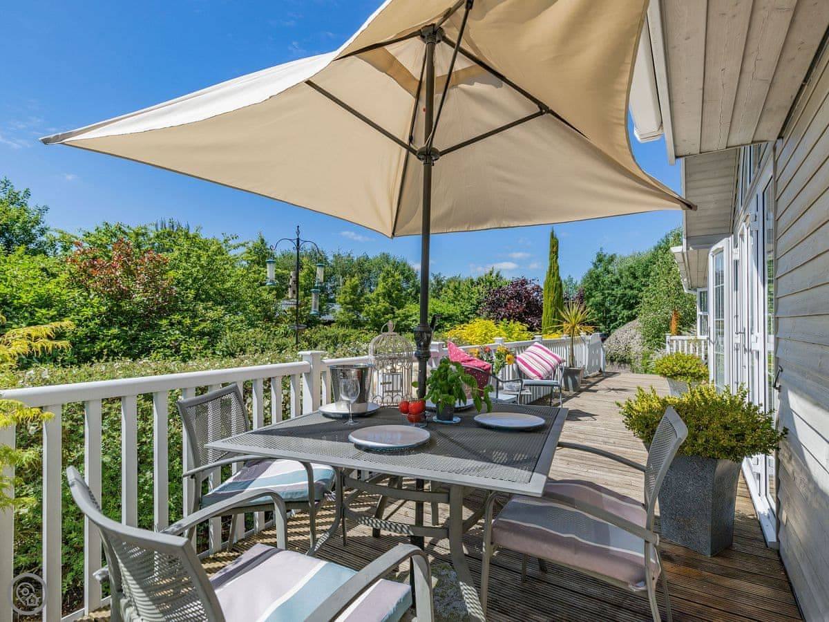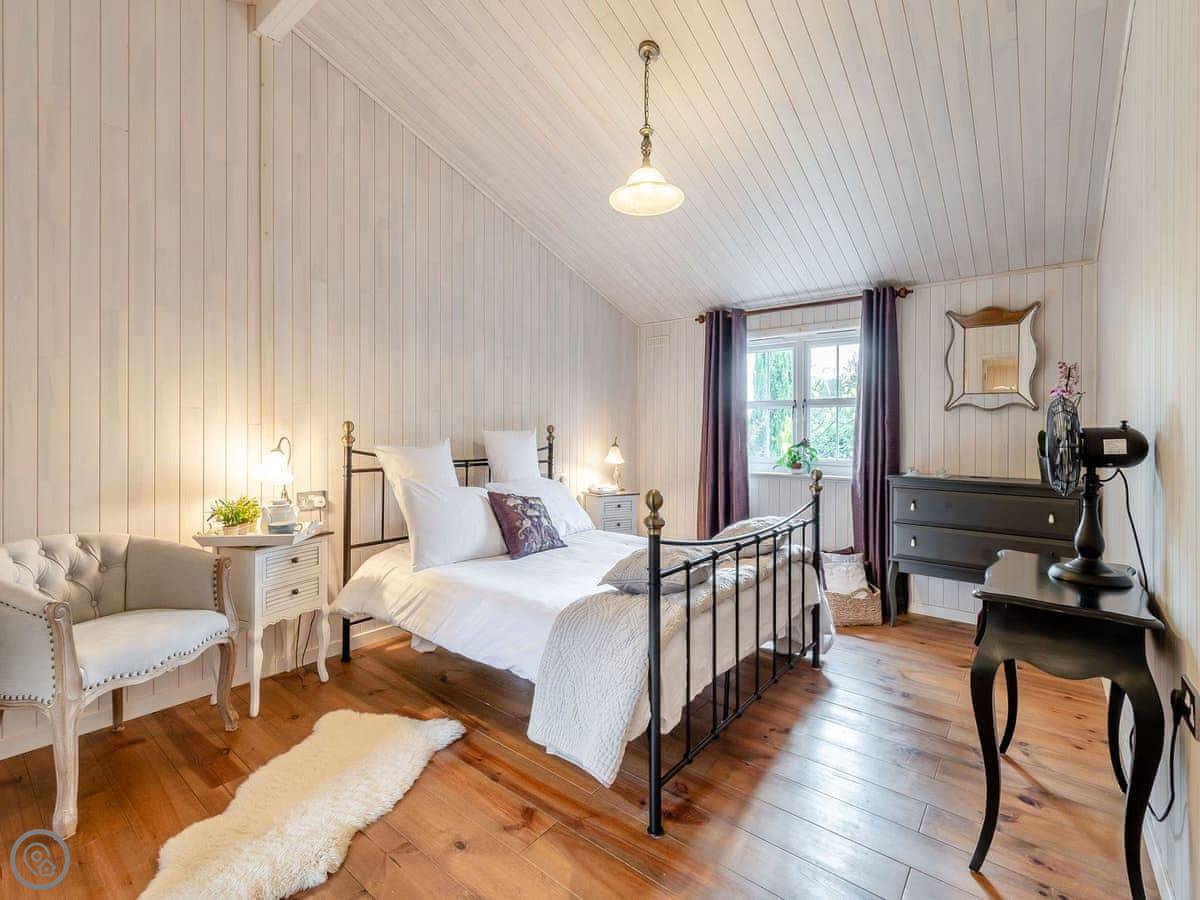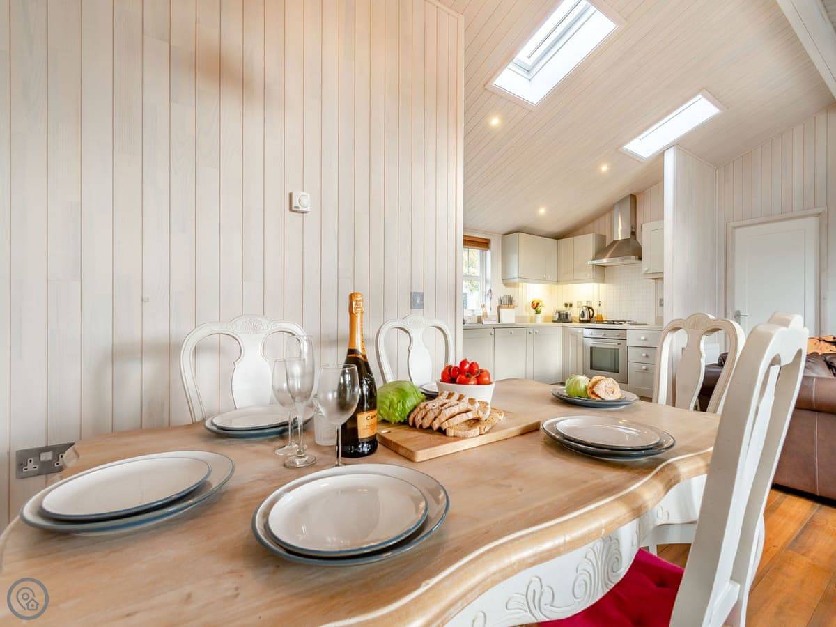 Inside, the lodge is equipped with everything you may need to make your stay enjoyable, including microwave, dishwasher, fibre broadband, Smart TV and fire stick providing access to your own Netflix, Amazon, Amazon music and Disney accounts. The attractive spacious open plan living space provides comfortable seating and dining, overlooking the outside veranda. The appealing layout of the lodge includes two spacious bedrooms, one each side of the central living area. One bedroom has a kingsize bed and en-suite bathroom with roll-top bath, while the other bedroom has a double bed and a single bed with spacious en-suite shower. Both bedrooms have large, adjoining walk-in closets where you will find hanging space and baby equipment. The owners have also provided a cool bag, rug and picnic set to use for days out, or even just a stroll to the park area with its variety of trees and picnic benches.