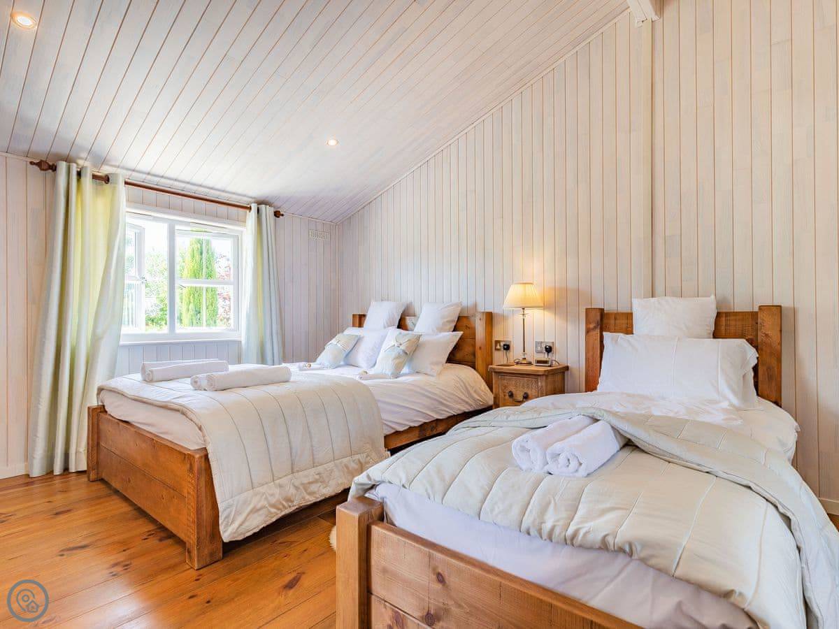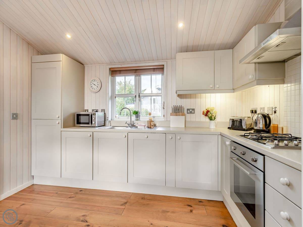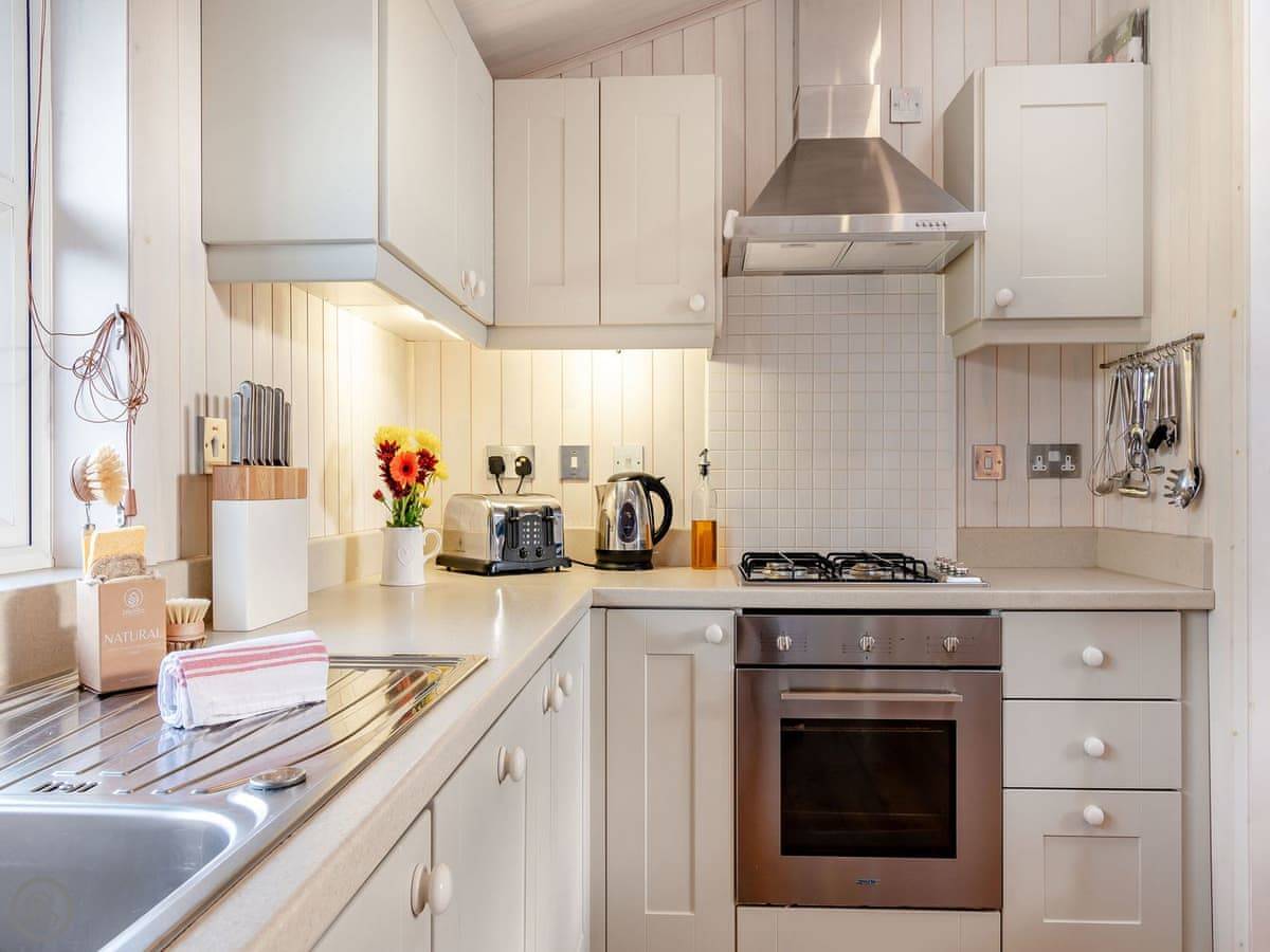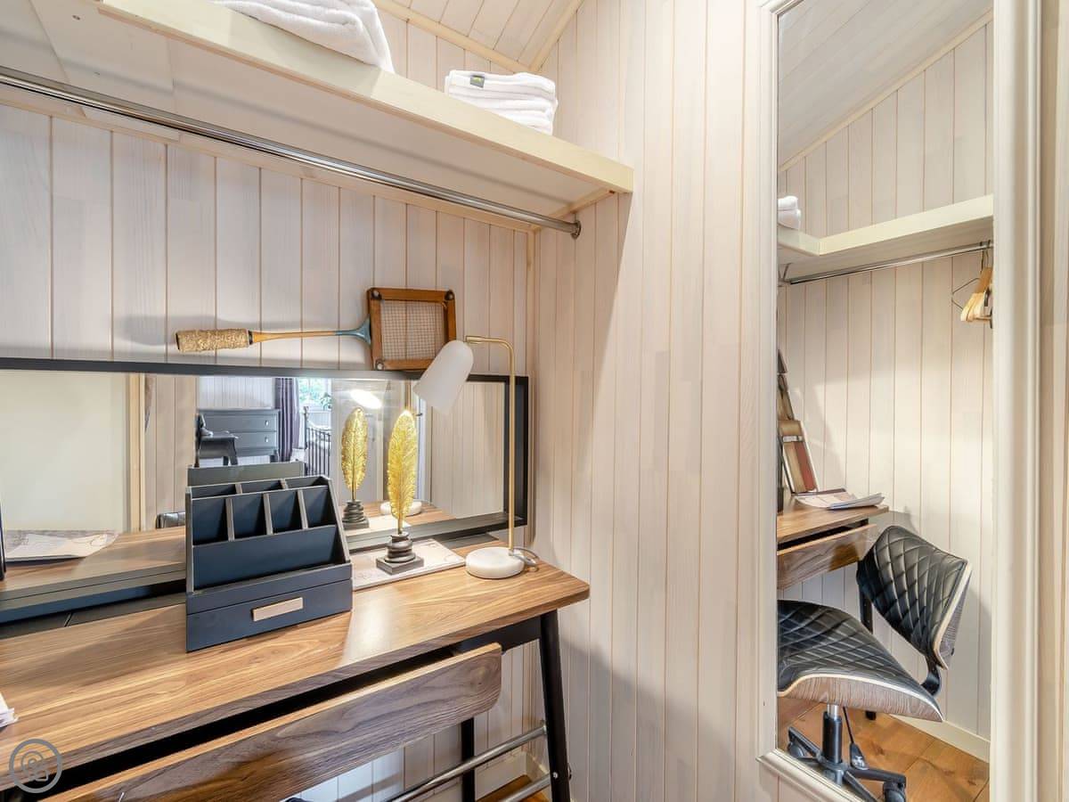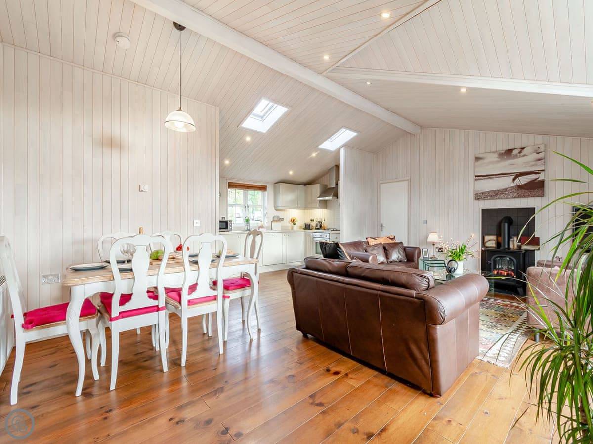Inside, the lodge is equipped with everything you may need to make your stay enjoyable, including microwave, dishwasher, fibre broadband, Smart TV and fire stick providing access to your own Netflix, Amazon, Amazon music and Disney accounts. The attractive spacious open plan living space provides comfortable seating and dining, overlooking the outside veranda. The appealing layout of the lodge includes two spacious bedrooms, one each side of the central living area. One bedroom has a kingsize bed and en-suite bathroom with roll-top bath, while the other bedroom has a double bed and a single bed with spacious en-suite shower. Both bedrooms have large, adjoining walk-in closets where you will find hanging space and baby equipment. The owners have also provided a cool bag, rug and picnic set to use for days out, or even just a stroll to the park area with its variety of trees and picnic benches.
