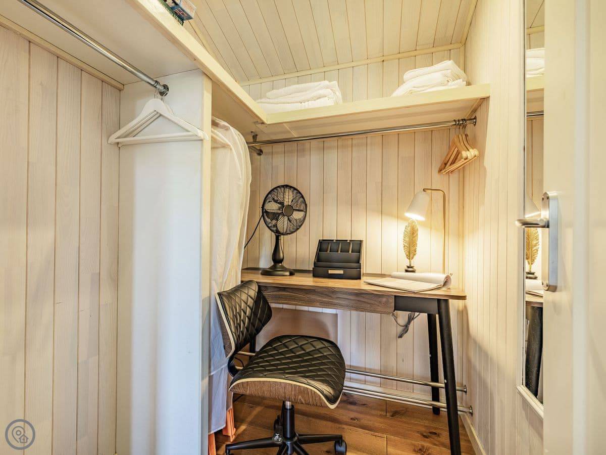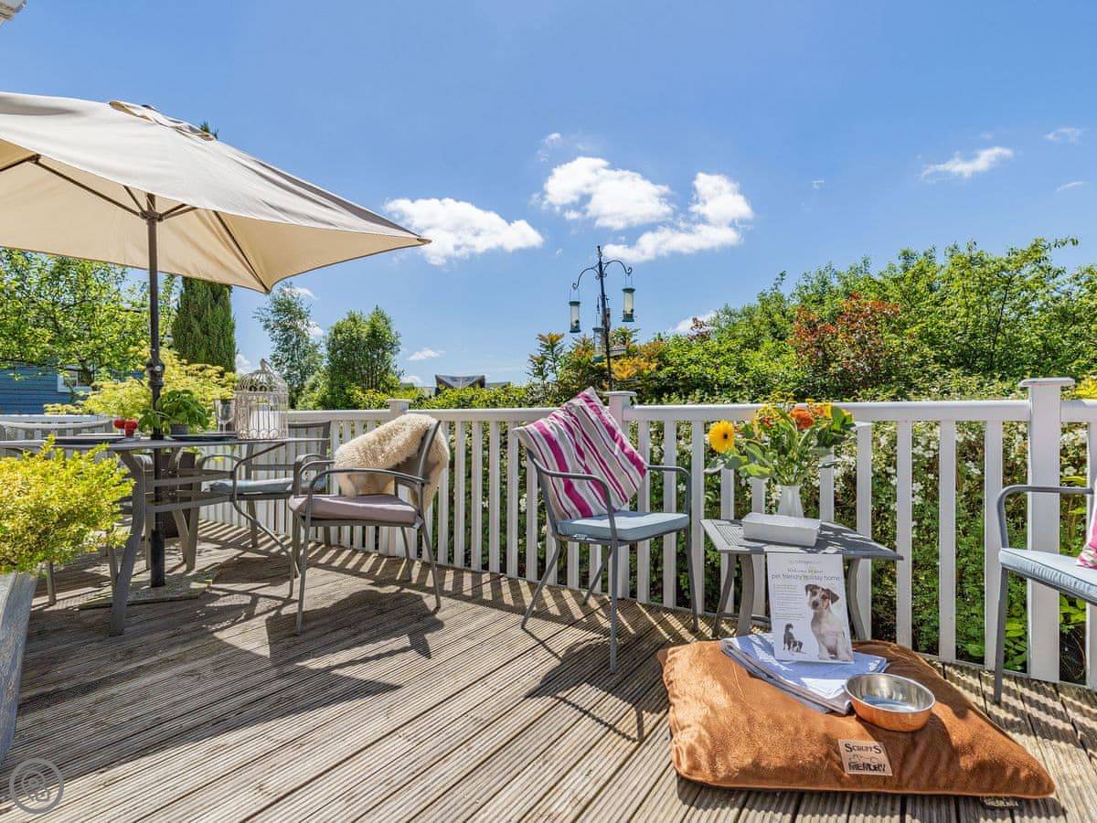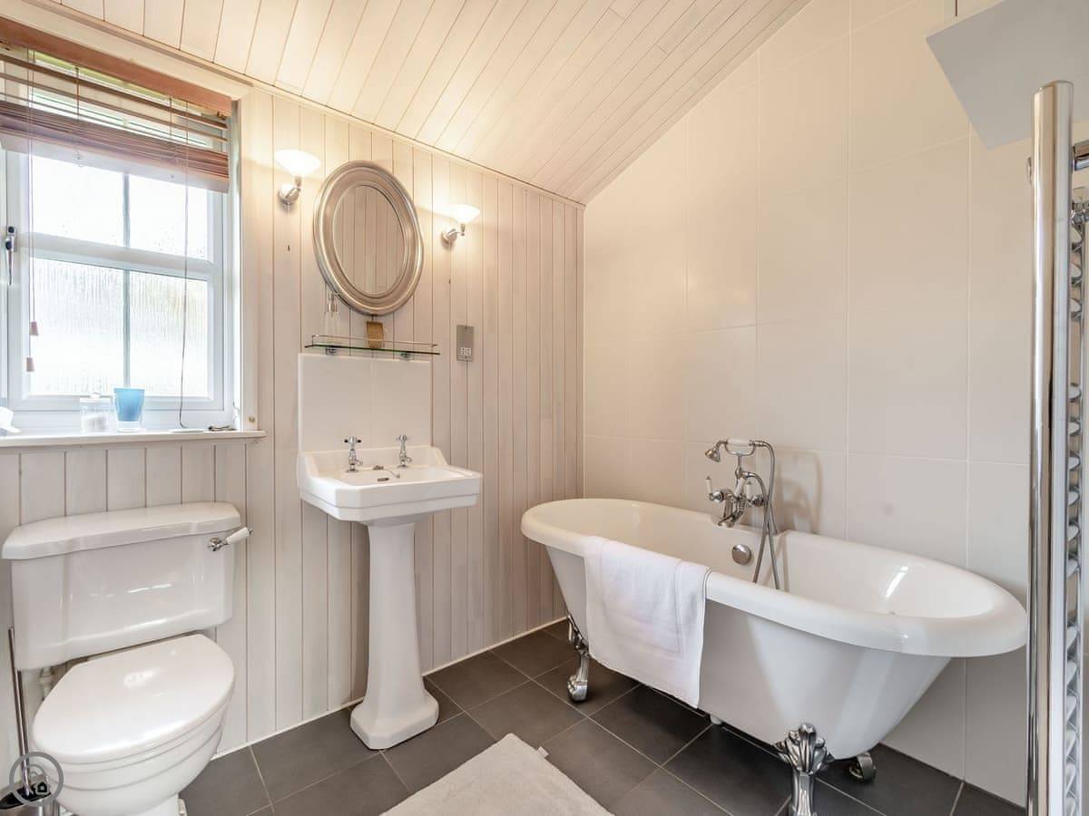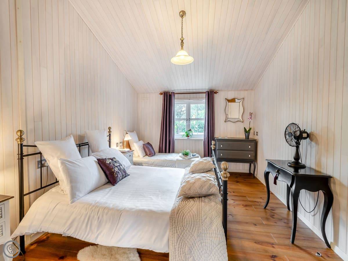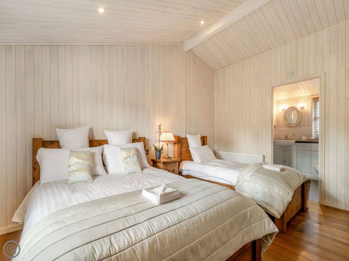 Inside, the lodge is equipped with everything you may need to make your stay enjoyable, including microwave, dishwasher, fibre broadband, Smart TV and fire stick providing access to your own Netflix, Amazon, Amazon music and Disney accounts. The attractive spacious open plan living space provides comfortable seating and dining, overlooking the outside veranda. The appealing layout of the lodge includes two spacious bedrooms, one each side of the central living area. One bedroom has a kingsize bed and en-suite bathroom with roll-top bath, while the other bedroom has a double bed and a single bed with spacious en-suite shower. Both bedrooms have large, adjoining walk-in closets where you will find hanging space and baby equipment. The owners have also provided a cool bag, rug and picnic set to use for days out, or even just a stroll to the park area with its variety of trees and picnic benches.