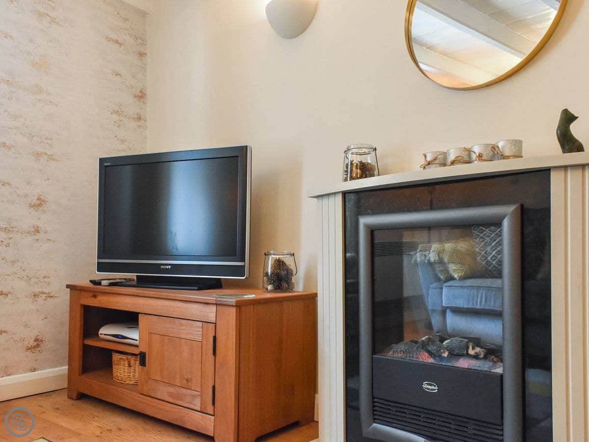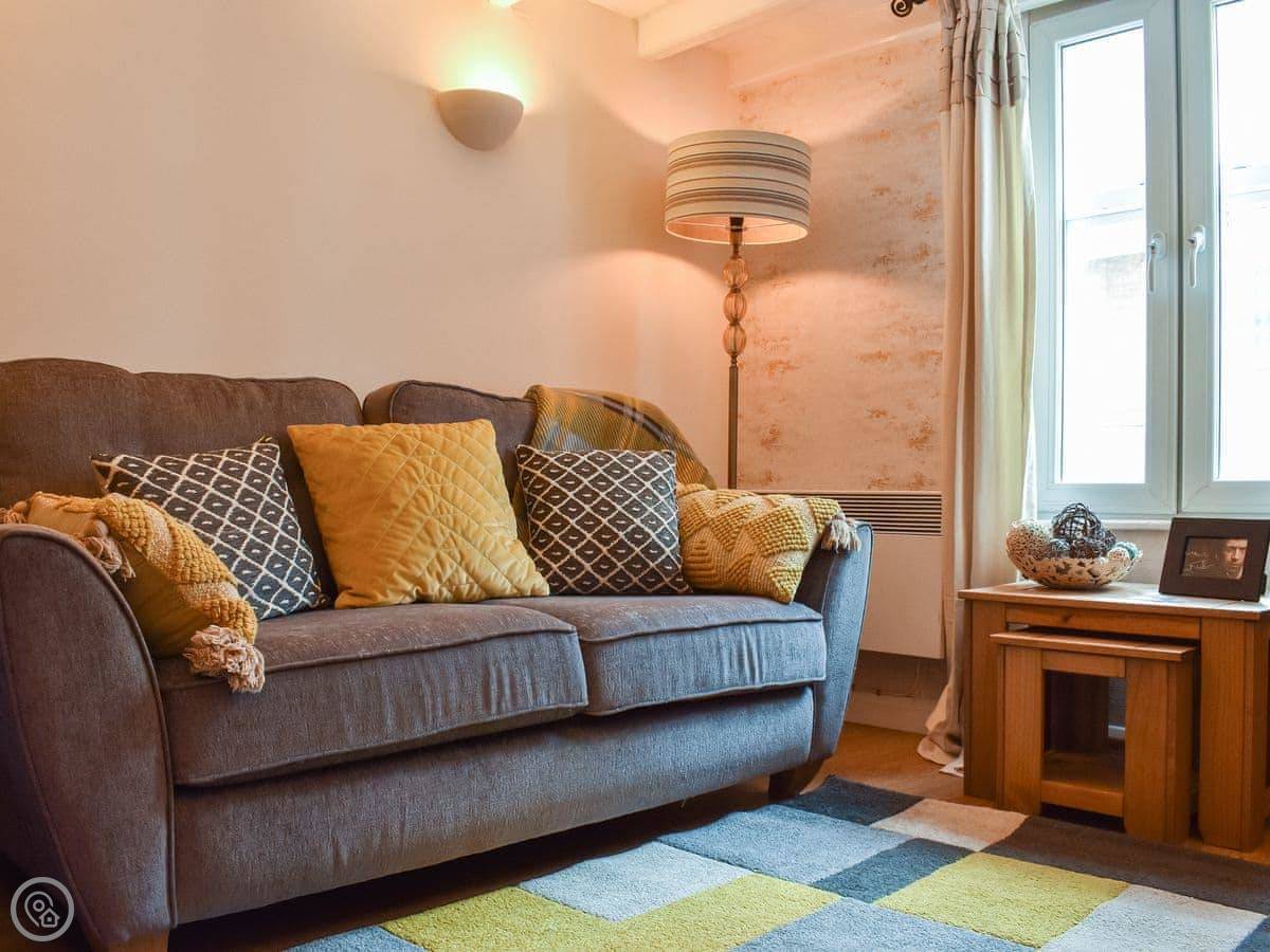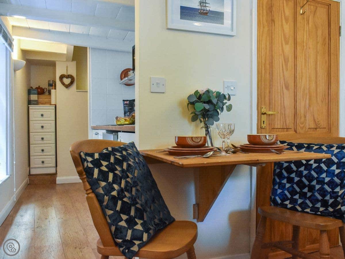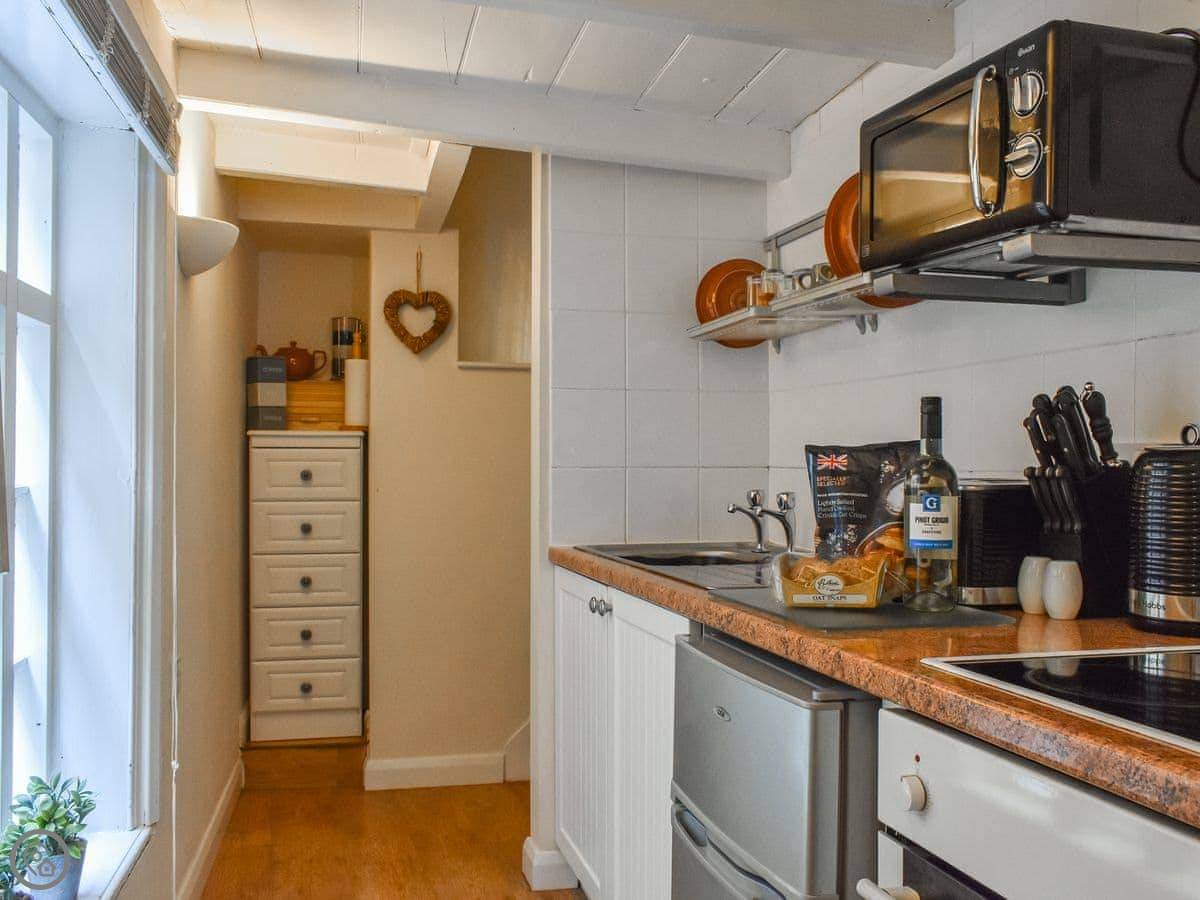 This quaint property has been lovingly refurnished throughout to provide guests with a welcoming and comfortable stay. On the ground floor there is a deli which is open through the day. Quaker House has its own separate entrance with stairs leading up to the open-plan living area, where you have a sofa in front of an electric fire and TV. Through an archway you have the kitchen which is compact yet well equipped with everything you could wish for, ready to whip up romantic meals to share. There is a fold-down table with two chairs, which is just the right size for couples.