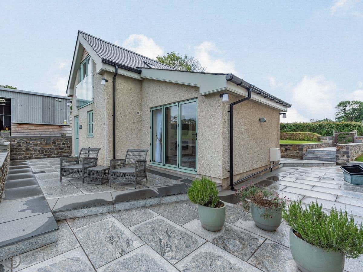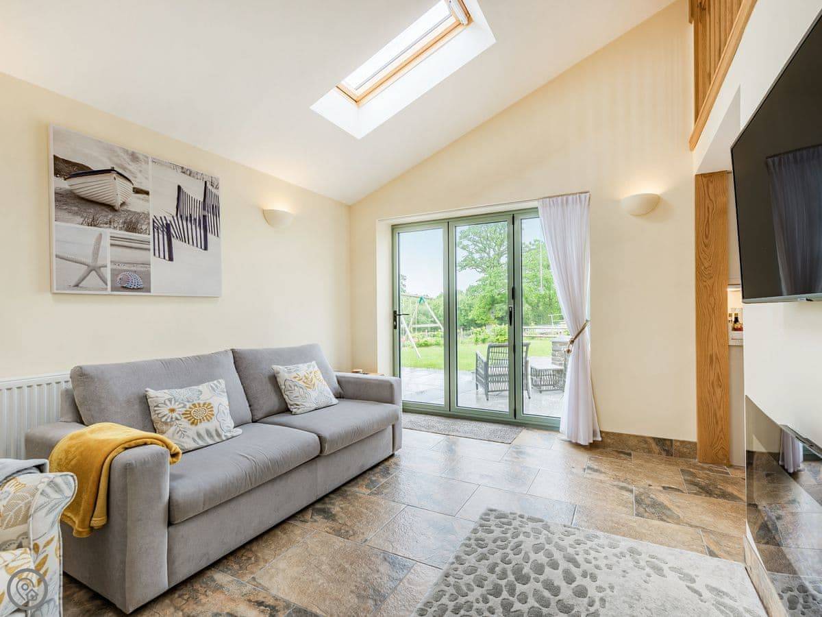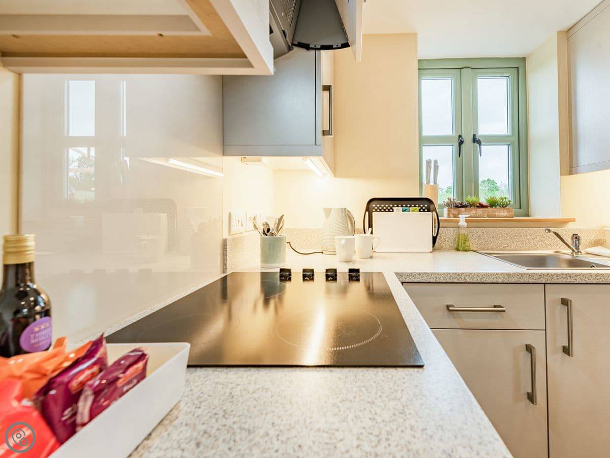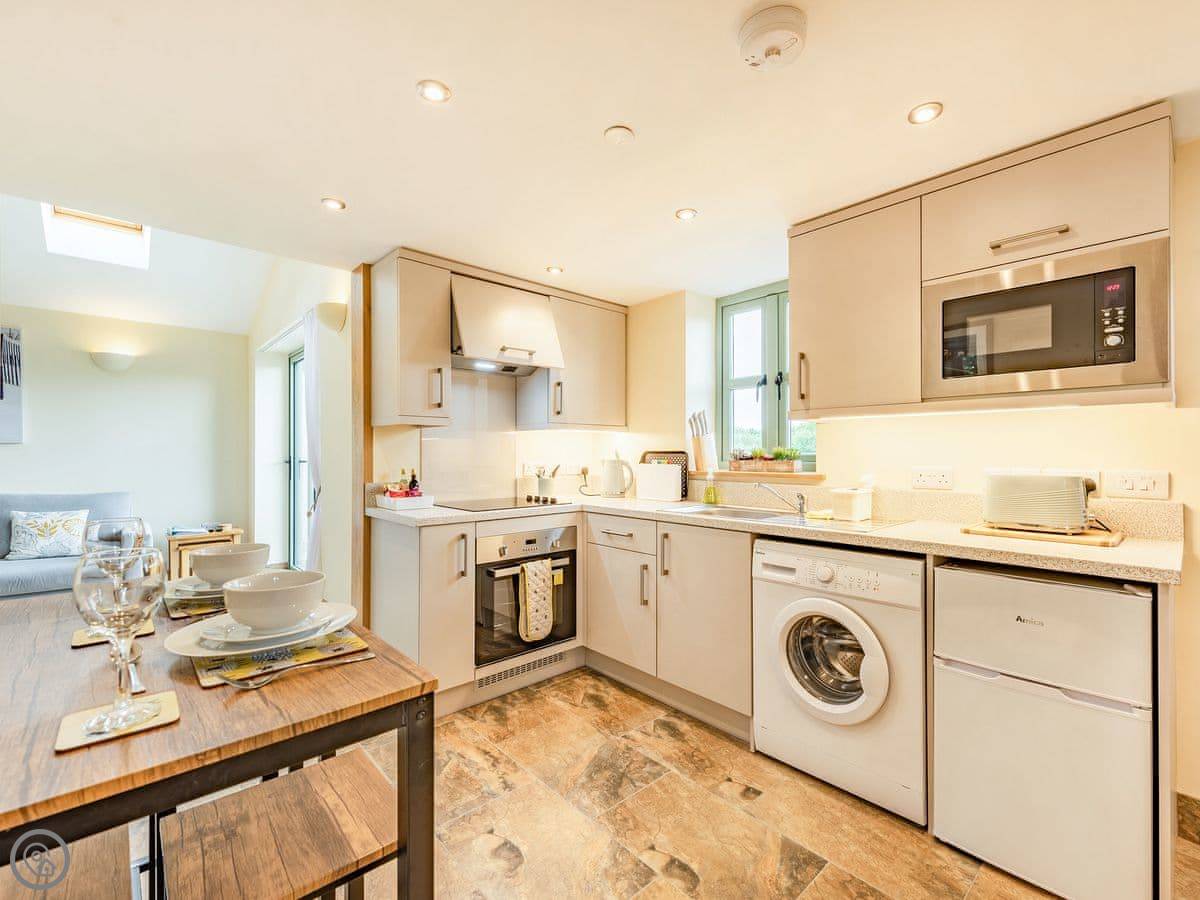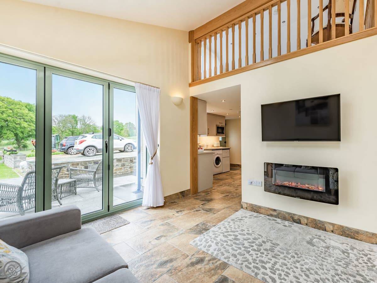 Inside, it's open plan. The kitchen has an electric oven and hob, a fridge freezer, microwave, and a washing machine. The living space has bifolding doors that open onto the patio. There's a Smart TV and WiFi. We have an electric vehicle charger on site you can use.