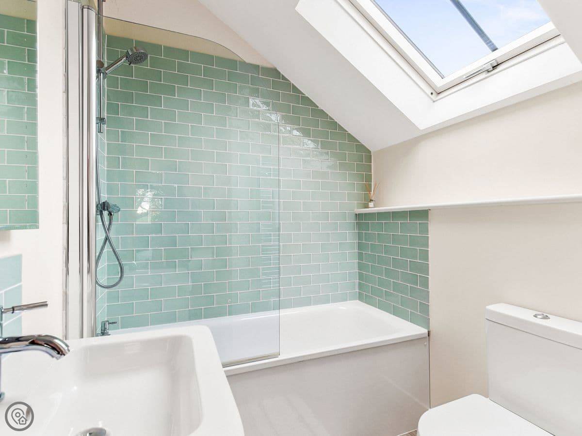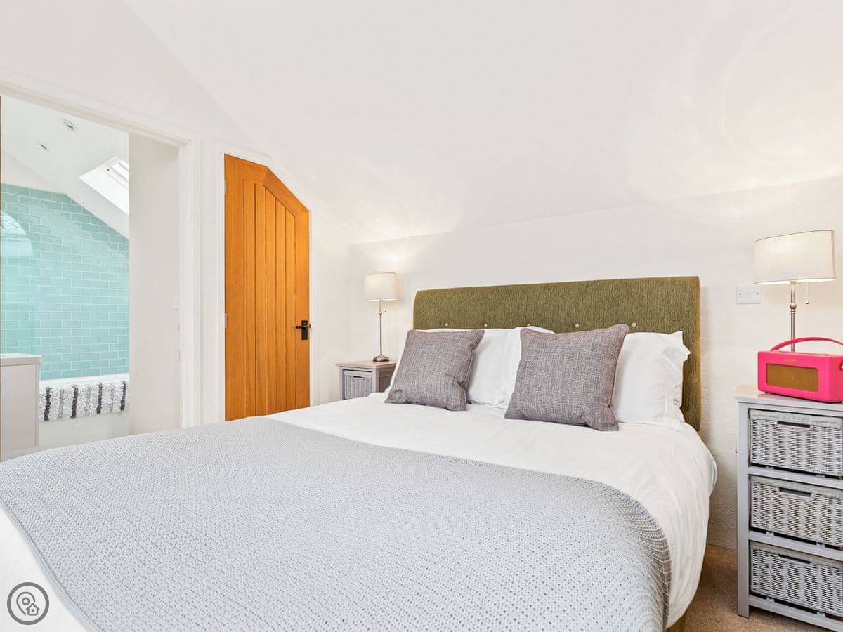 It's a five-star place, which means it's really well finished. Everything feels new and works properly. You've got underfloor heating and a wood burner. The bedroom is up on a mezzanine floor above the living area, so it's open plan. The en-suite bathroom has a shower over the bath.