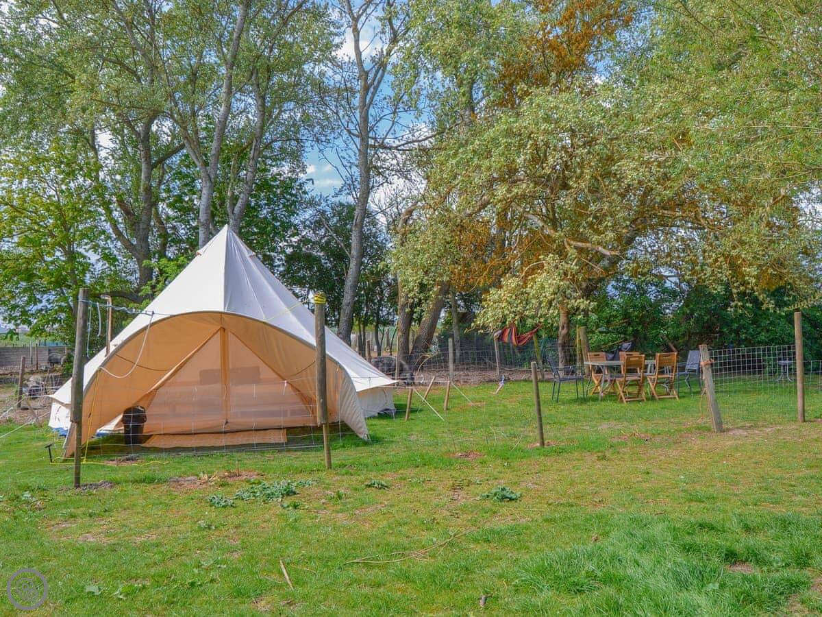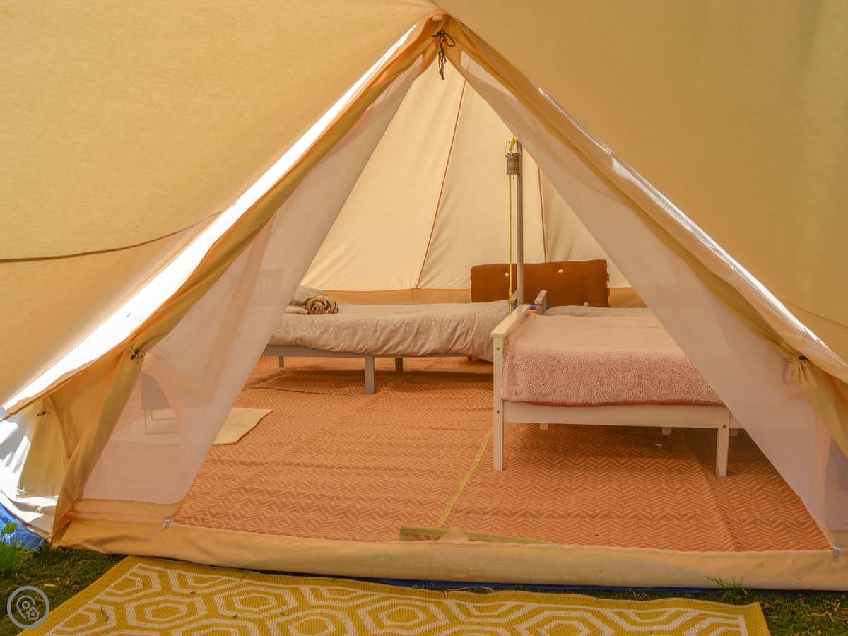 The bell tents come with a private WC and a great cooked breakfast is delivered to you on hostess trolley each morning free of charge. Cotton Wood sleeps up to four persons with a full size double bed, and four single beds. Whilst Willow sleeps up to five persons with a full size double with two single beds and a futon bed.