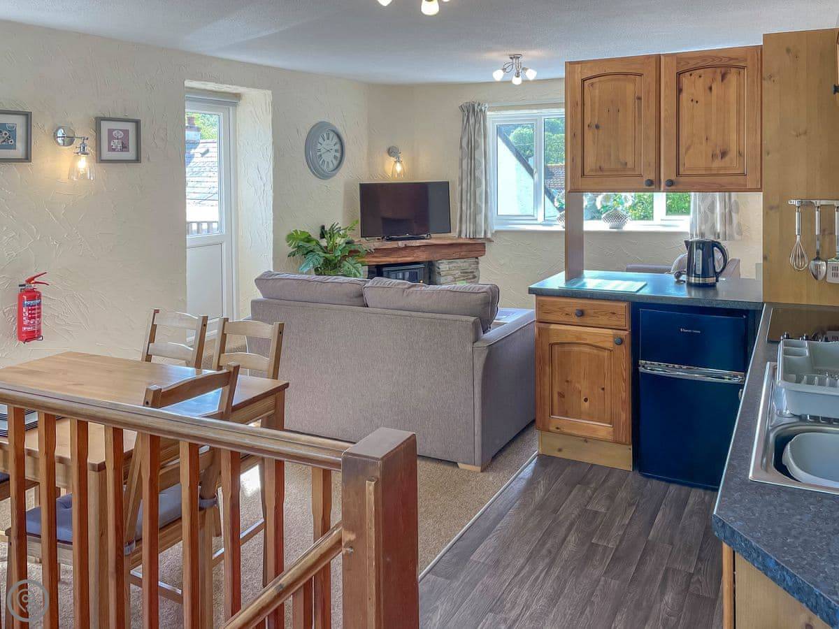 Upstairs is all open plan: living room, dining area, and kitchen with a dishwasher. There's a Smart TV. The best bit is the sun terrace at the front. It gets the sun from morning until late afternoon. There's outdoor furniture out there.