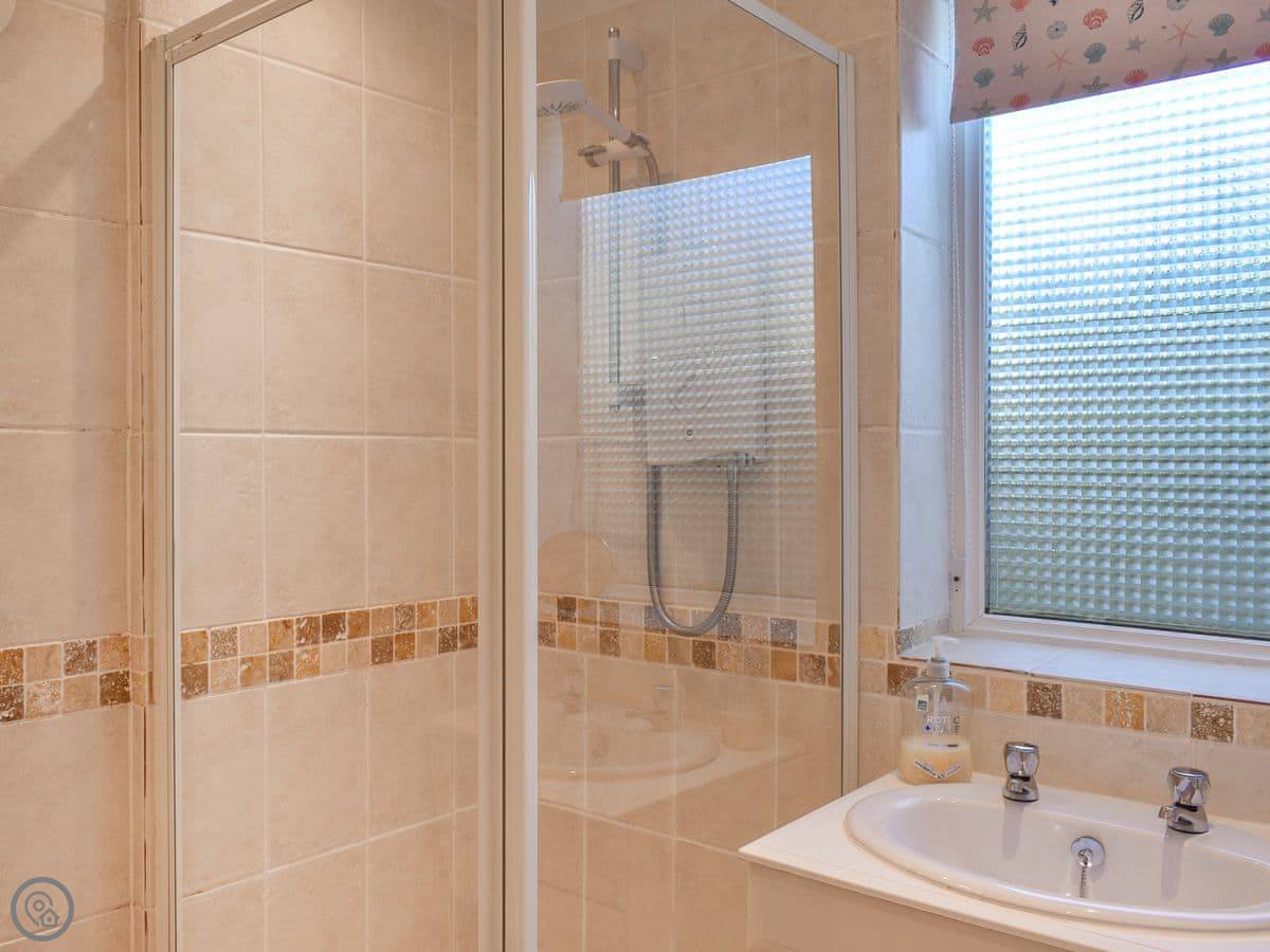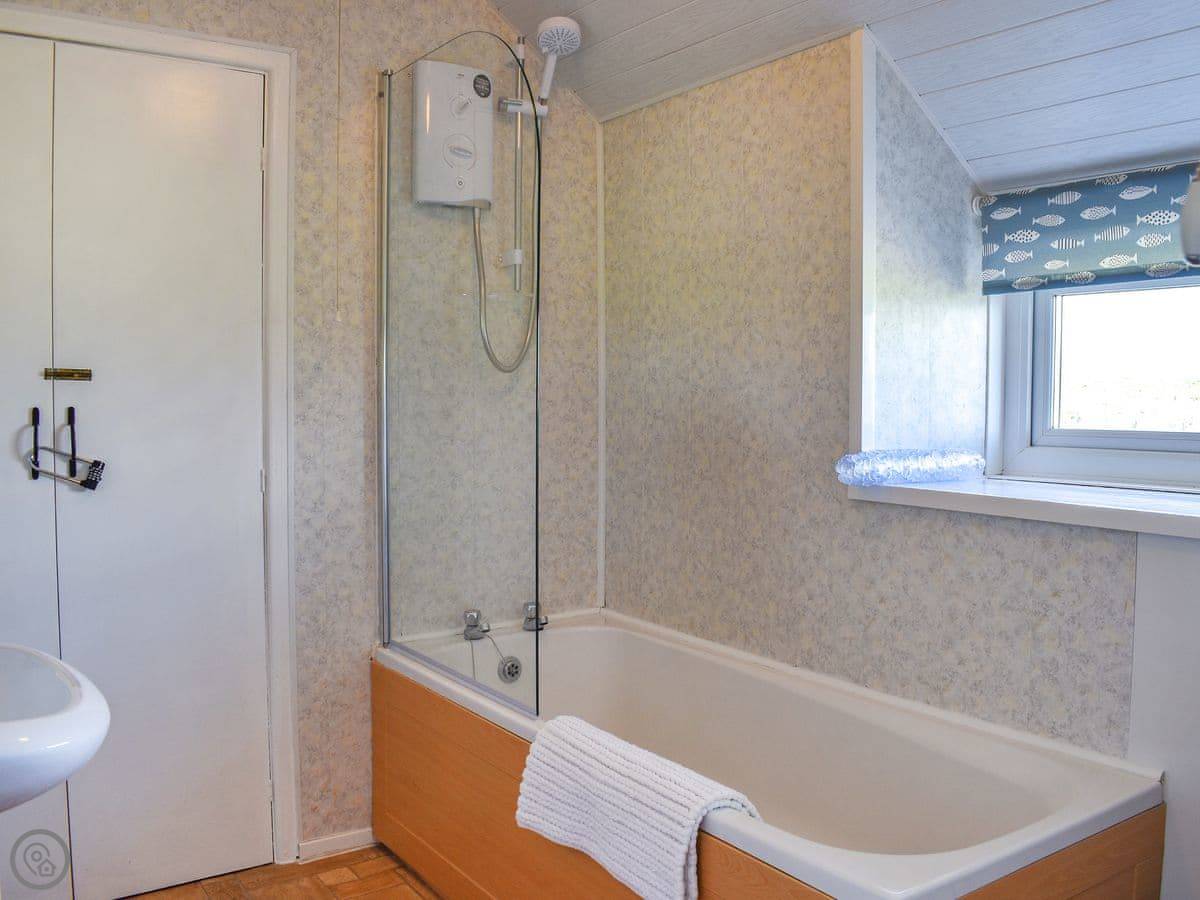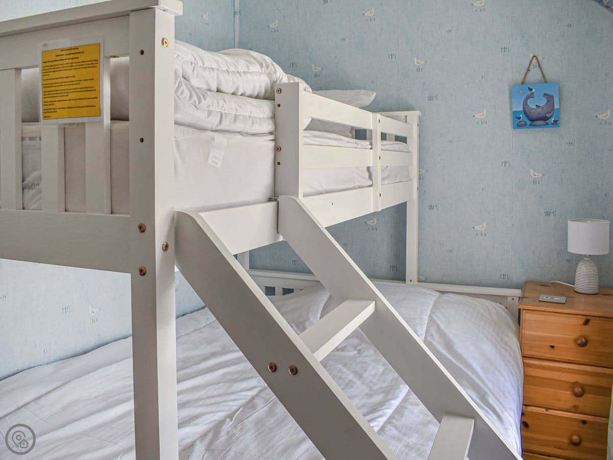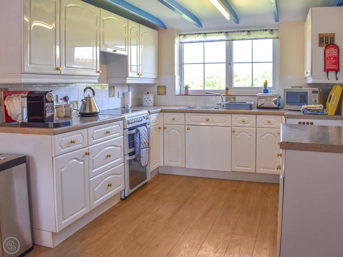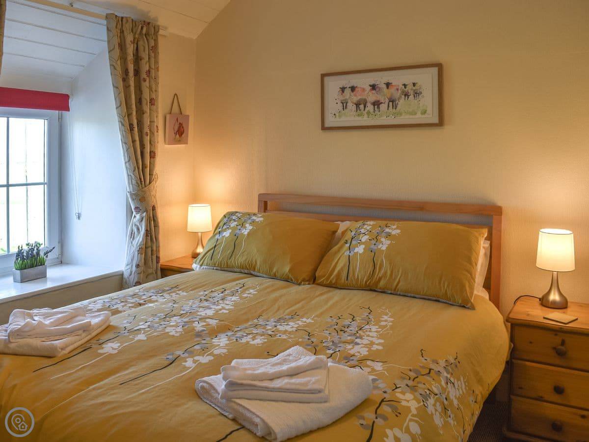 It sleeps six, in three bedrooms. There are two bathrooms, which helps. It's got a 4 Star rating. It's well equipped and comfortable. The entrance and downstairs are wheelchair accessible. The stairs inside are a standard cottage staircase, not a spiral or anything.