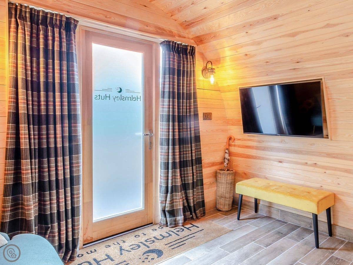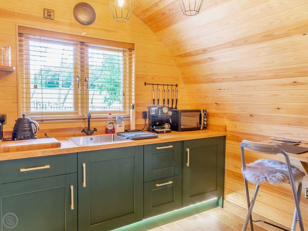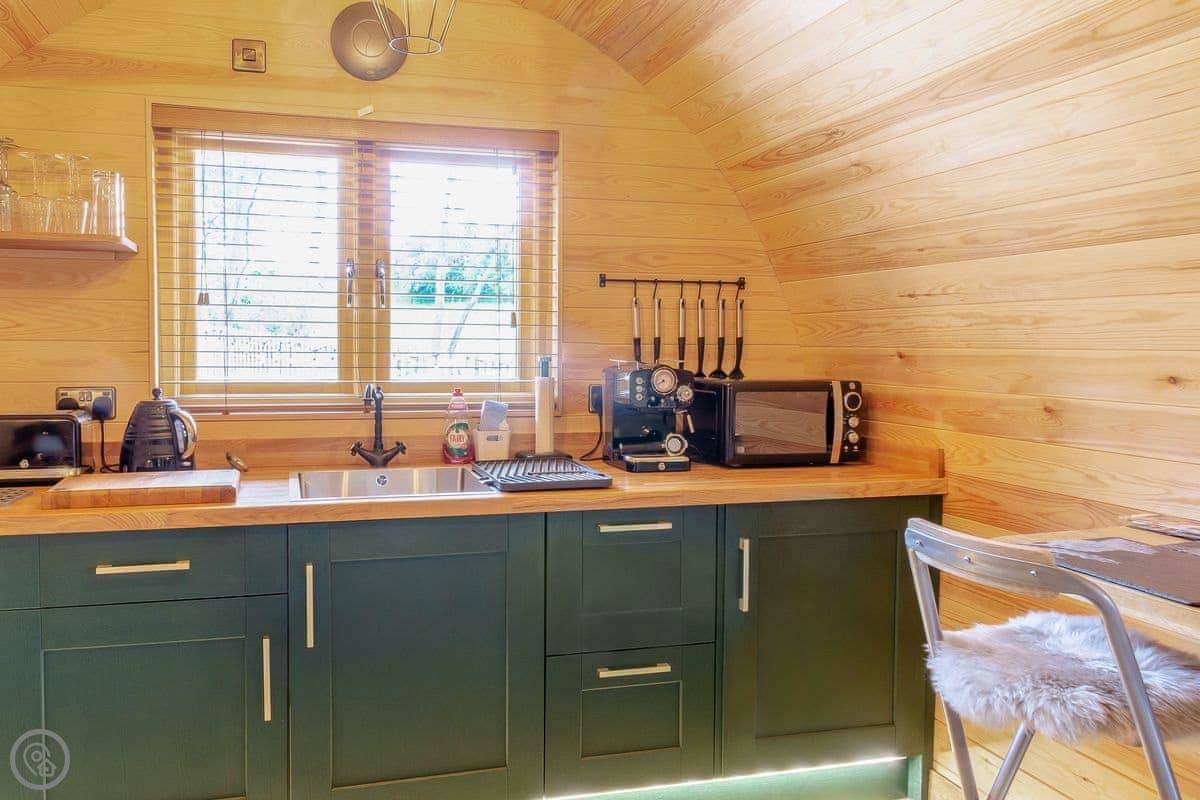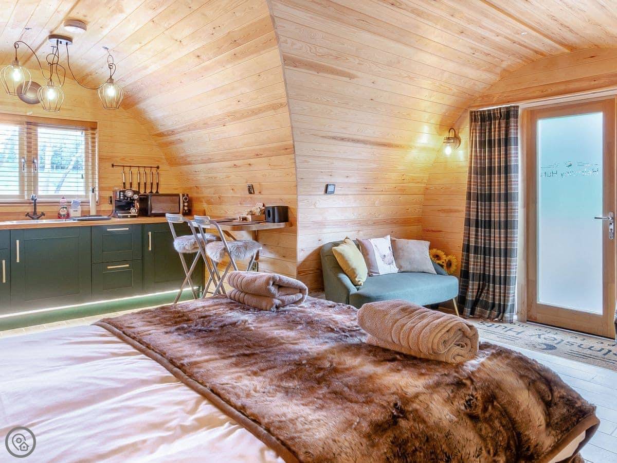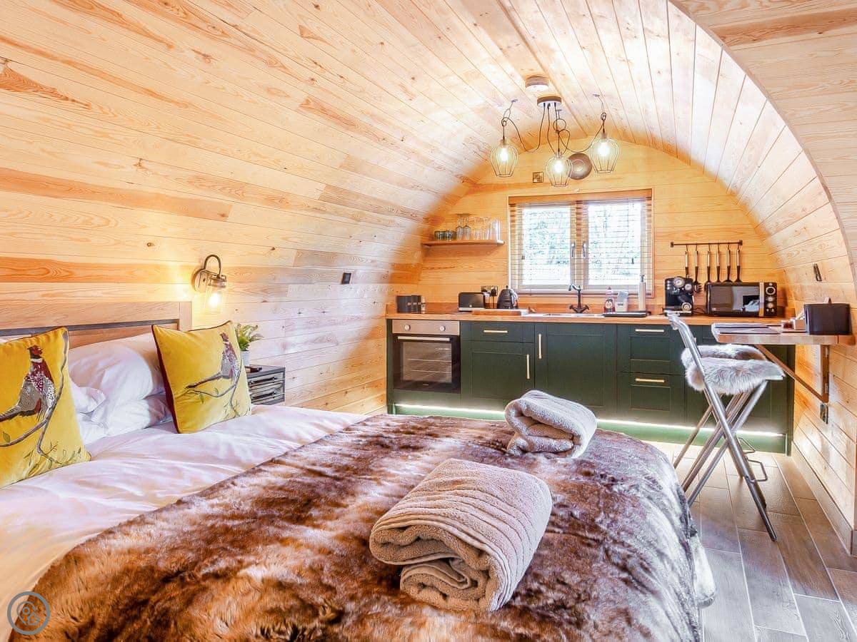 The living area boasts comfortable seating and a pull out 45” Smart TV giving an excellent place to relax after a day exploring the wonderful North York Moors National Park. Over in the stylish kitchen area you can find all the essentials, and you will be able to prepare a meal in no time. With a plush king size bed you are guaranteed a perfect night’s sleep. Adjacent to the open plan area is a gorgeous bathroom complete with rain shower which is just what you need after a day walking and taking in the surrounding countryside. The owners also provide bathrobes, slippers, towels and handmade soaps in the bathroom and the lodge has its’ own seated dressing area with hairdryer, straighteners, and built-in wardrobe.