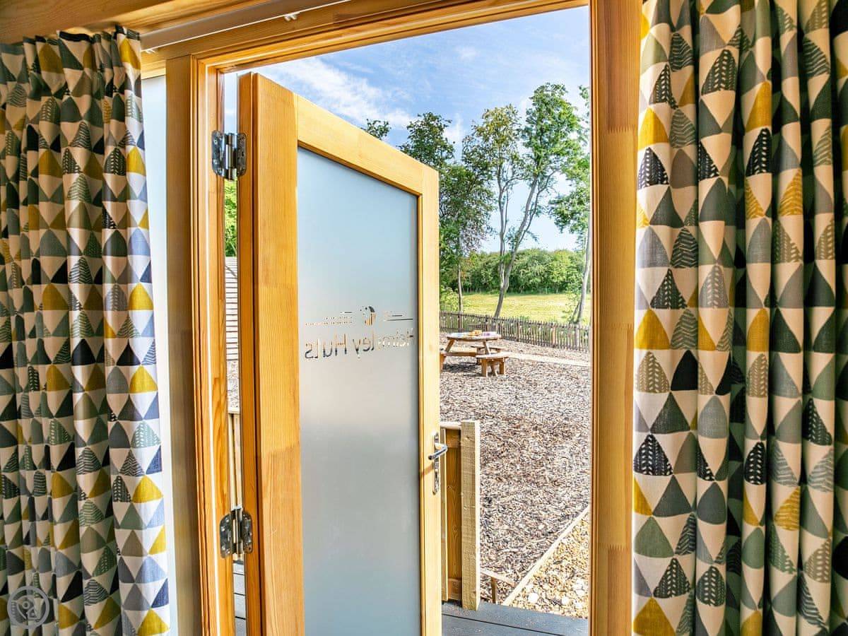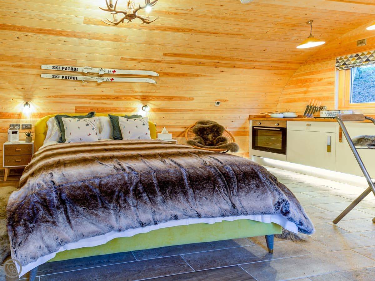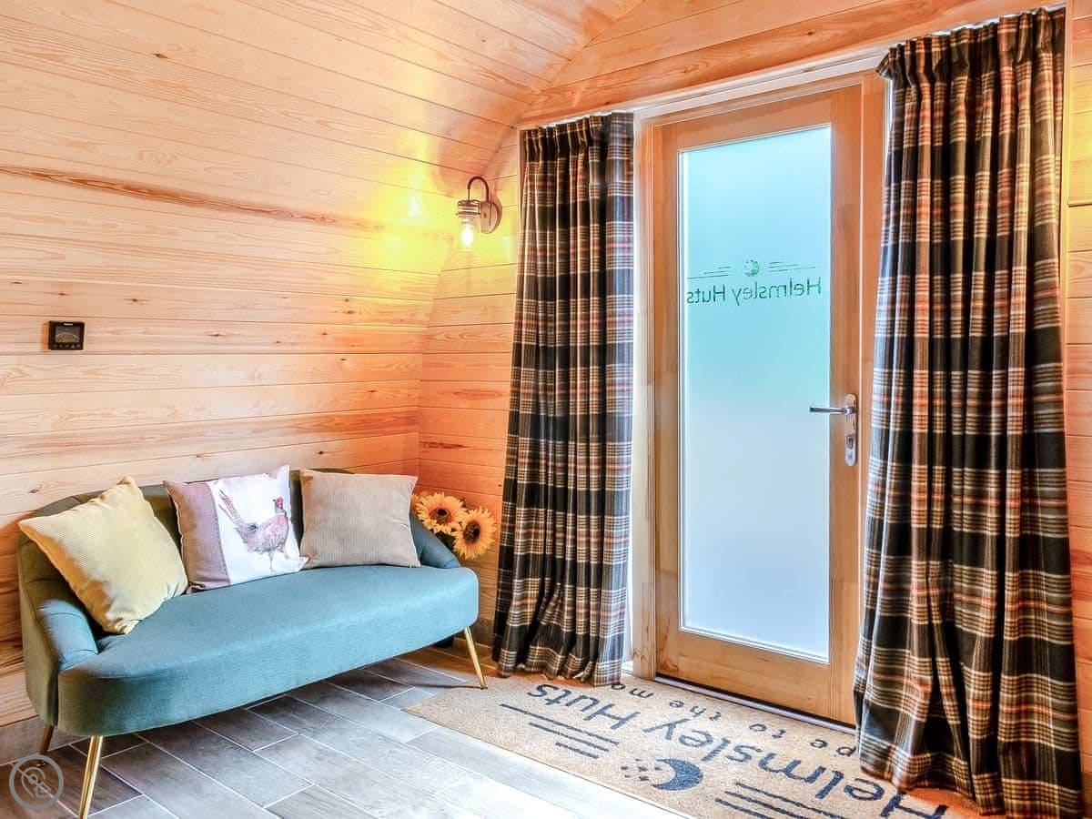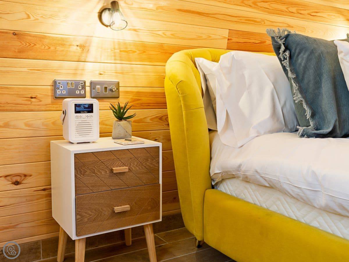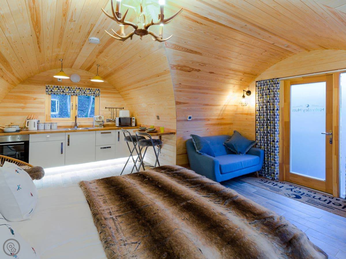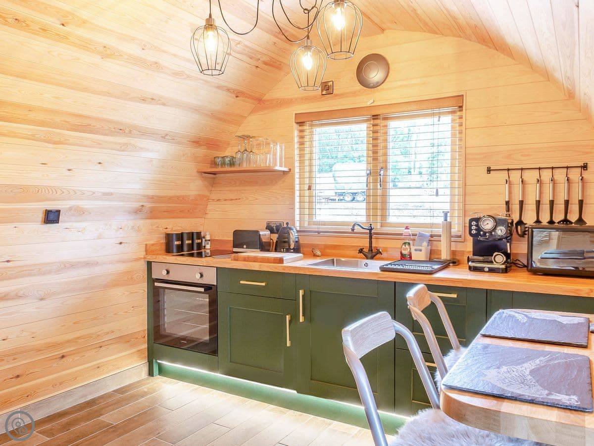 The living area boasts comfortable seating and a pull out 45” Smart TV giving an excellent place to relax after a day exploring the wonderful North York Moors National Park. Over in the stylish kitchen area you can find all the essentials, and you will be able to prepare a meal in no time. With a plush king size bed you are guaranteed a perfect night’s sleep. Adjacent to the open plan area is a gorgeous bathroom complete with rain shower which is just what you need after a day walking and taking in the surrounding countryside. The owners also provide bathrobes, slippers, towels and handmade soaps in the bathroom and the lodge has its’ own seated dressing area with hairdryer, straighteners, and built-in wardrobe.