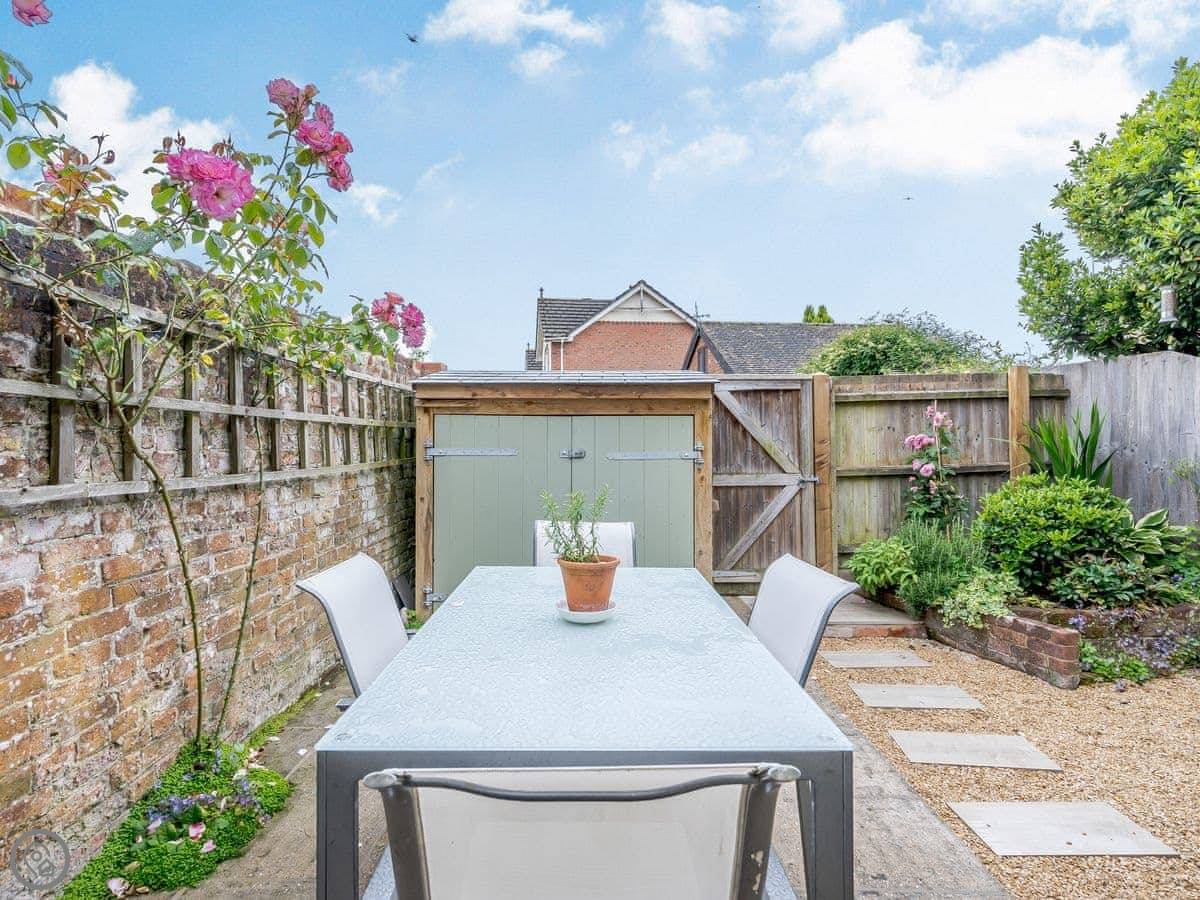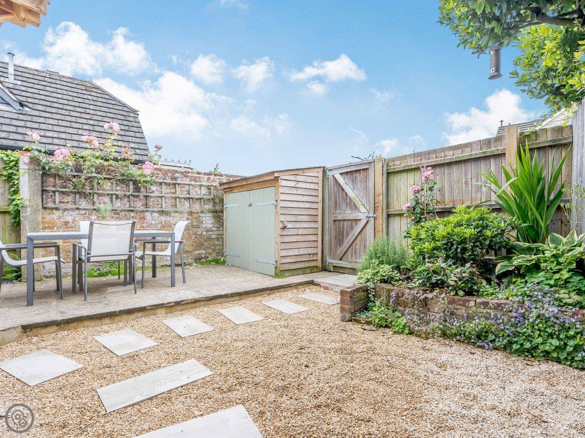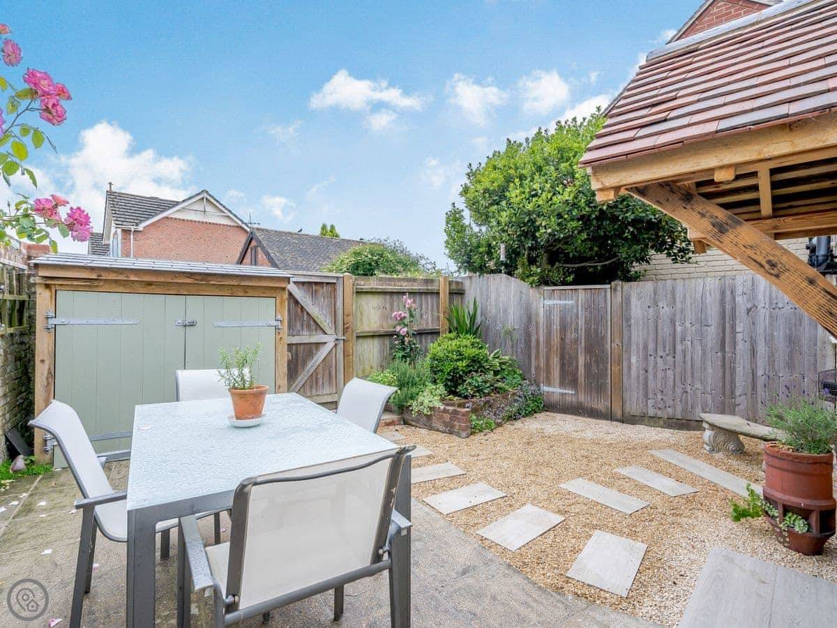 The garden gets the sun all afternoon. There's a table and chairs out there, and a BBQ. You can lock bikes up in a store.