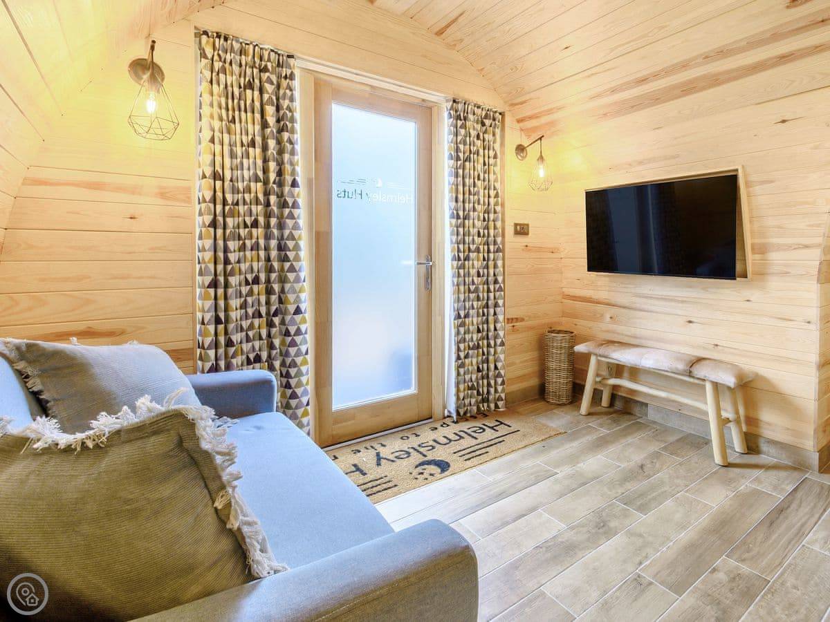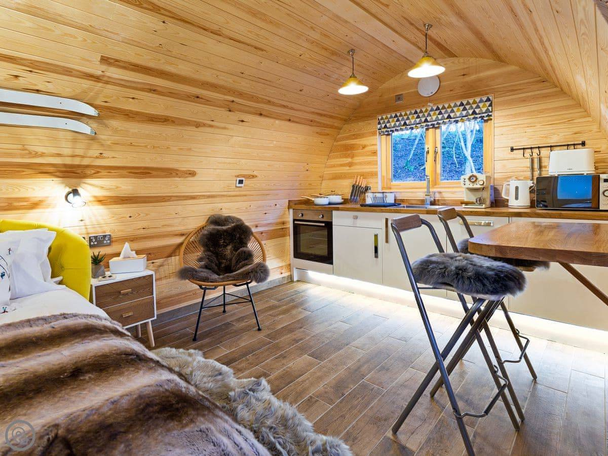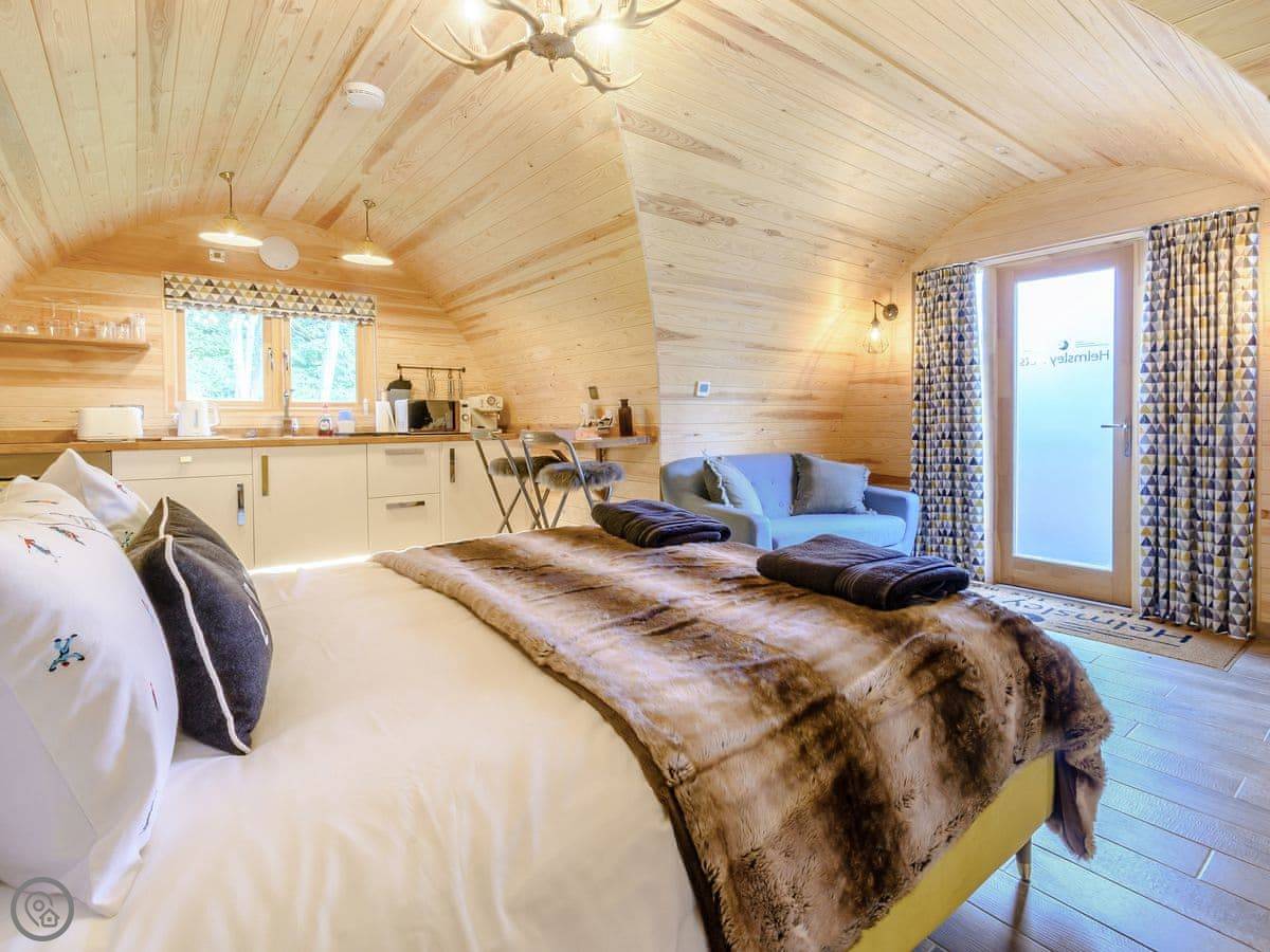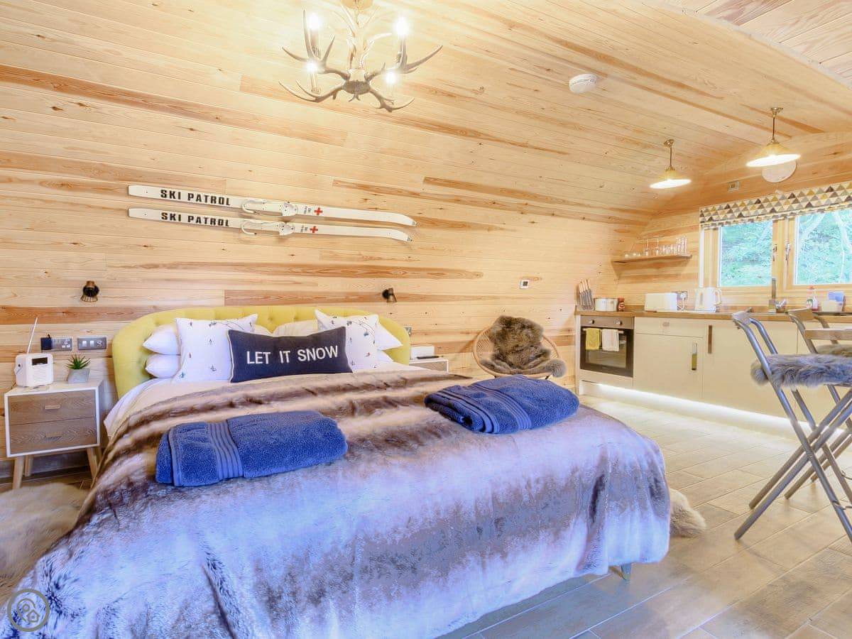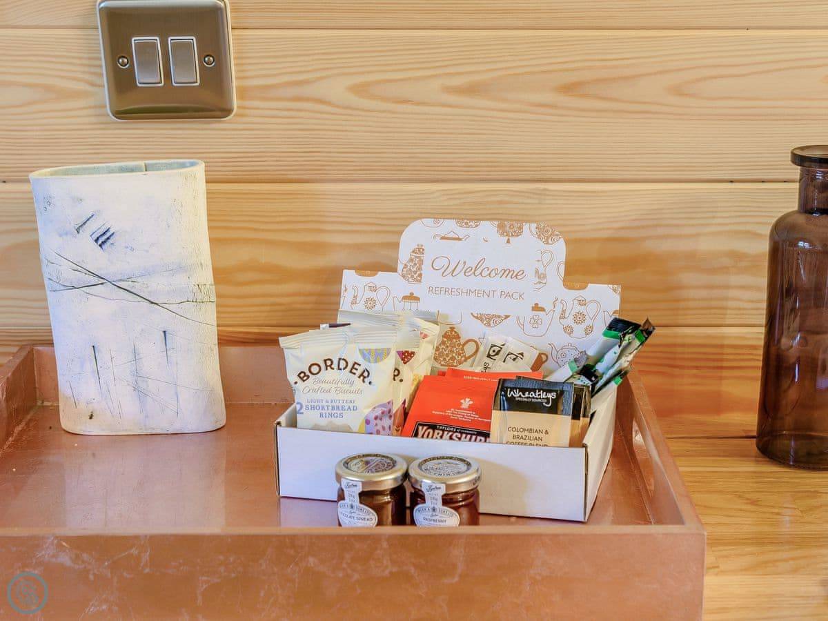 The living area boasts comfortable seating and a pull out 45” Smart TV giving an excellent place to relax after a day exploring the wonderful North York Moors National Park. Over in the stylish kitchen area you can find all the essentials, and you will be able to prepare a meal in no time. With a plush king size bed made with luxury Egyptian cotton you are guaranteed a perfect night’s sleep. Adjacent to the open plan area is a gorgeous bathroom complete with rain shower which is just what you need after a day walking and taking in the surrounding countryside. The owners also provide bathrobes, slippers, towels and handmade soaps in the bathroom and the lodge has its’ own seated dressing area with hairdryer, straighteners, and built-in wardrobe.
